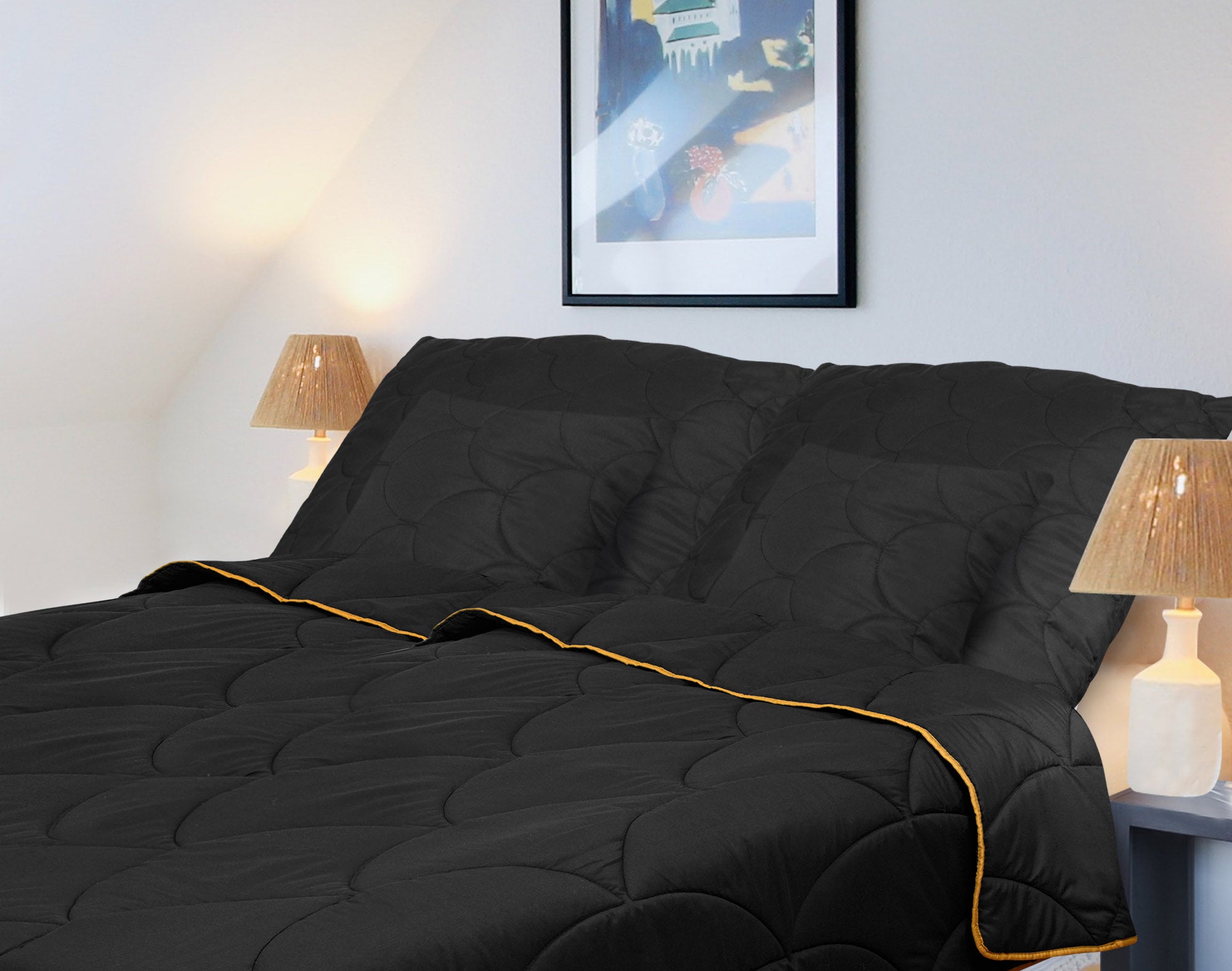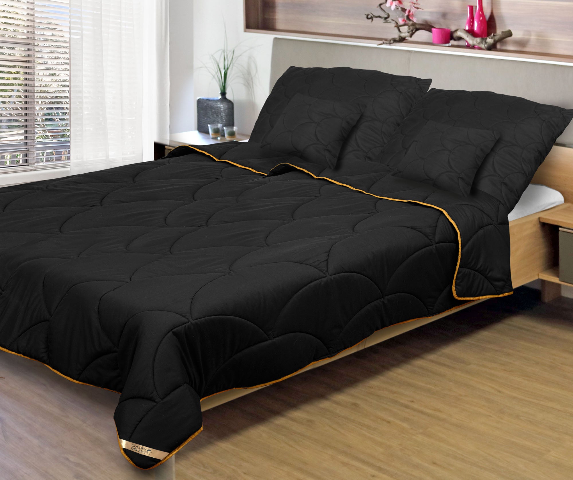 Het tijdloze zwarte design van Golden Dreams voegt een vleugje luxe toe aan uw slaapkamer, en is tegelijkertijd praktisch. De diepe, donkere kleur verbergt vlekken en vermindert de noodzaak voor regelmatig wassen, waardoor uw dekbed en kussens langer fris en in topconditie blijven.