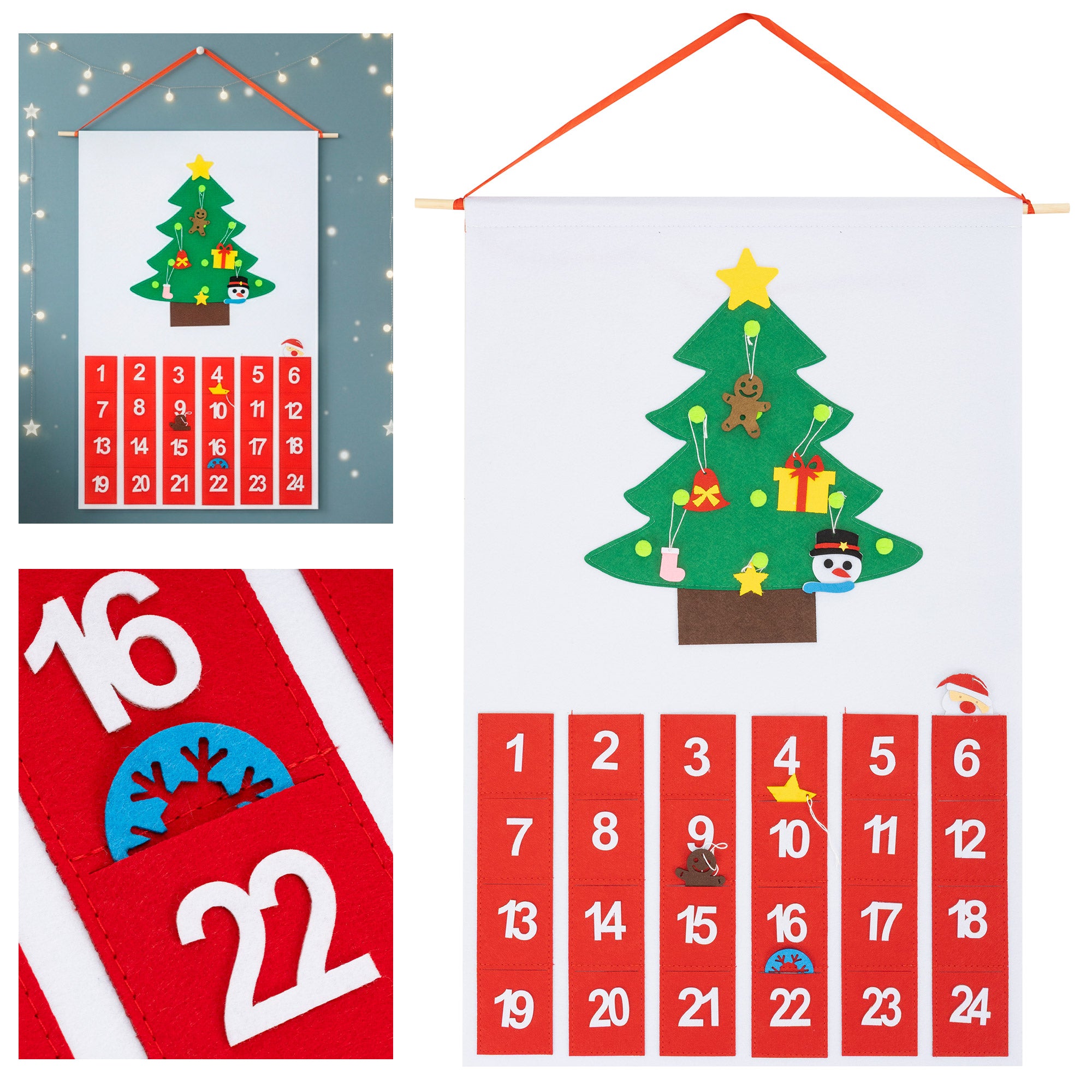 Deze hangende adventskalender van Springos® combineert functionaliteit met een speelse uitstraling. De kalender beschikt over 24 vakjes die kunnen worden gevuld met kleine verrassingen en 10 kleurrijke hangers die als extra decoratie kunnen worden gebruikt of als ornament in de kerstboom. Het ontwerp maakt het eenvoudig om de kalender op te hangen aan een muur, deur of schouw, waardoor hij in vrijwel elke ruimte kan worden geïntegreerd.