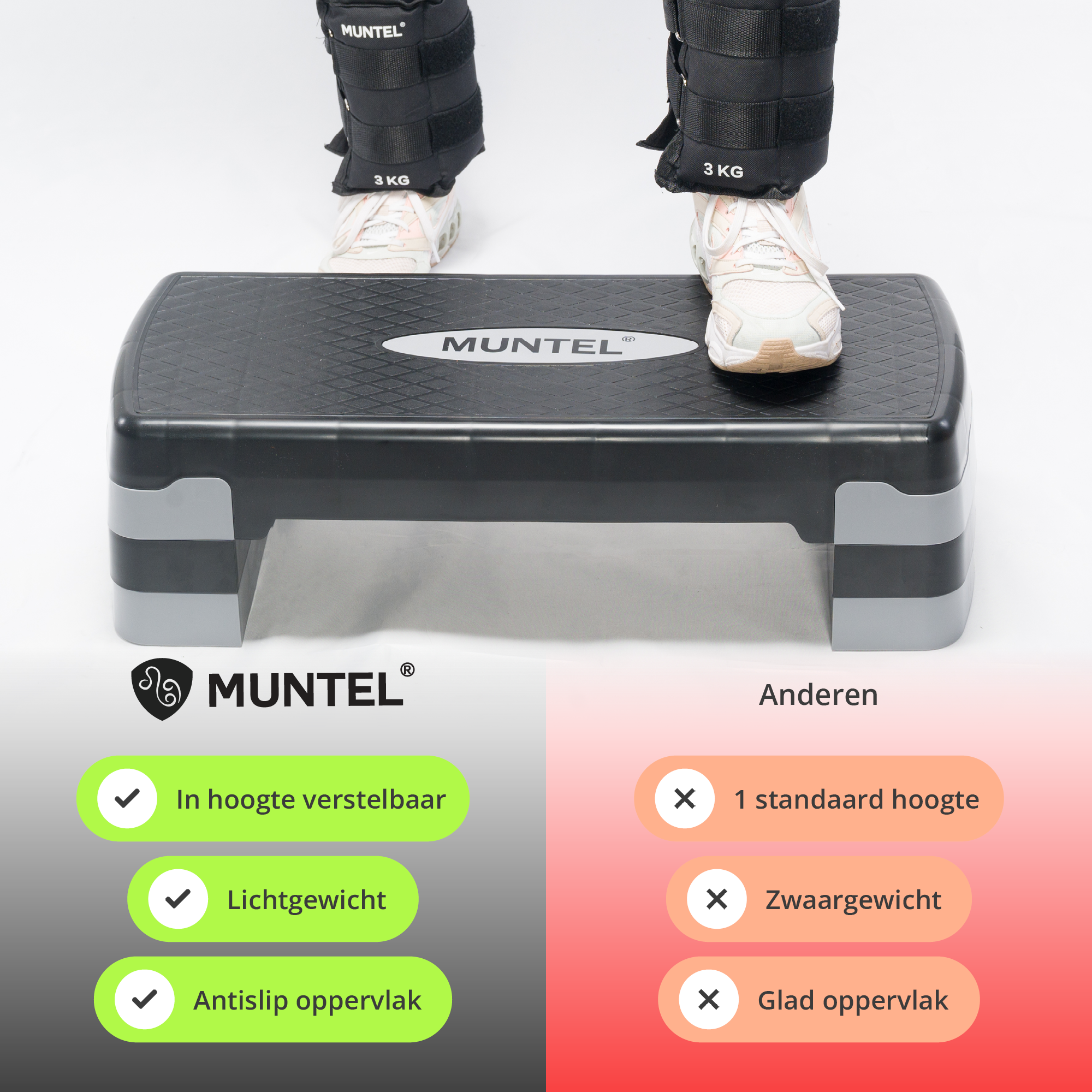 De mogelijkheden zijn eindeloos! Gebruik de stepper voor klassieke aerobics, step-ups, beenverstevigende oefeningen, cardio workouts, en nog veel meer. Of je nu thuis traint, in de sportschool, of met vrienden in de huiskamer, de Muntel® Aerobic Step is jouw perfecte fitnesspartner.
