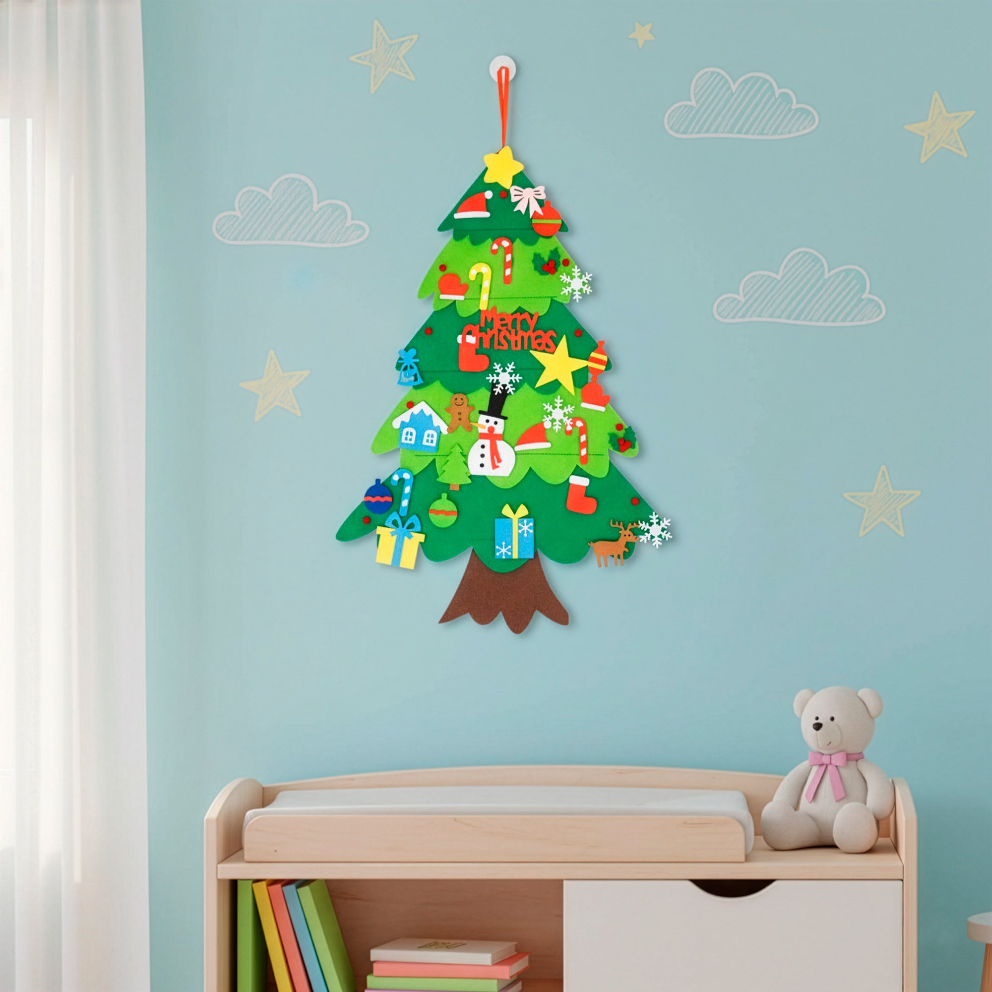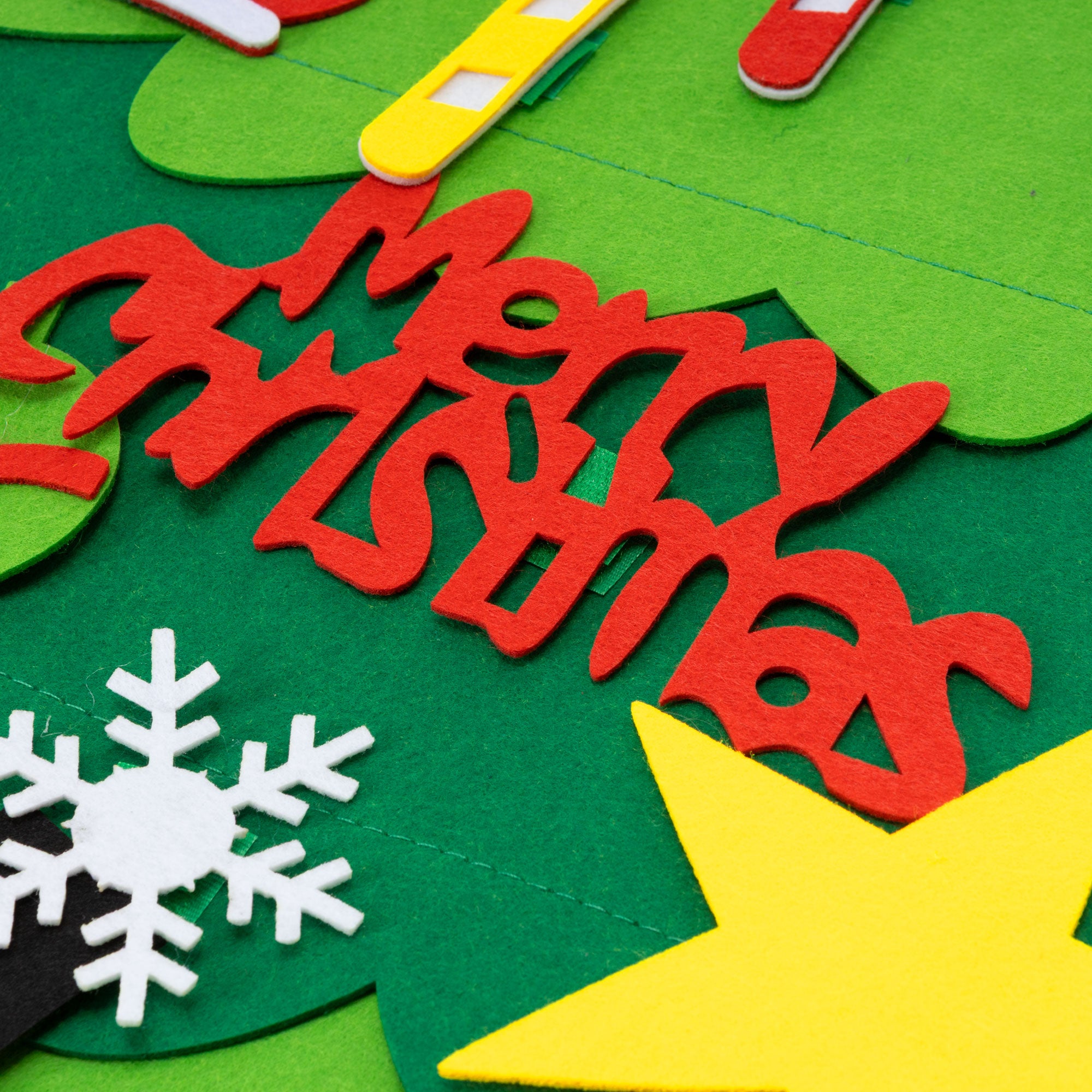 De set wordt geleverd met maar liefst 31 kleurrijke vilten hangers die met klittenband aan de boom bevestigd kunnen worden. De ornamenten bestaan onder andere uit sterren, kerstballen, suikerstokken, cadeautjes, winterfiguren en klassieke kerstsymbolen. Ze kunnen telkens opnieuw worden geplaatst en herschikt, waardoor de boom ideaal is voor creatief plezier en afwisseling tijdens de gehele feestperiode.