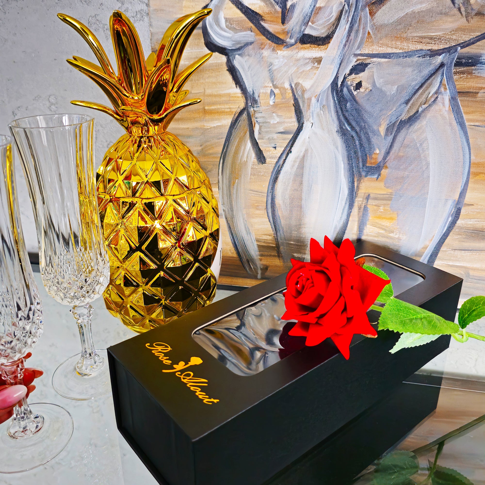 Deze roos is meer dan een bloem. Met zijn elegante uitstraling en blijvende schoonheid staat hij voor een liefde die nooit verwelkt. Elke keer dat je partner ernaar kijkt, zal het herinneren aan de speciale band die jullie delen en hoe waardevol jullie relatie is.