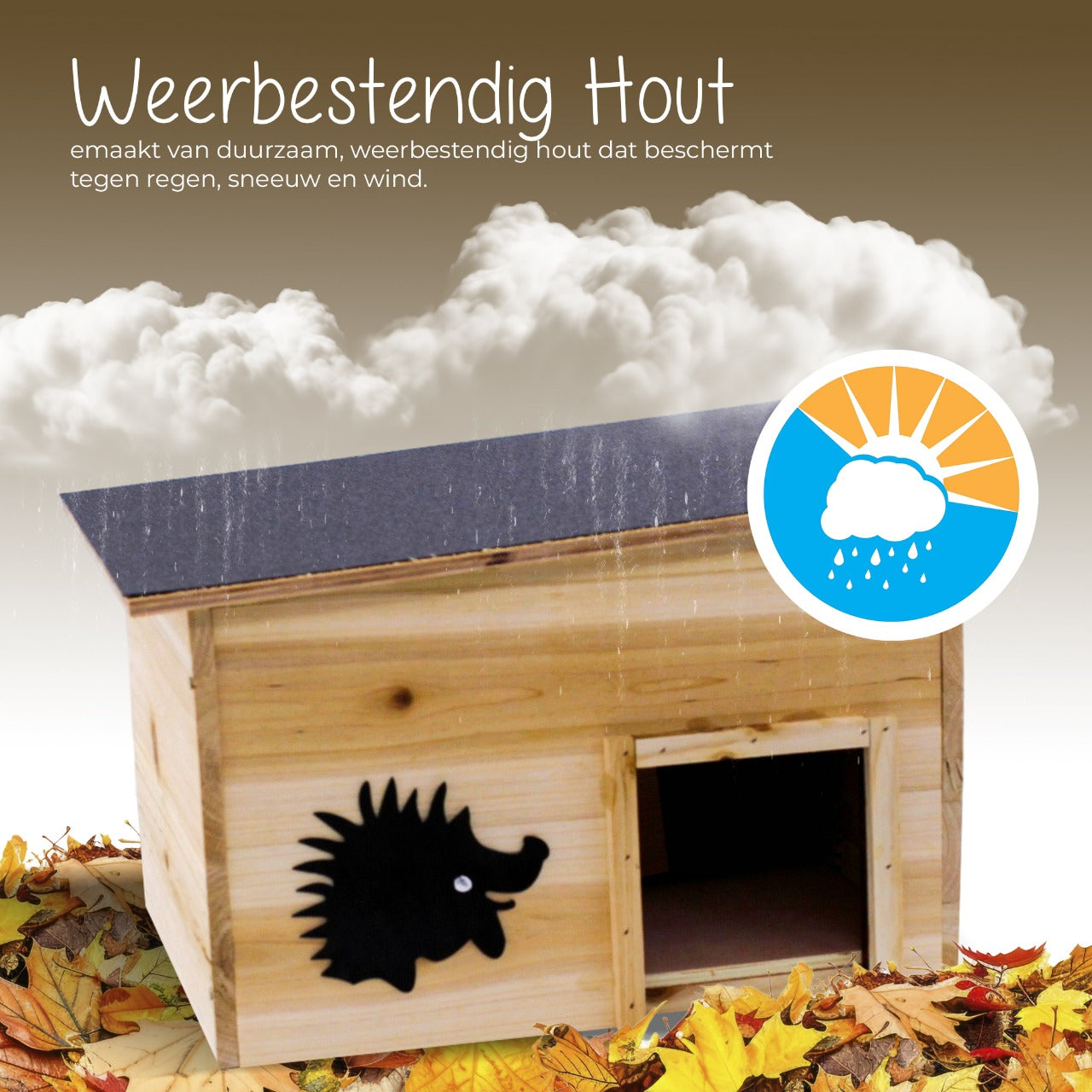 Het egelhuis is gemaakt uit hoogwaardig hout, het hout is bestand tegen diverse weersomstandigheden, waaronder regen, wind en sneeuw. Dankzij de eigenschappen van het materiaal is het egelhuis goed geïsoleerd, wat betekent dat de egel beschermd is tegen zowel kou als vochtigheid. Dit is van cruciaal belang, vooral in de wintermaanden wanneer de egels hun winterslaap houden.