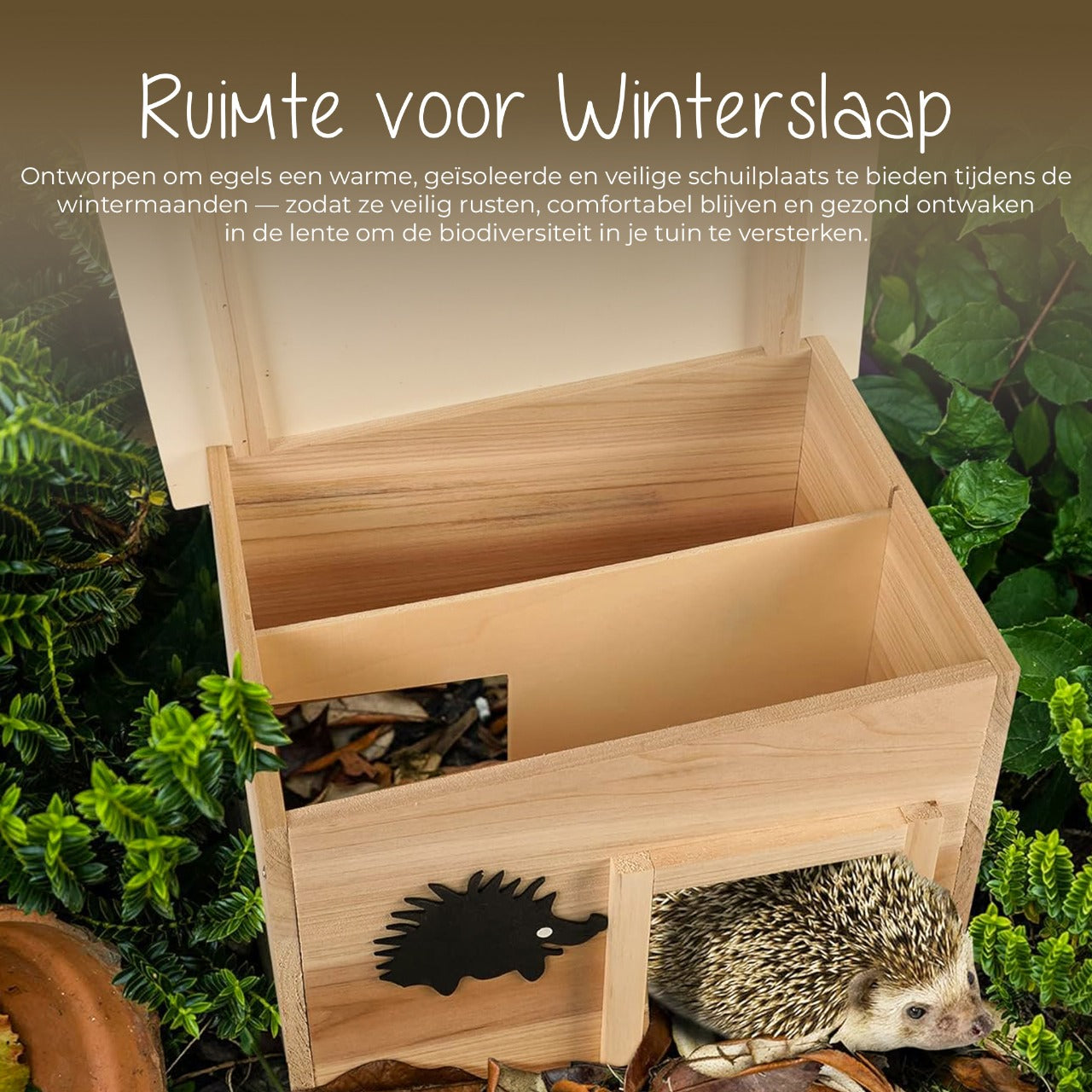 Het egelhuis is heel geschikt voor de winterslaap van de egel. In de wintermaanden trekt de egel zich vaak terug om te rusten en energie op te slaan voor het voorjaar. Dit egelhuis biedt de perfecte omstandigheden voor een succesvolle winterslaap, met voldoende ruimte en isolatie om de egel warm en comfortabel te houden. Dit verhoogt de kans dat de egel gezond het voorjaar ingaat en bijdraagt aan de biodiversiteit in je tuin.