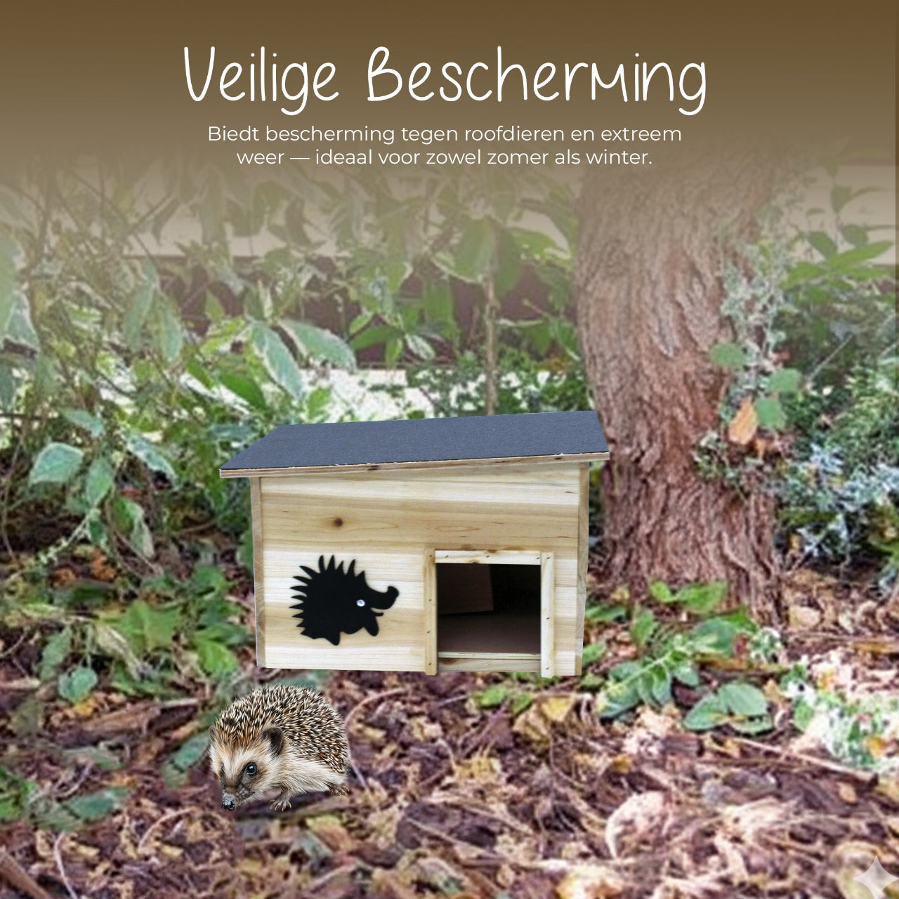 Het ontwerp van het egelhuis zorgt ervoor dat het een ideale bescherming biedt tegen zowel het gure weer als mogelijke roofdieren. In de winter functioneert het huis als een veilige haven voor de egel om in te schuilen, terwijl het in de zomer een rustplek is om te ontsnappen aan de hitte of regen.