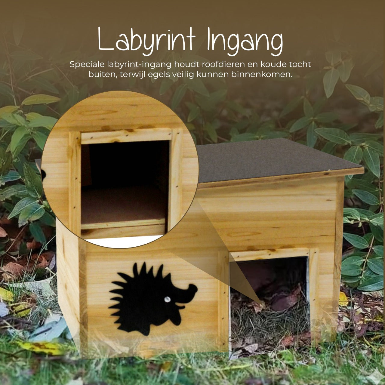 Het egelhuis beschikt over een speciale labyrint-ingang, die niet alleen voorkomt dat roofdieren toegang krijgen tot het huis, maar ook bescherming biedt tegen het slechte weer. Het labyrint creëert een barrière die helpt om tocht en kou buiten te houden, terwijl de egel tegelijkertijd een beschermde toegang heeft tot het huis. Deze ingang zorgt ervoor dat je tuinvriend rustig en beschermd kan slapen zonder zich zorgen te maken over externe bedreigingen.