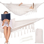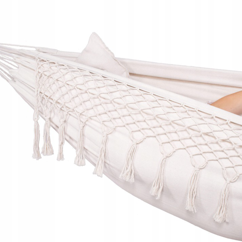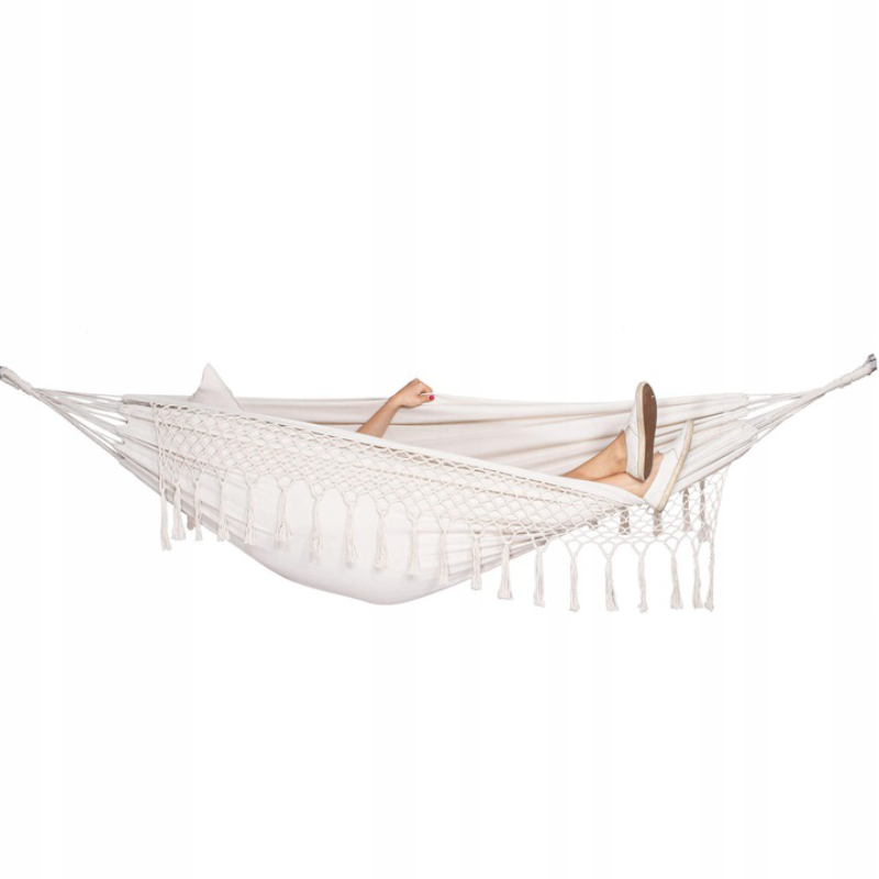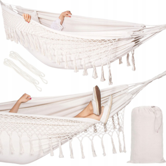De hangmat van Springos is perfect voor iedereen die waarde hecht aan kwaliteit en zorgvuldige afwerking. Perfect voor ontspanning en rust op warme, zonnige dagen. Het grote voordeel is dat de hangmat gemaakt is van natuurlijke materialen, waaronder katoen, wat een maximale luchtdoorlaatbaarheid garandeert. De lichte en duurzame materialen passen zich perfect aan het lichaam aan, waardoor de gebruiker volledig kan relaxen. Lekker volle polle genieten!