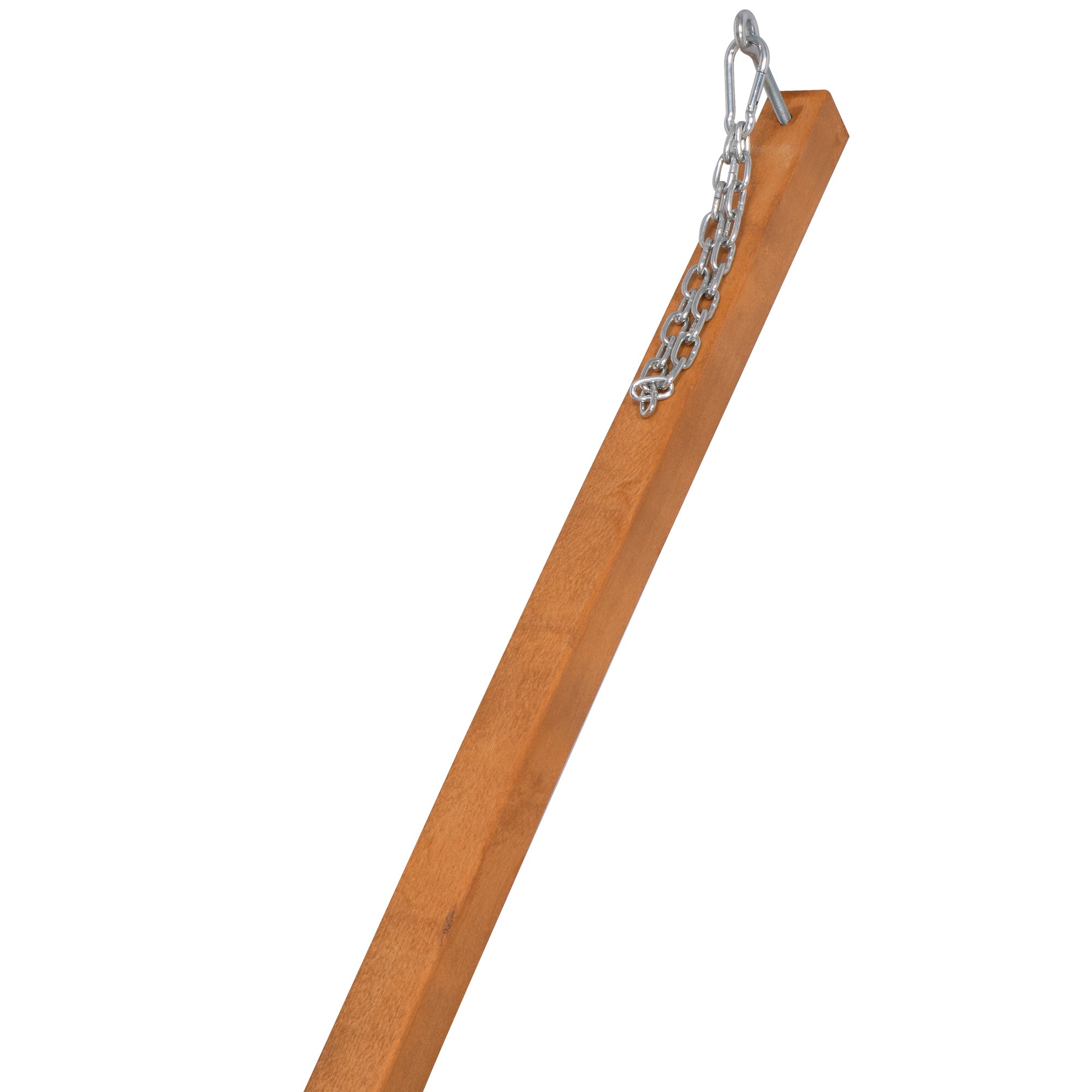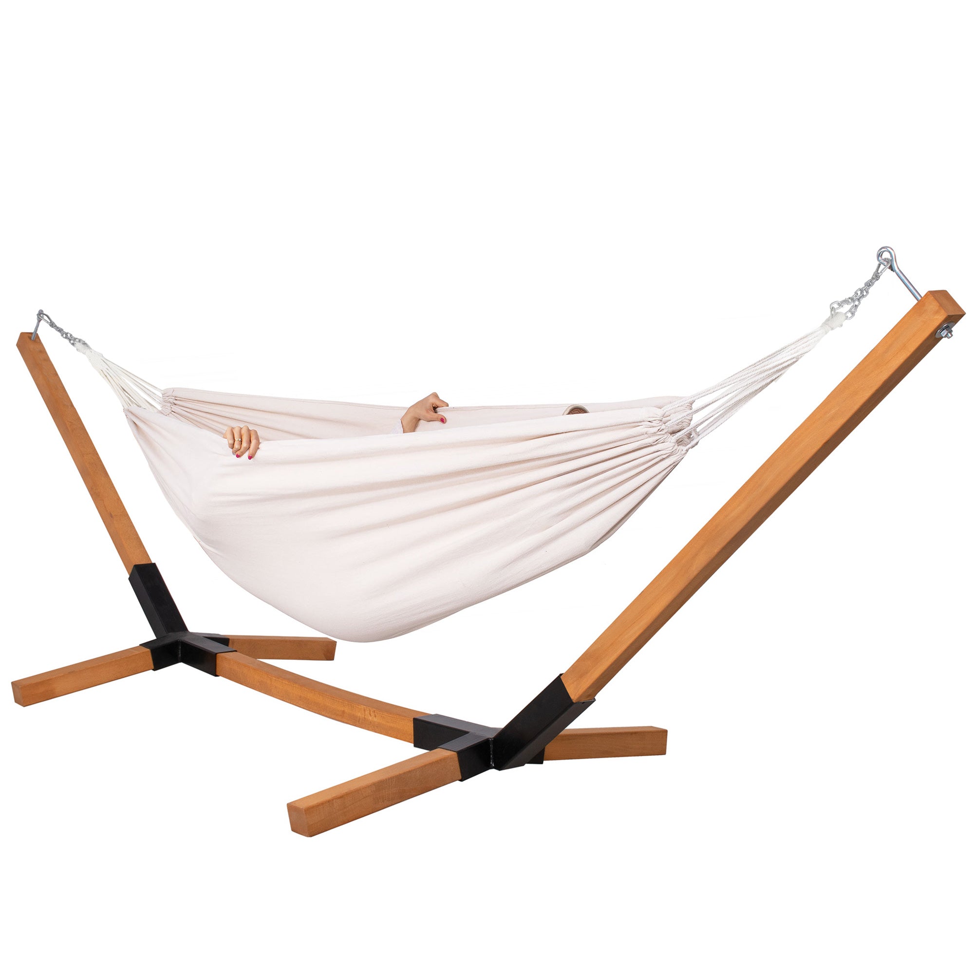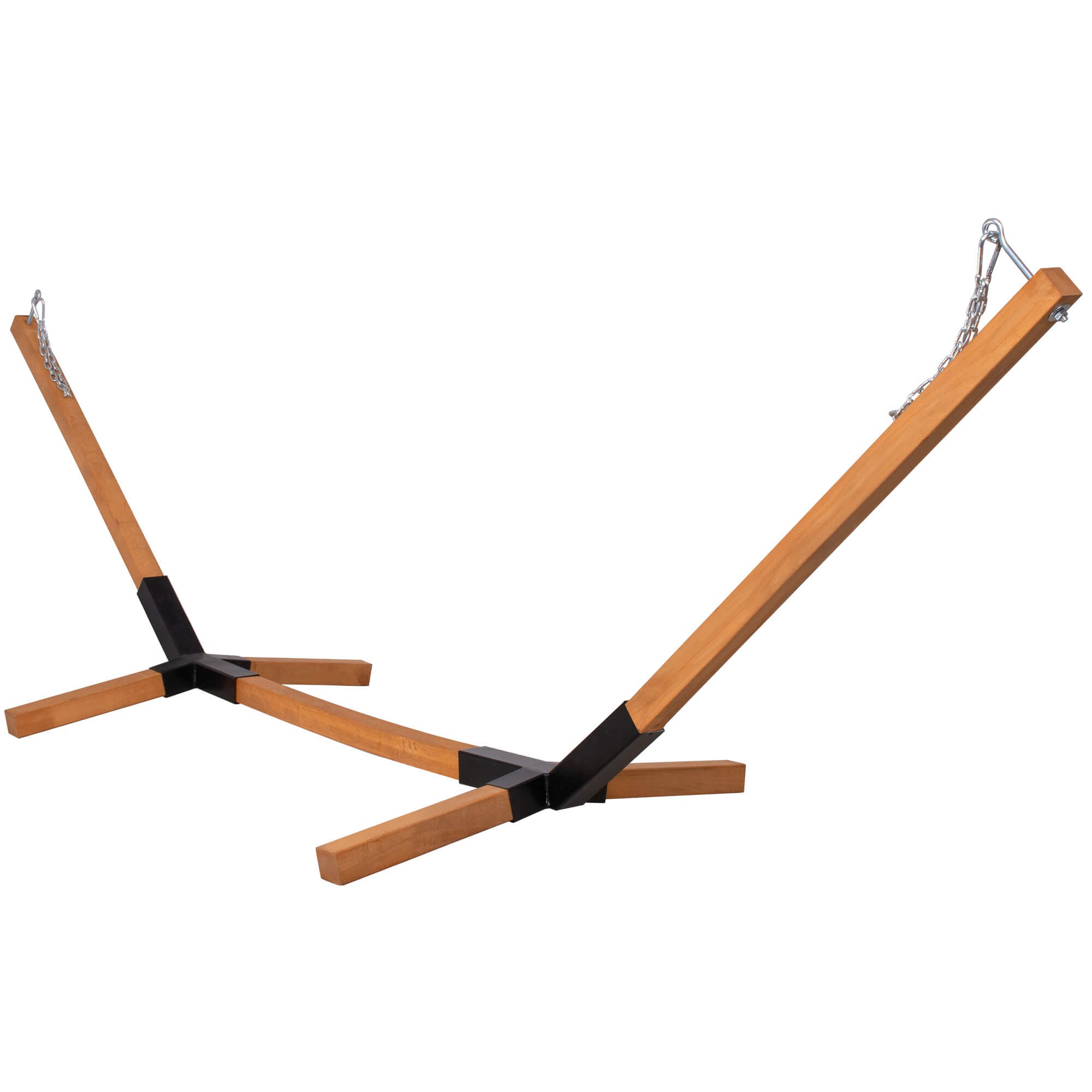 De hangmatstandaard is gemaakt van een combinatie van sterk staal en duurzaam hout. Dankzij het robuuste ontwerp staat hij stevig op elke ondergrond – van gras tot terras. Met de bijgeleverde kettingen en karabijnhaken kun je de ophanging eenvoudig aanpassen aan de lengte van jouw hangmat. Zo geniet je altijd van de perfecte spanning en het hoogste comfort.