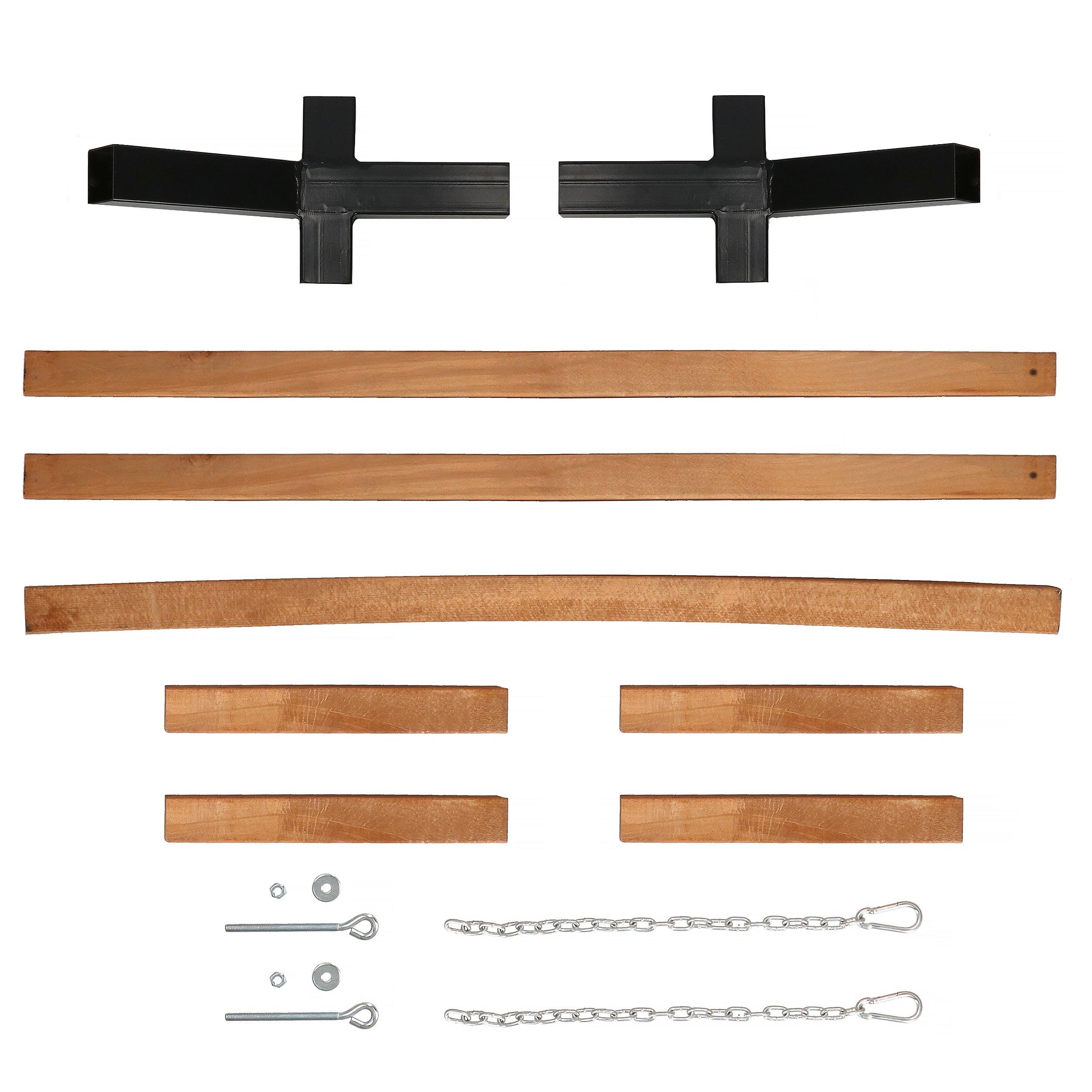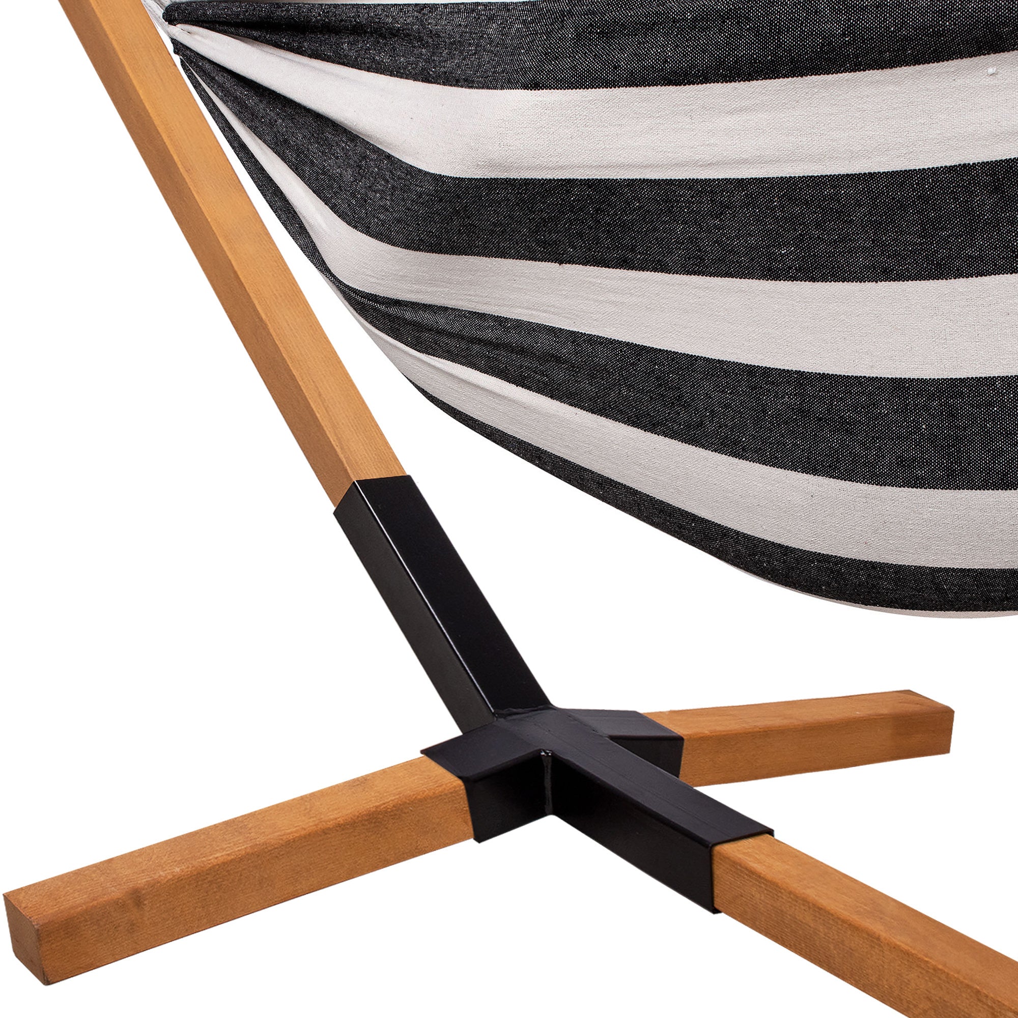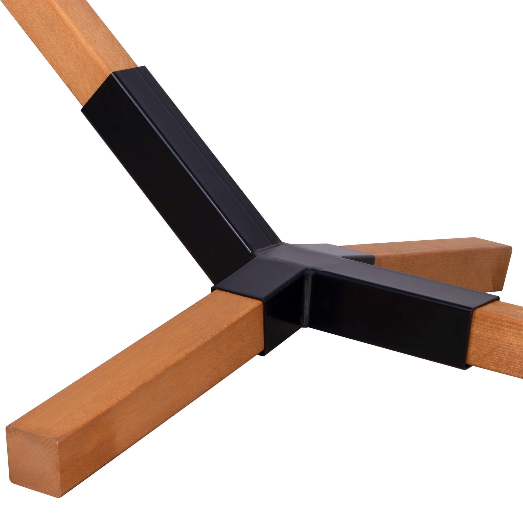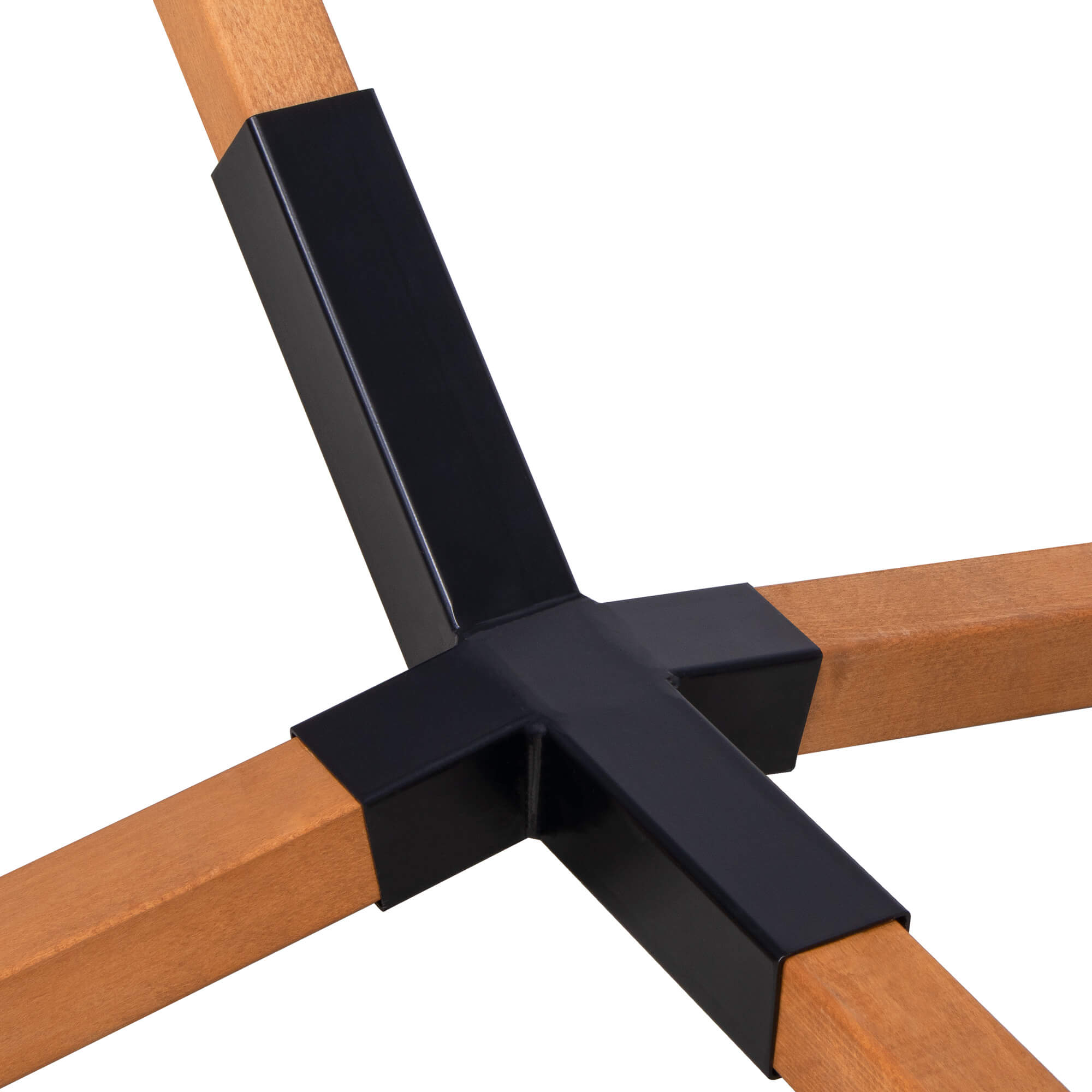 De hangmatstandaard is gemaakt van een combinatie van sterk staal en duurzaam hout. Dankzij het robuuste ontwerp staat hij stevig op elke ondergrond – van gras tot terras. Met de bijgeleverde kettingen en karabijnhaken kun je de ophanging eenvoudig aanpassen aan de lengte van jouw hangmat. Zo geniet je altijd van de perfecte spanning en het hoogste comfort.