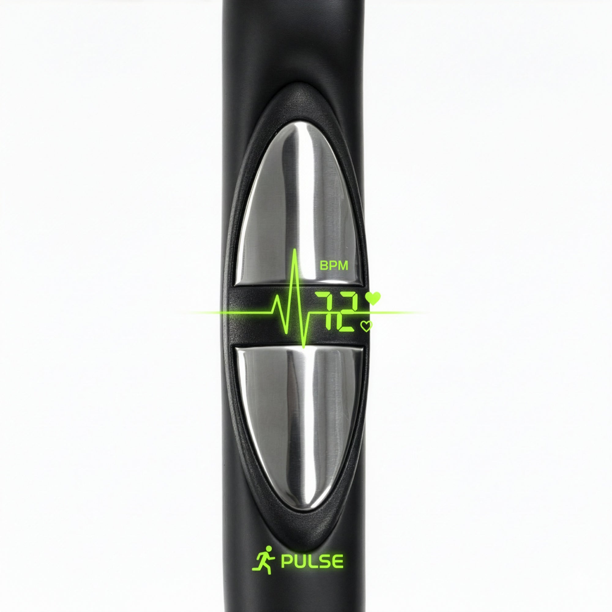 De geïntegreerde trainingscomputer toont alle belangrijke trainingsgegevens zoals tijd, snelheid, afstand, verbrande calorieën, hartslag en de ODO-functie (totale afgelegde afstand). Met de MODE-knop schakel je eenvoudig tussen de verschillende parameters of reset je de training. De hartslagsensoren in het stuur helpen je om gecontroleerd en doelgericht te trainen.