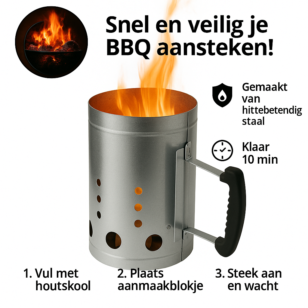 Steek je kolen snel en effectief aan zonder te hoeven waaien of blazen, en zonder gebruik van gevaarlijke aanmaakmiddelen zoals spiritus. De stevige handgreep met hittebescherming biedt een veilige manier om de starter te vullen nadat de kolen zijn aangestoken.