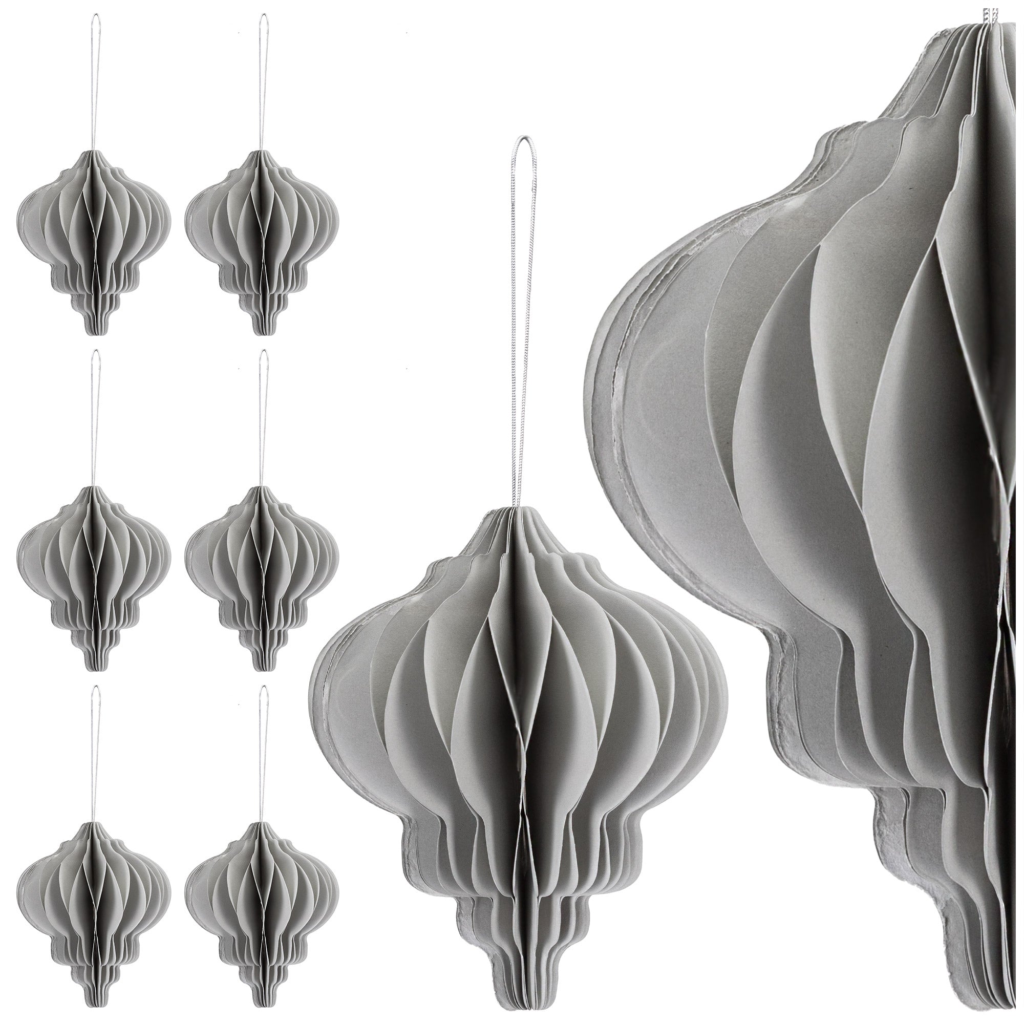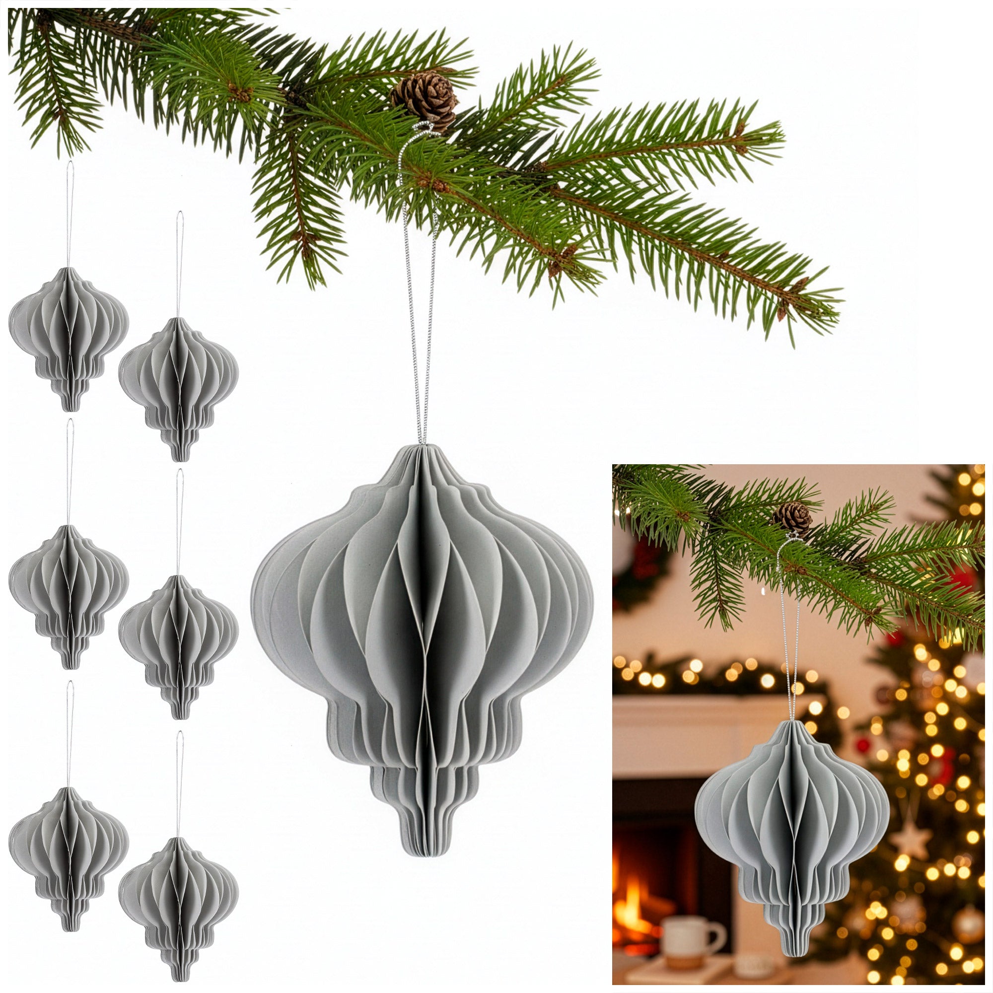 Moderne papieren kerstballen onderscheiden zich door hun combinatie van esthetiek en functionaliteit. De driedimensionale structuur geeft elke ruimte een moderne uitstraling, terwijl de neutrale kleur uitstekend samengaat met goud, zilver en wit voor een elegante kerstcompositie. Dankzij de hoge afwerkingskwaliteit van Springos tonen de ornamenten precisie en duurzaamheid, waardoor ze jarenlang gebruikt kunnen worden. Ze lenen zich bovendien perfect voor raam- en deurd ecoraties, waardoor een stijlvol geheel ontstaat in het hele interieur.