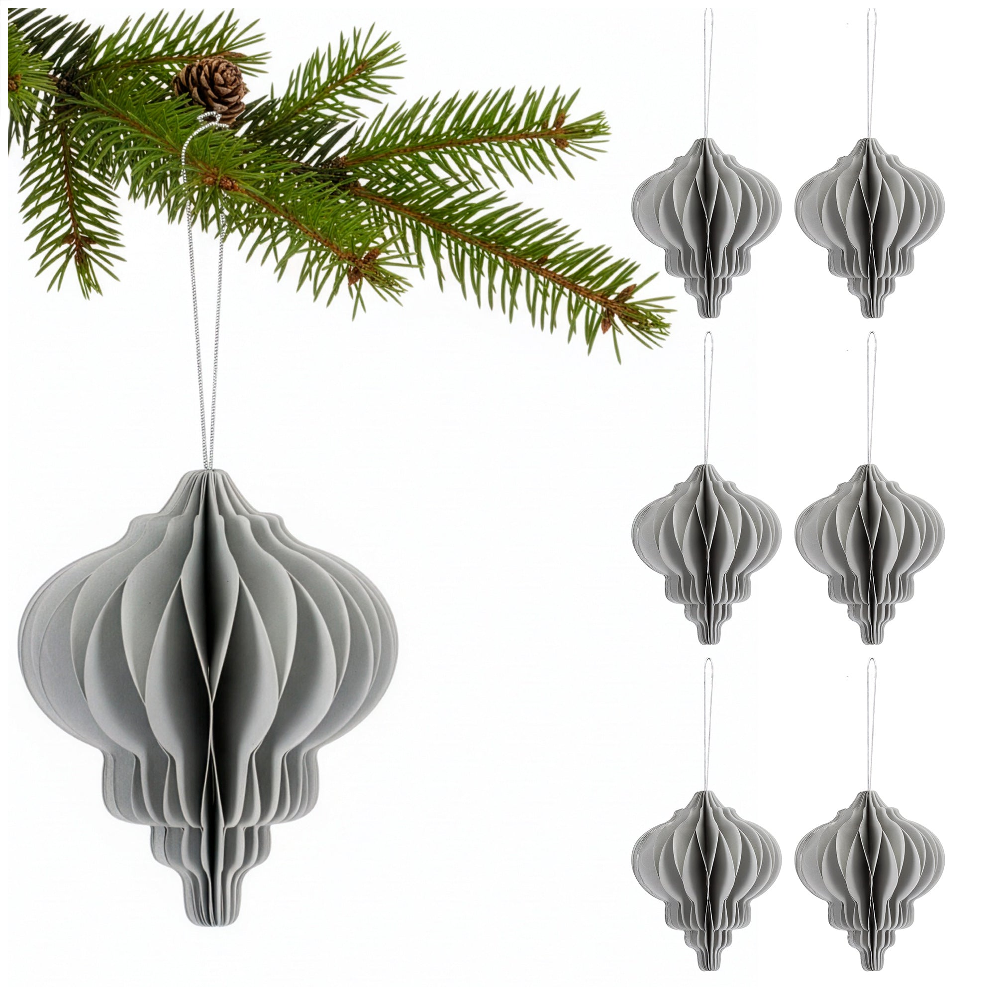 Deze grijze papieren kerstballen van Springos zijn een stijlvolle keuze voor iedereen die houdt van minimalisme en modern design. Dankzij het hoogwaardige, stevige papier vormen ze een veilig en lichtgewicht alternatief voor traditionele glazen kerstballen. De subtiele kleur brengt rust, verfijning en elegantie in elk interieur en combineert prachtig met natuurlijke decoraties, kerstgroen of metallic accenten.