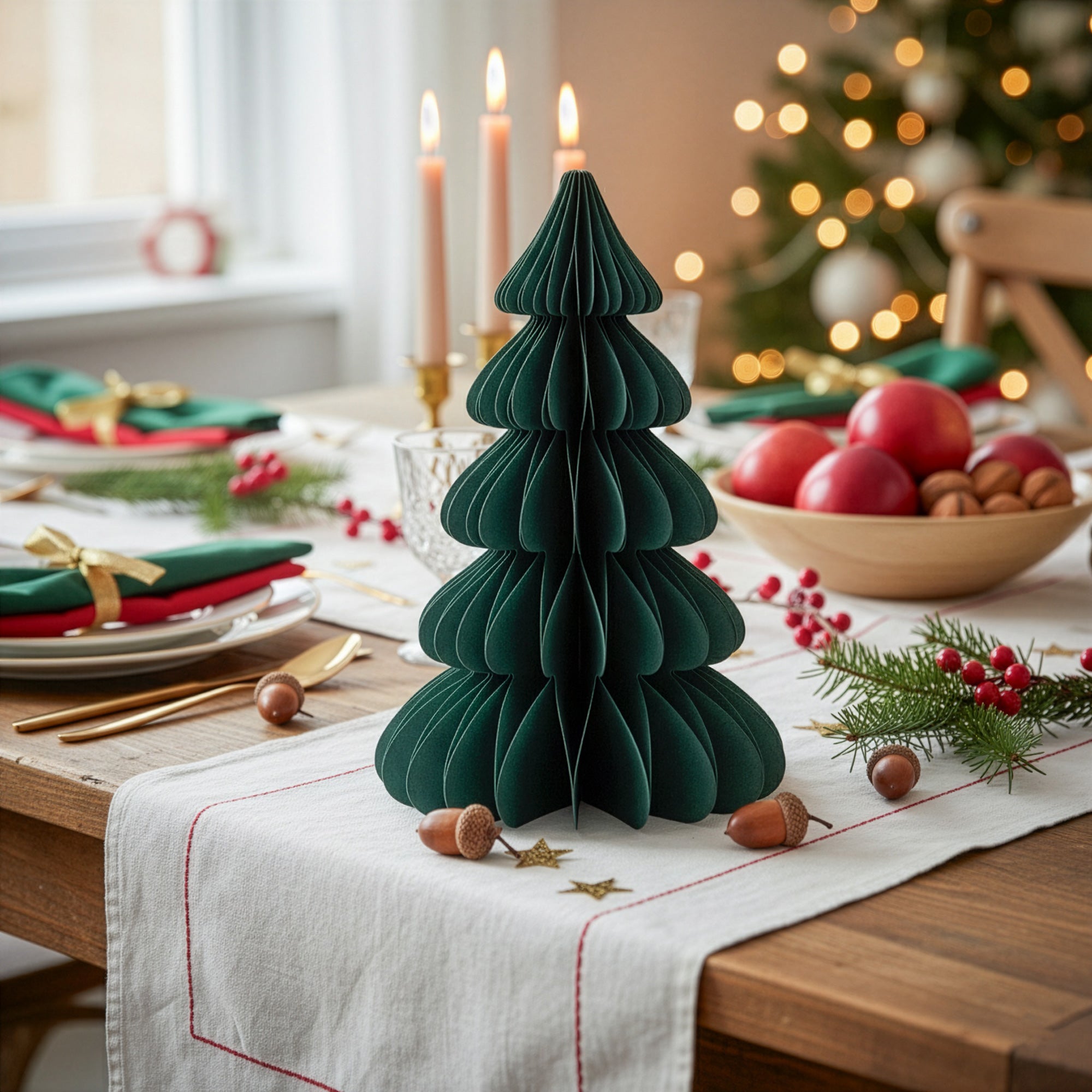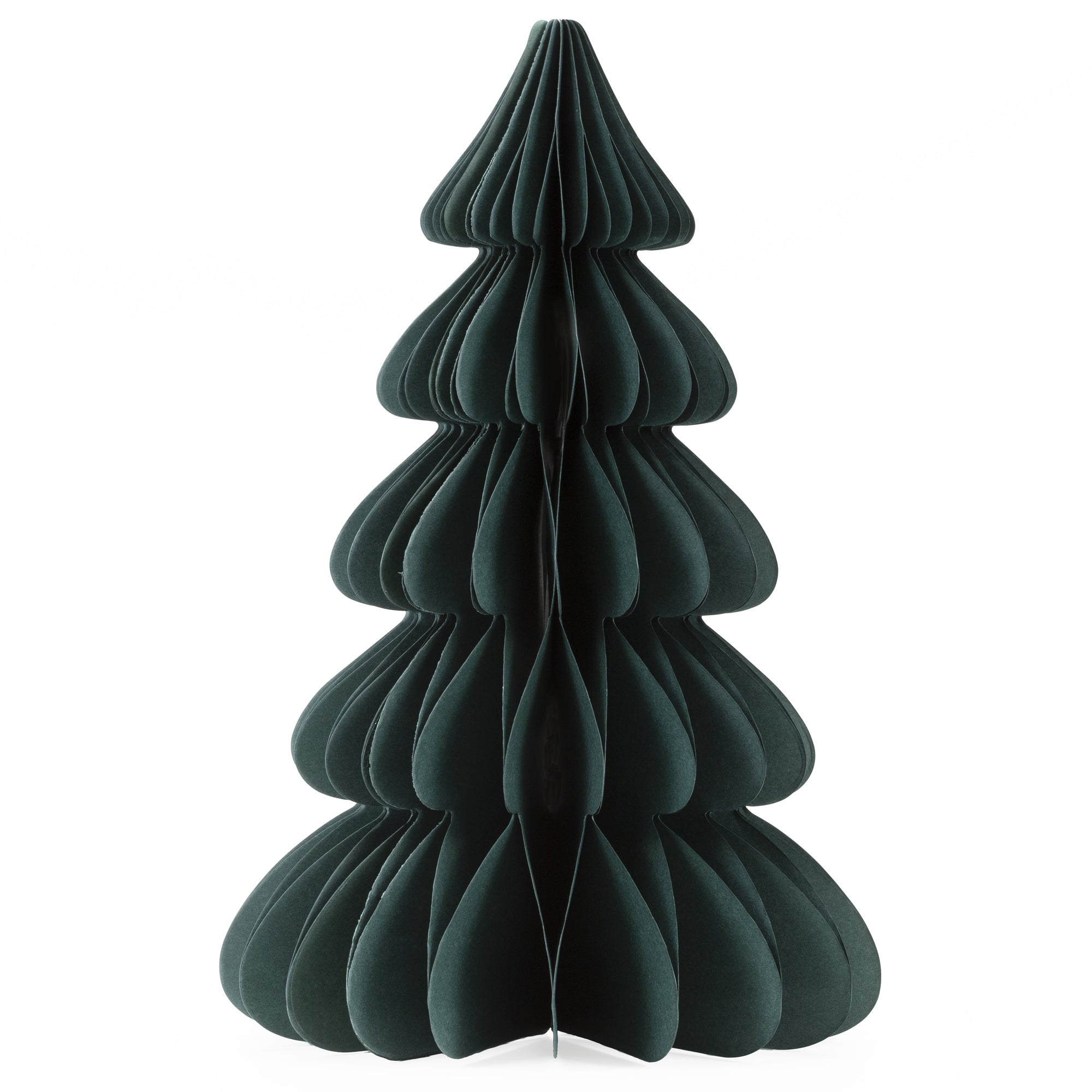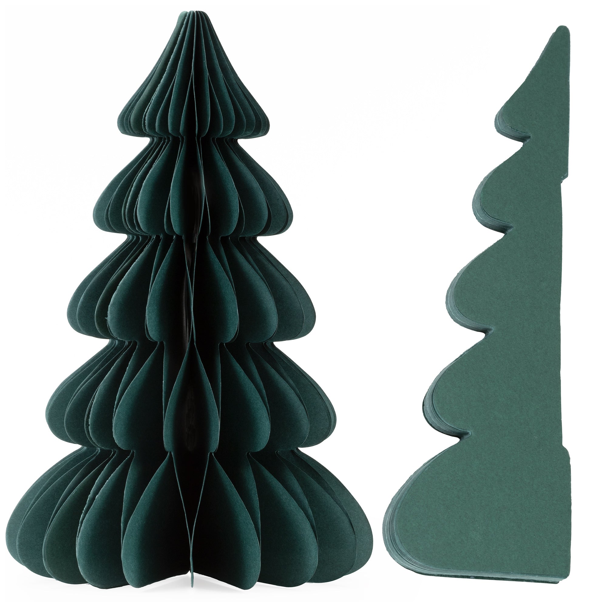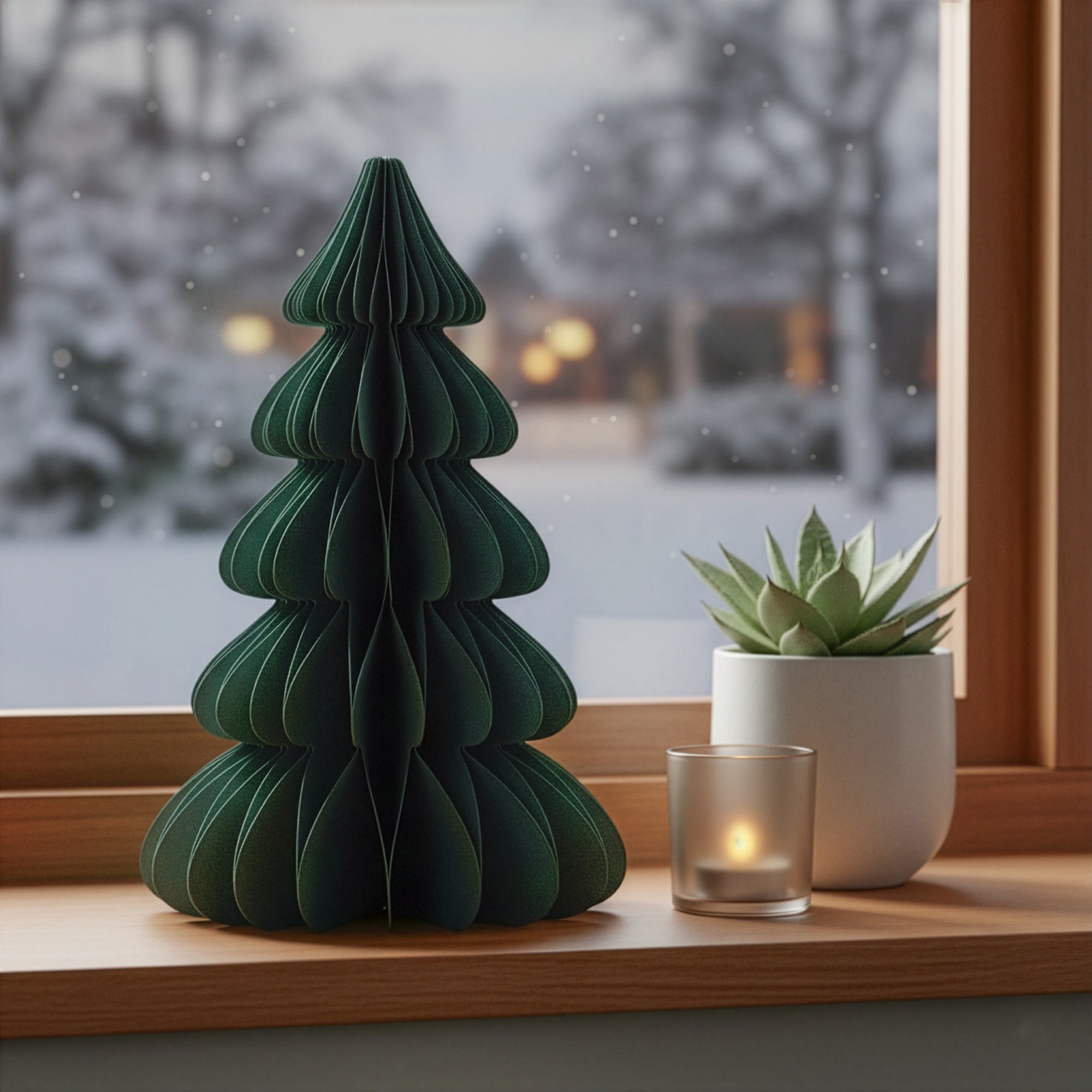 Deze papieren kerstboom is een stijlvolle en moderne kerstversiering die eenvoud combineert met elegant design. De driedimensionale accordeonvorm geeft de boom een lichte en verfijnde uitstraling, terwijl het hoogwaardige papier zorgt voor stabiliteit en een nette afwerking. De decoratie komt schitterend tot zijn recht als zelfstandig element, maar kan net zo goed worden gecombineerd met andere feestelijke accessoires.