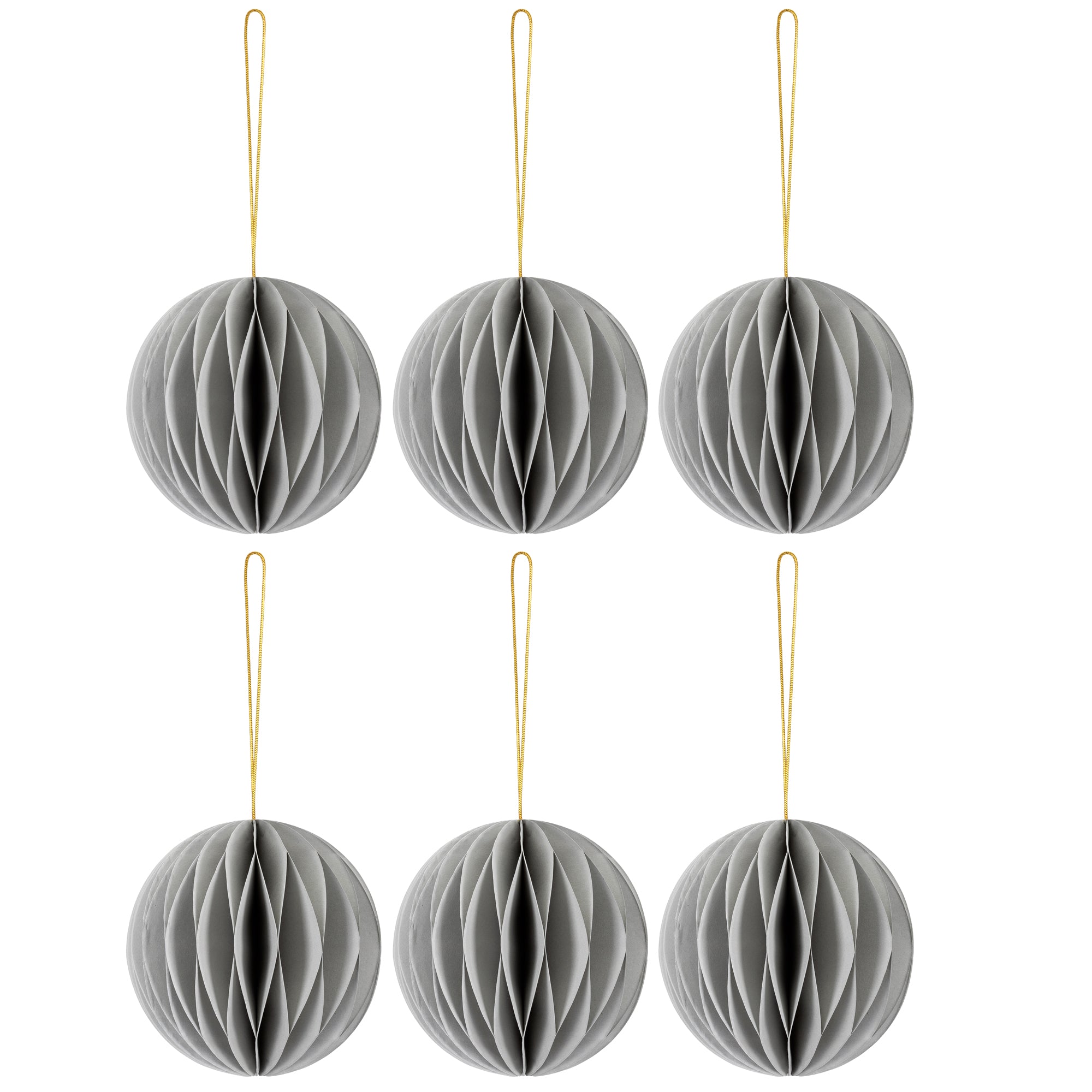 Breng moderne finesse en lichte elegantie in uw kerstdecoratie met deze set van zes grijze papieren kerstballen van 8 cm. Dankzij het opvouwbare ontwerp ontvouwen de ornamenten zich tot perfect ronde bollen die direct volume en diepte aan uw kerstboom toevoegen. De zachte grijstint vormt een stijlvol contrast met groene dennentakken en combineert prachtig met goud, wit en zilver voor een sfeervol, harmonieus arrangement.
