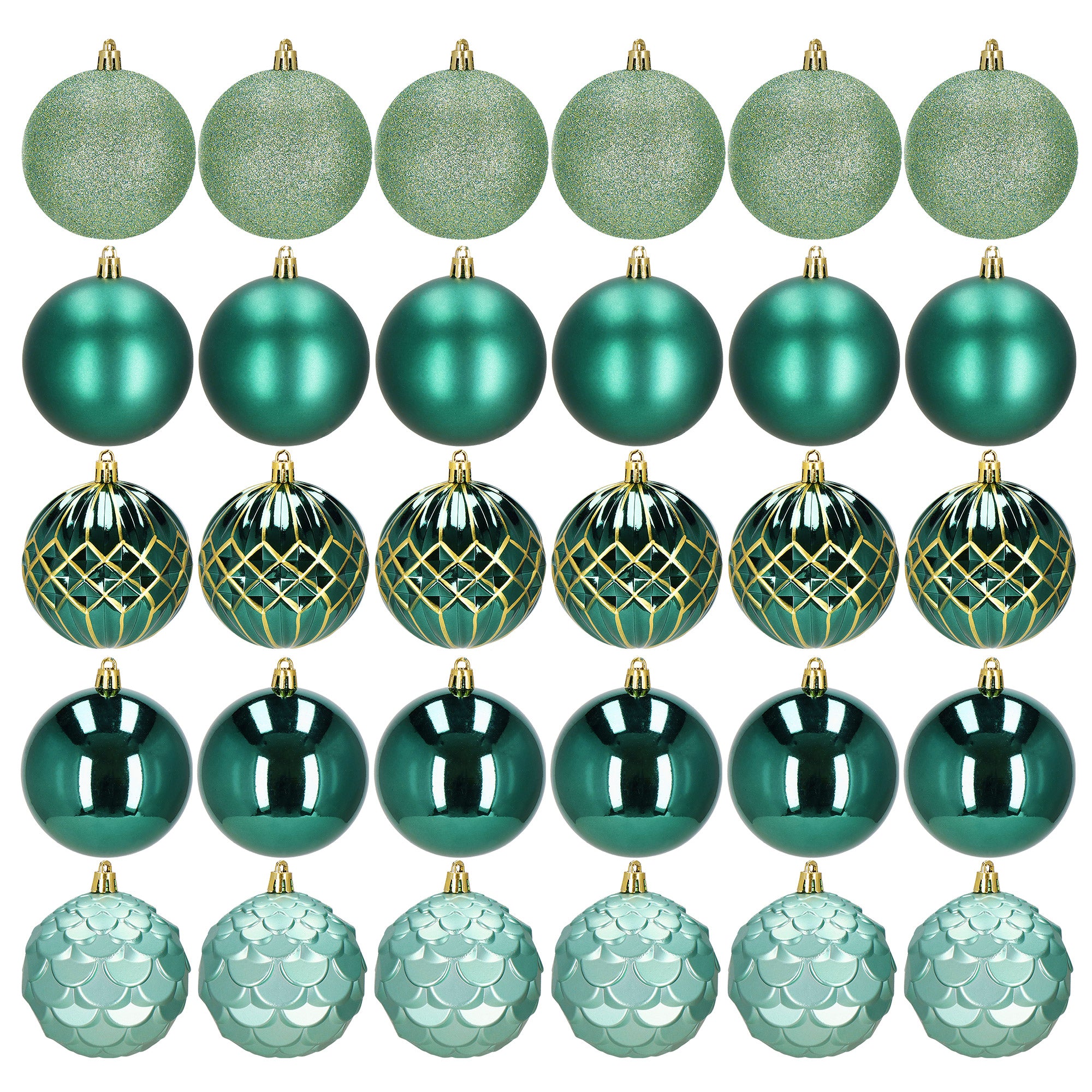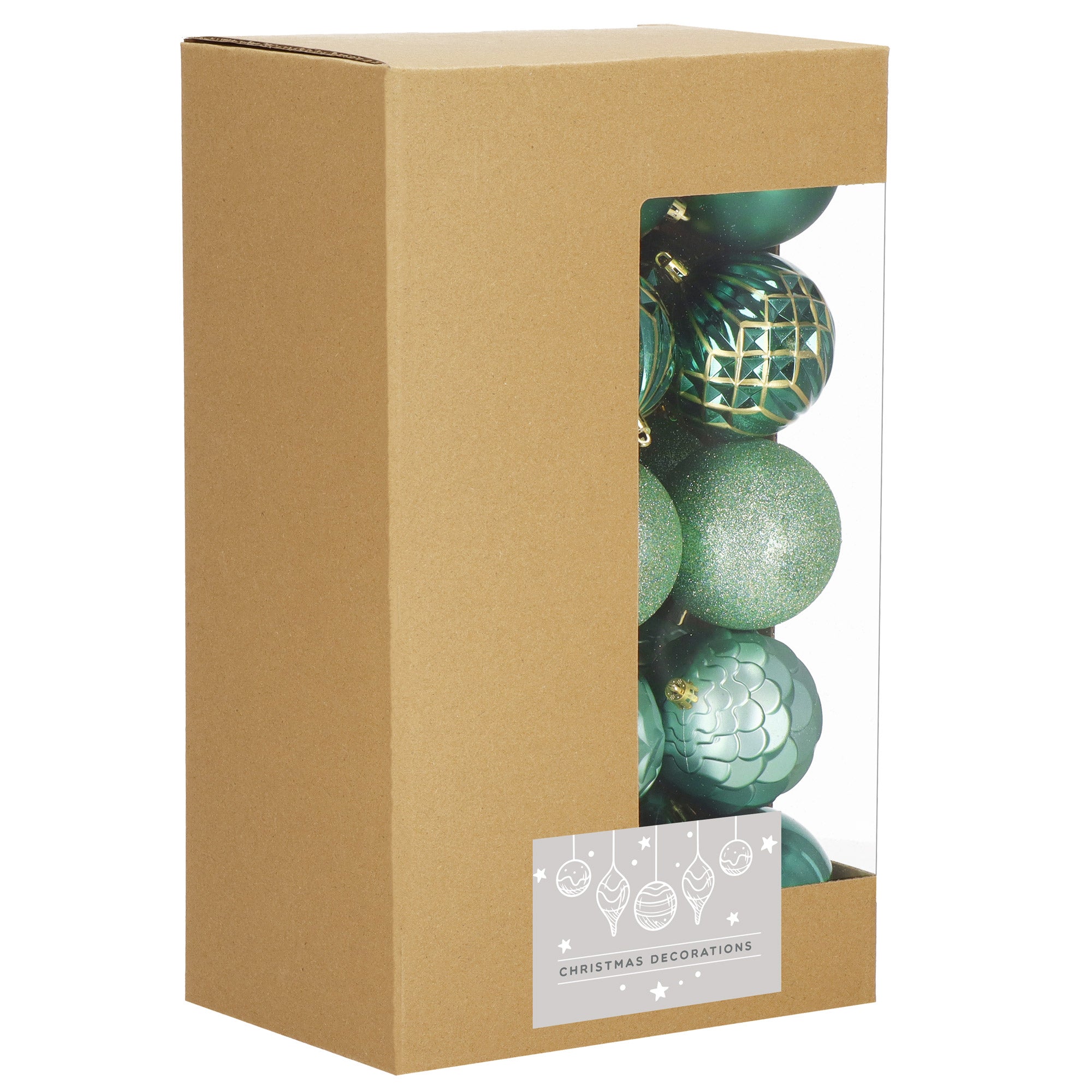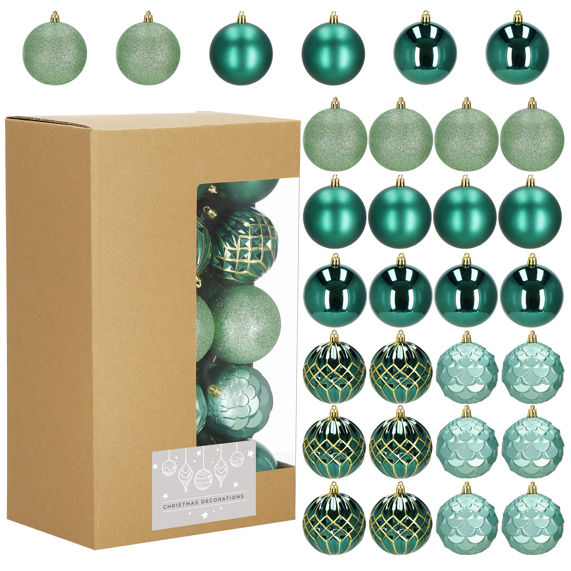 Deze set van 30 groene kerstballen biedt een perfecte balans tussen elegantie, warmte en natuurlijke schoonheid. De verschillende tinten groen en diverse afwerkingen – mat, glanzend, glitter en decoratief patroon – creëren samen een harmonieuze en luxe uitstraling. Groen staat symbool voor natuur, rust en vernieuwing en past perfect bij de magie van het kerstseizoen. Dankzij het hoogwaardige, onbreekbare materiaal zijn deze kerstballen veilig voor kinderen en huisdieren en gaan ze jarenlang mee.