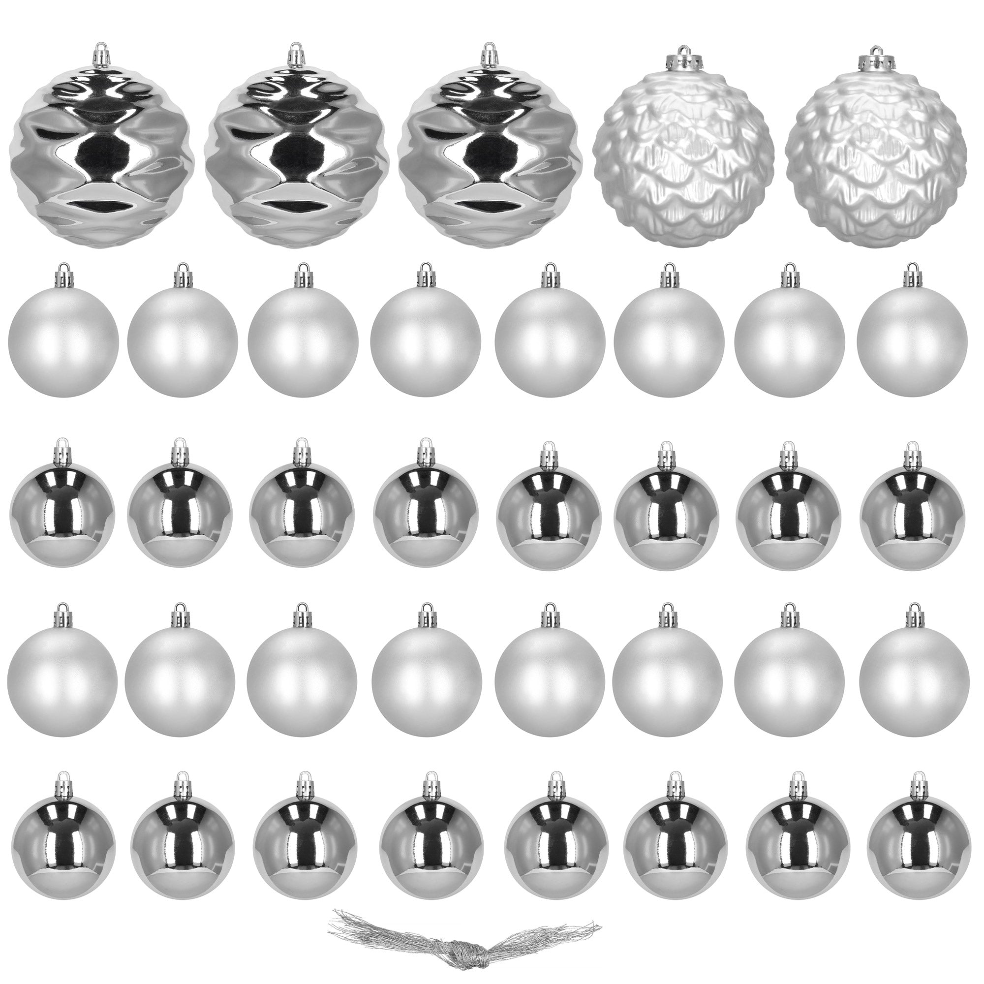 Geef uw kerstboom een moderne en elegante uitstraling met deze zilveren set van 37 kerstornamenten. Zilver staat symbool voor rust, harmonie en stijl, waardoor het de perfecte kleur is voor een feestelijke winterdecoratie. De sprankelende afwerking zorgt voor een luxueuze sfeer en laat uw interieur schitteren in het licht van de feestdagen.