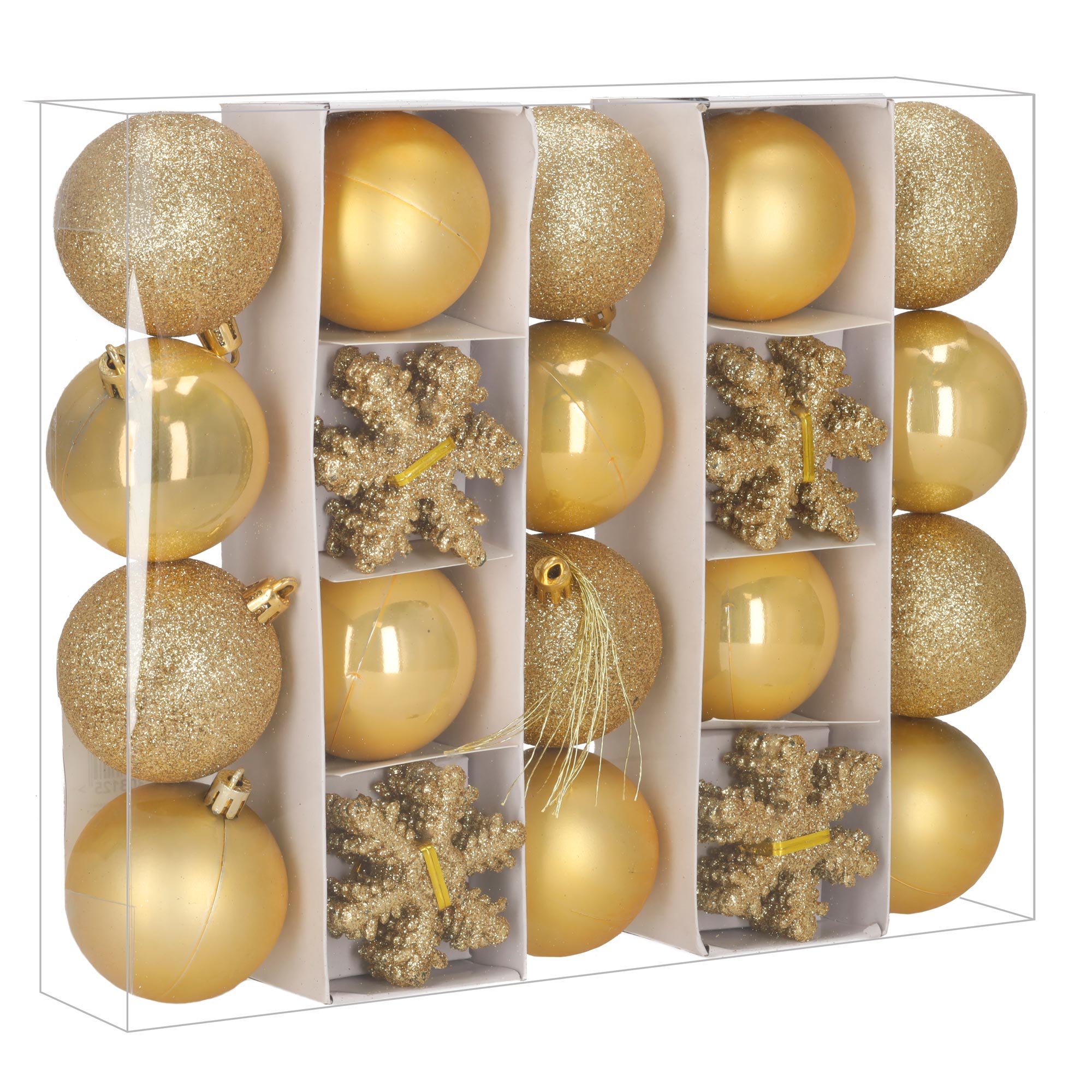 De ornamenten zijn gemaakt van onbreekbaar kunststof, waardoor ze veilig, licht en gemakkelijk op te hangen zijn, zelfs aan delicate dennentakken. De set bestaat uit verschillende groottes en texturen, waardoor u de boom mooi in balans kunt decoreren en lege ruimtes stijlvol kunt invullen. De gouden oppervlakken reflecteren het licht van kerstlampjes op magische wijze en versterken meteen de feestelijke sfeer in huis.