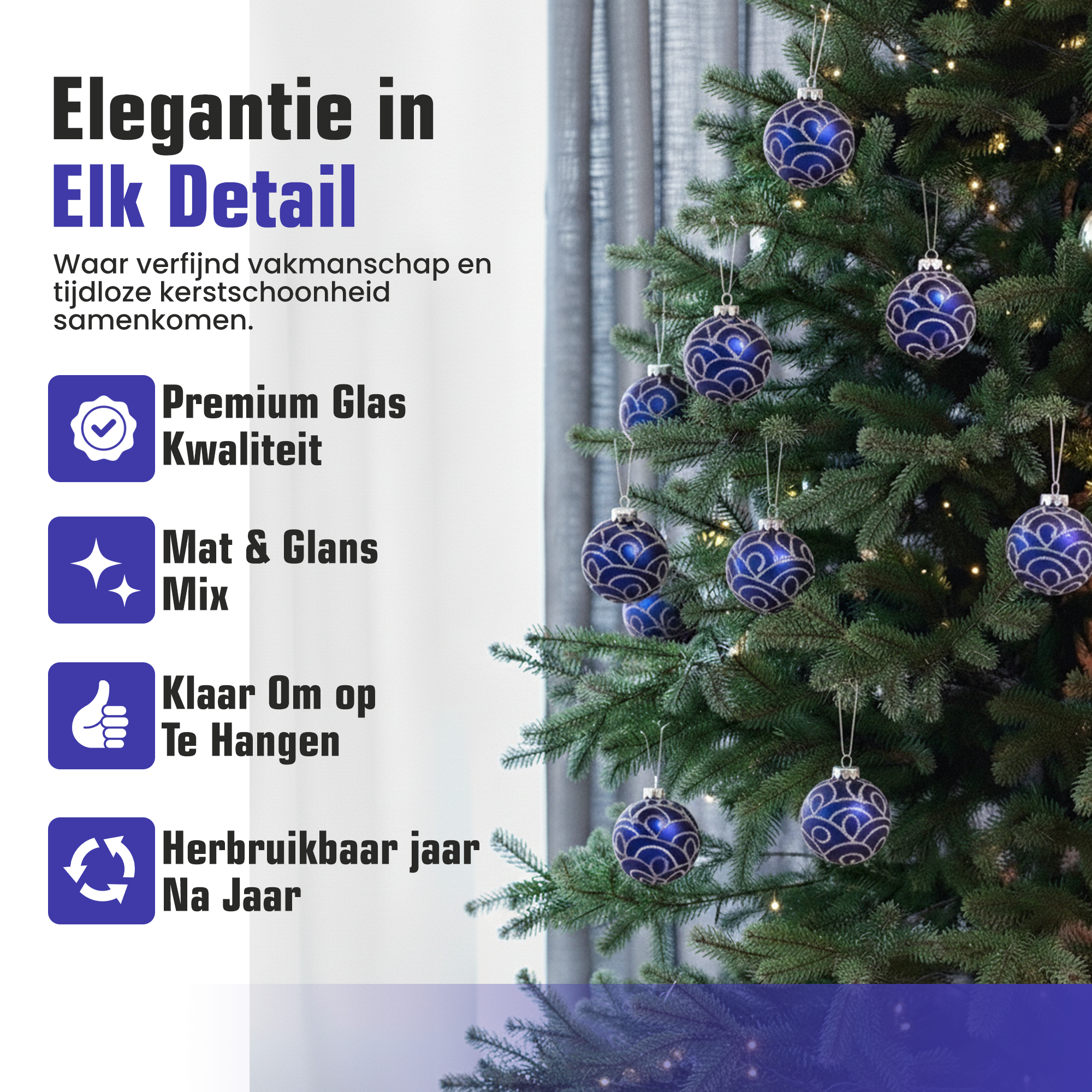 De set van 4 stuks is direct klaar om uw kerstboom of interieur mee te versieren. Combineer de donkerblauwe en zilveren tinten met wit, glas of metallic ornamenten voor een stijlvol en samenhangend geheel. Of u nu kiest voor een klassiek, winters of modern thema, deze kerstballen passen er perfect bij.