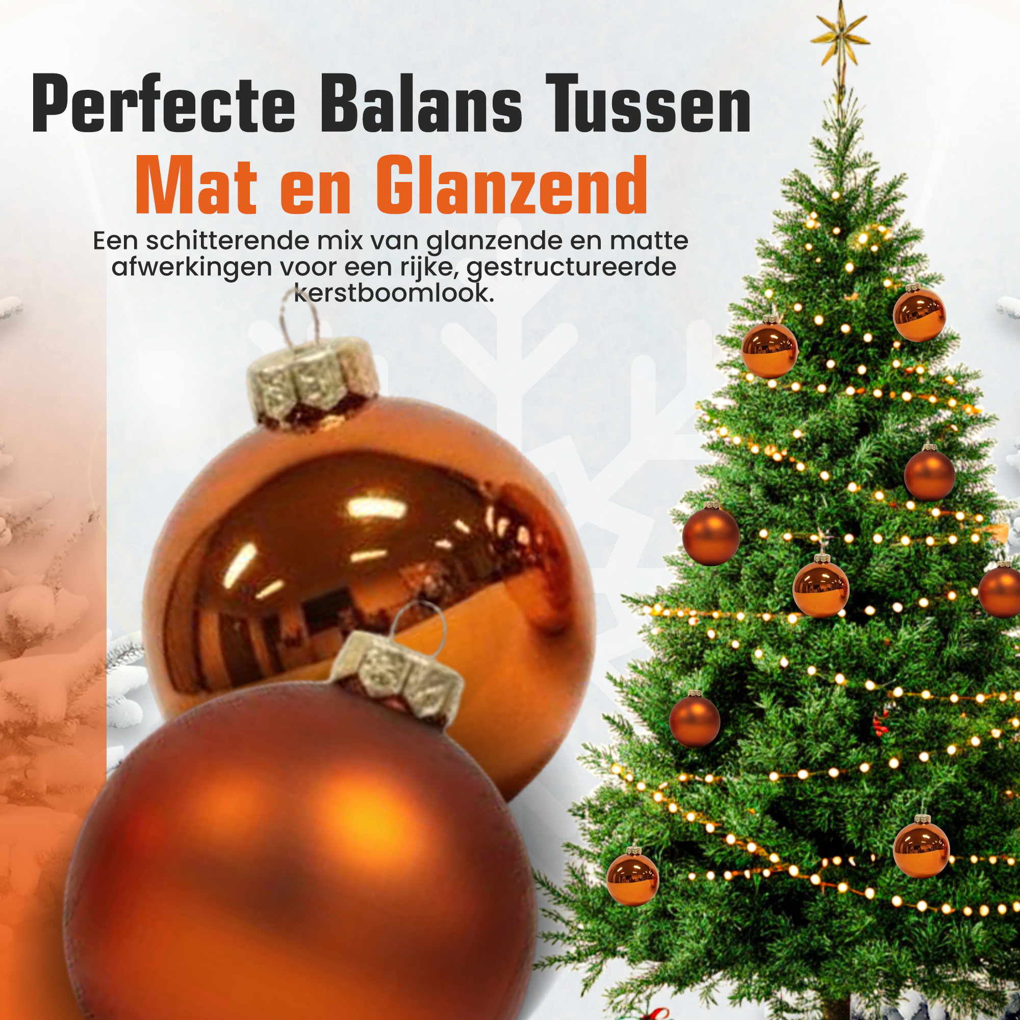 De oranje kleur van deze kerstballen brengt warmte en verfijning samen in één stijlvolle tint. Deze kleur combineert prachtig met zowel natuurlijke elementen als klassieke kerstkleuren zoals goud, wit of bruin. De warme gloed zorgt voor een gezellige sfeer en maakt uw kerstboom tot een echte blikvanger.