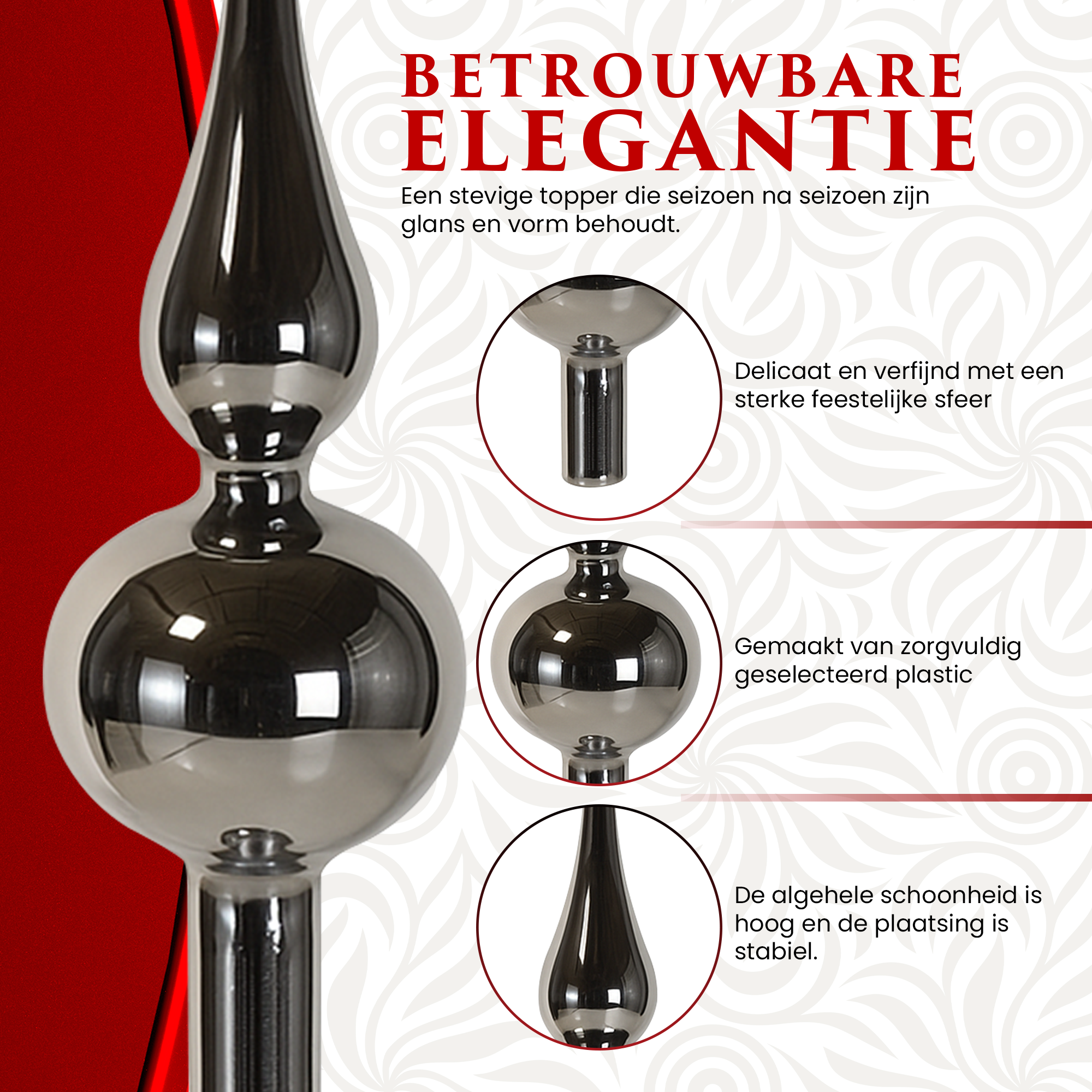 Dankzij het gebruik van duurzame materialen is de piek niet alleen stevig, maar ook verrassend licht in gewicht. Hierdoor blijft hij stabiel op de boom staan zonder dat de takken doorbuigen. Dit maakt het product zowel praktisch als langdurig inzetbaar, jaar na jaar.