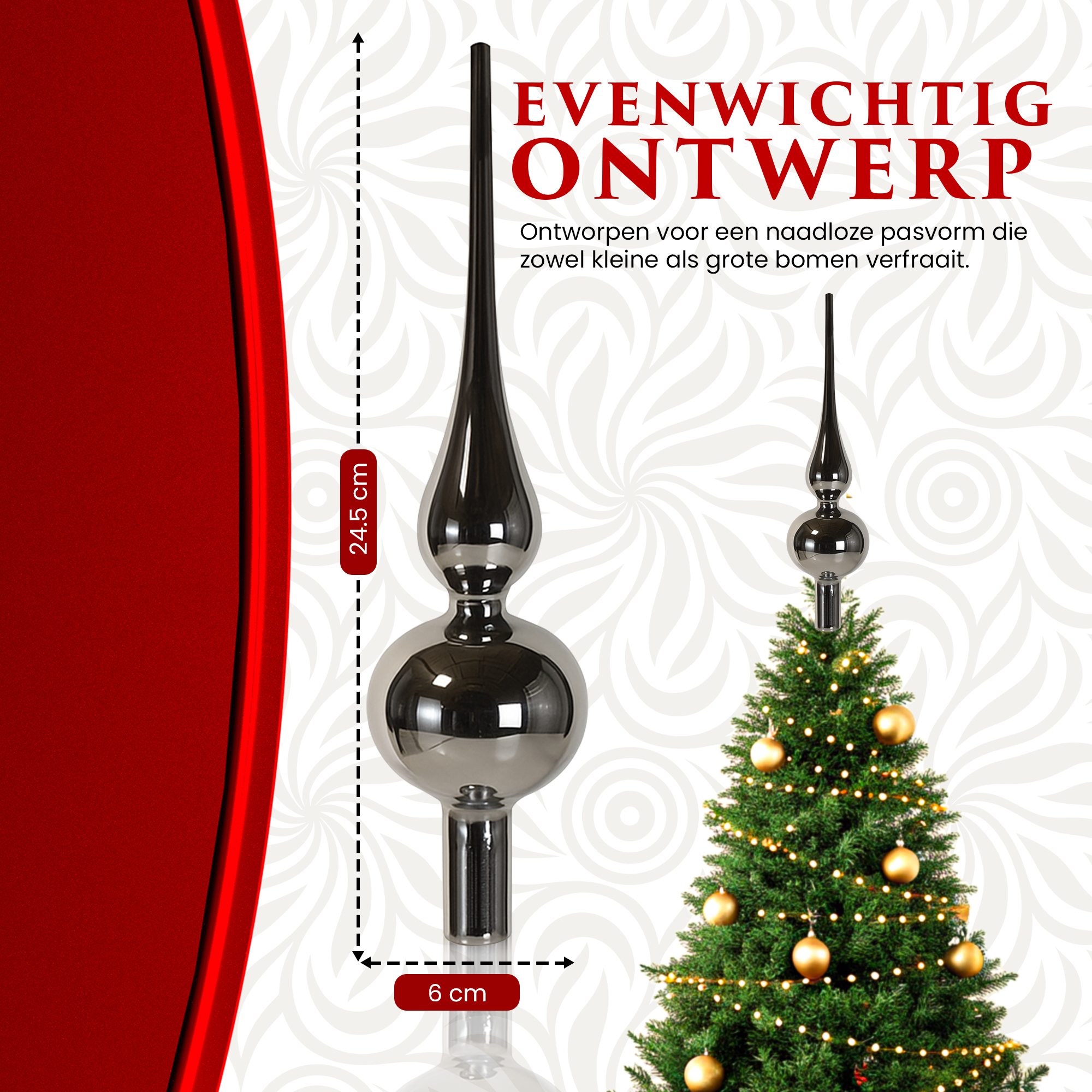 Met zijn pijlvormige design voegt de piek een gevoel van hoogte en elegantie toe aan je kerstboom. De reflecterende afwerking vangt subtiel het licht, waardoor er een sprankelend effect ontstaat dat de gehele boom versterkt. Het resultaat is een feestelijke maar ingetogen glans die de aandacht trekt.