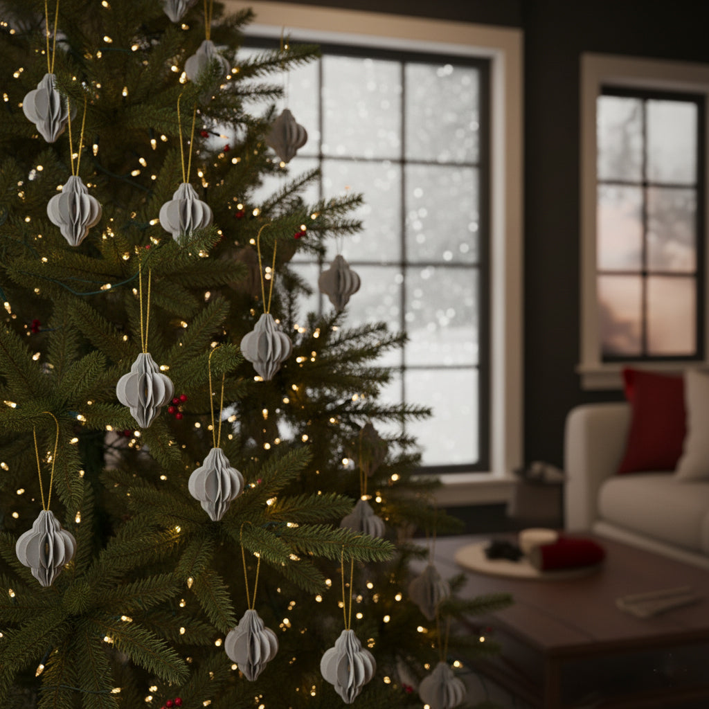 De kerstballen zijn gemaakt van stevig, milieuvriendelijk papier dat zijn vorm en kleur behoudt, zelfs bij herhaald gebruik. Ze zijn herbruikbaar, lichtgewicht en eenvoudig op te hangen zonder takken te belasten. Na de feestdagen kunnen ze moeiteloos worden opgevouwen en compact worden opgeborgen. Dit maakt ze tot een duurzame en praktische keuze voor wie bewust wil decoreren.