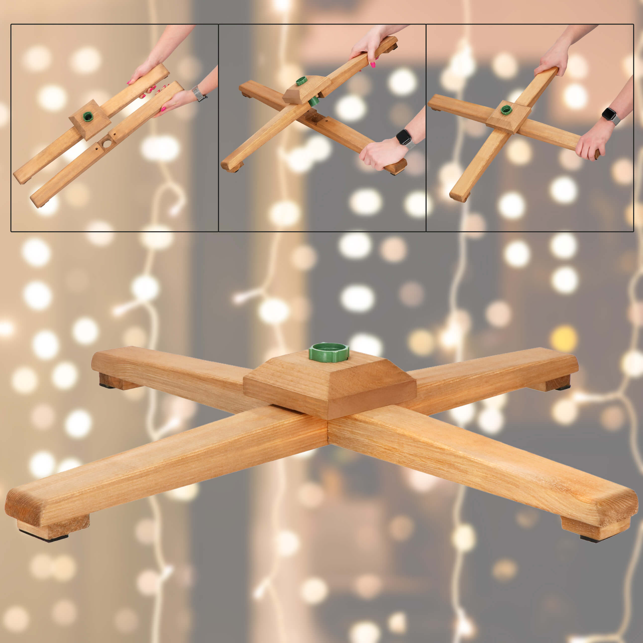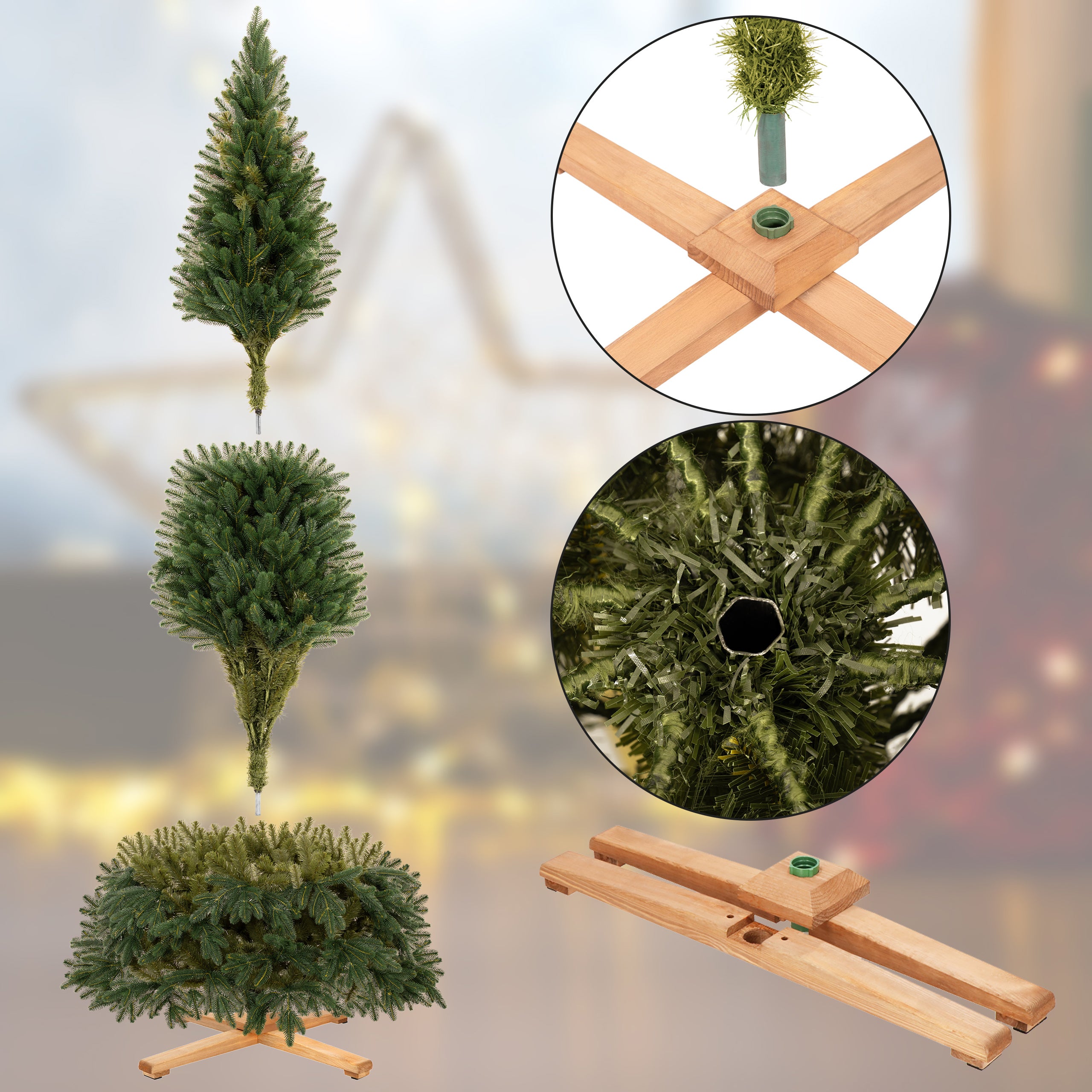 De boom is eenvoudig en snel te monteren en blijft stabiel dankzij de meegeleverde houten standaard en het versterkte frame. Hij heeft geen water of onderhoud nodig, waardoor hij een praktische keuze is die jarenlang meegaat. Bovendien zijn de gebruikte materialen vlamvertragend en duurzaam, zodat de boom zijn schoonheid vele seizoenen behoudt.