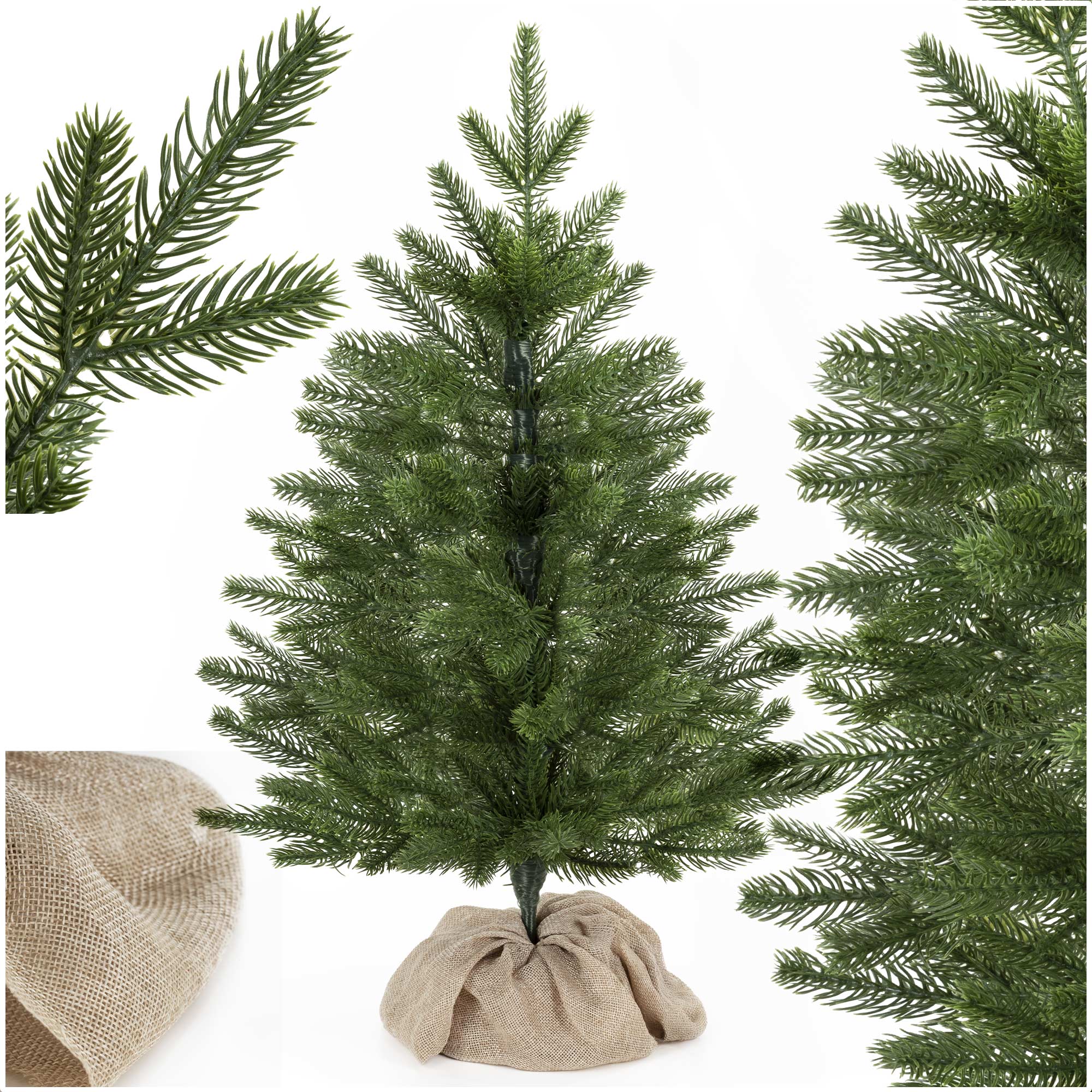 De kerstboom wordt geleverd met een stevige standaard die is bedekt met jute stof, wat zorgt voor een charmante, decoratieve uitstraling. Hierdoor ziet de boom er direct afgewerkt uit, zelfs zonder extra decoratie.