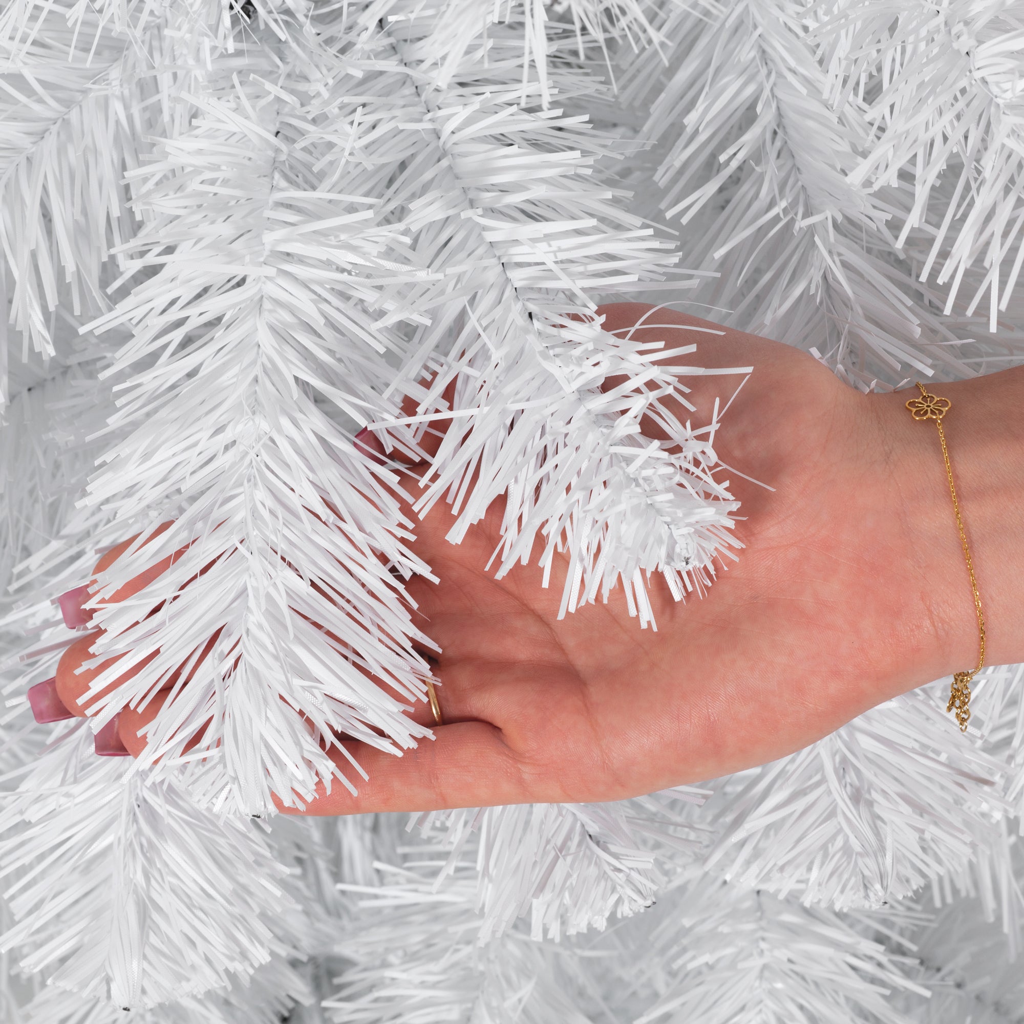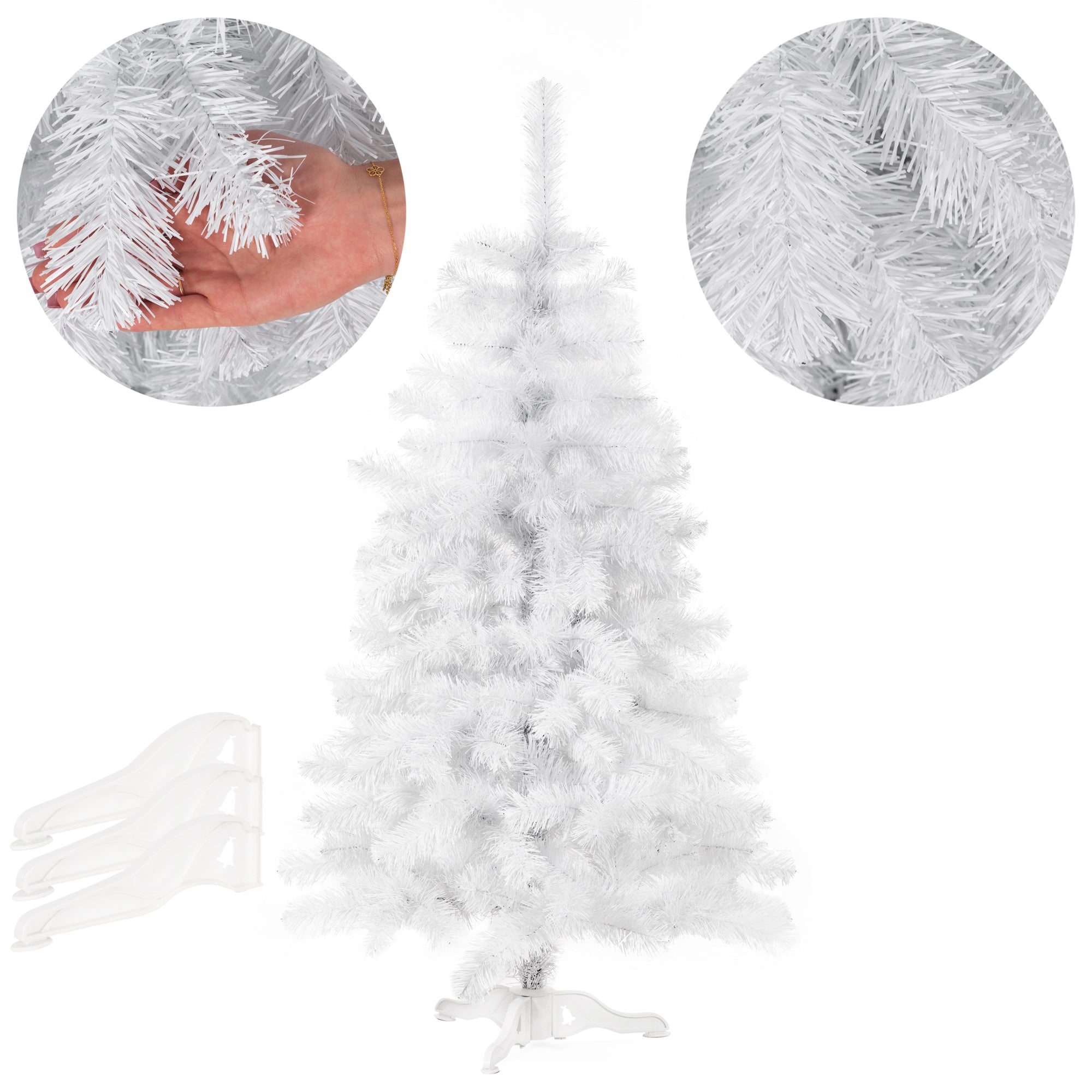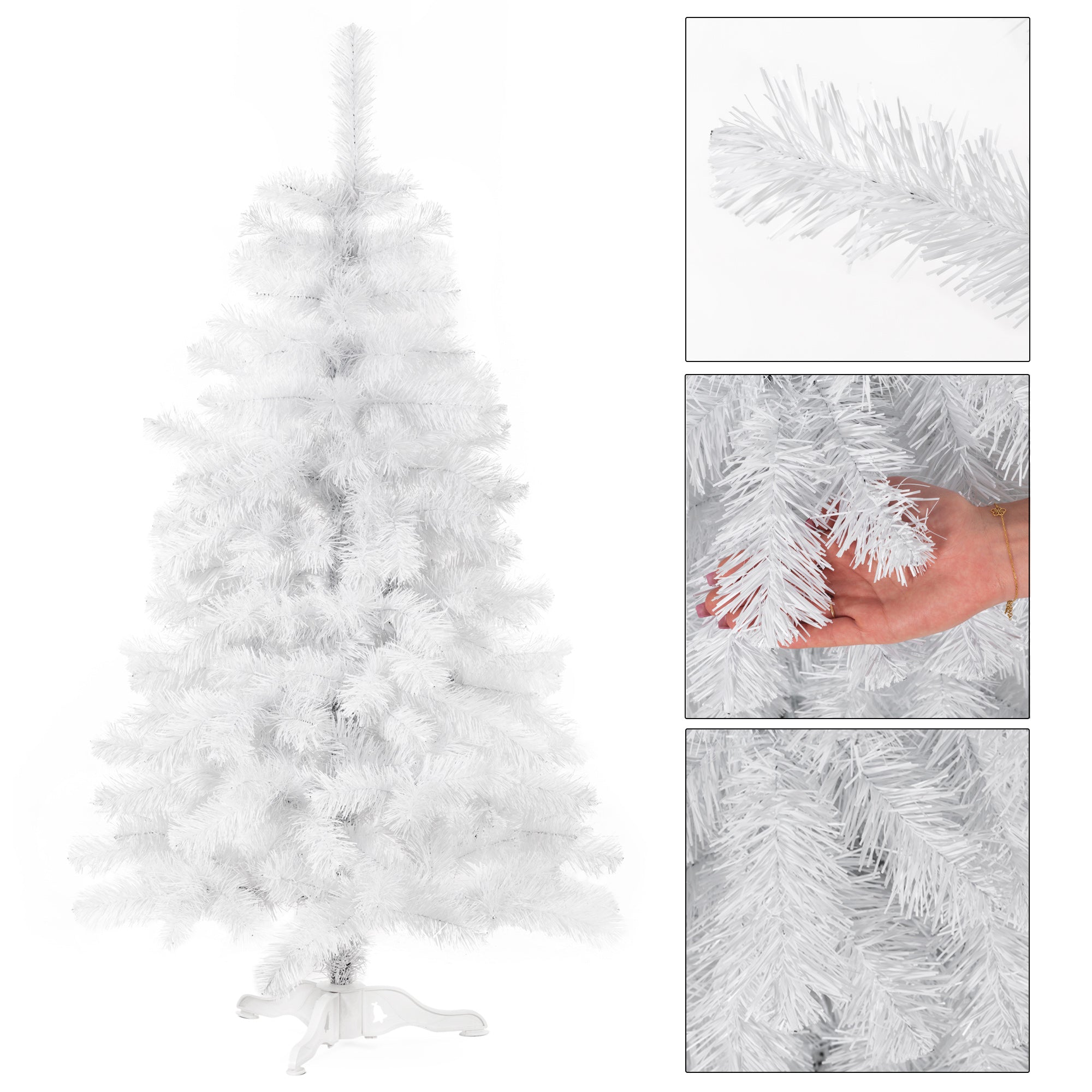 De witte naalden zijn vervaardigd uit ecologische PVC-folie, wat niet alleen milieuvriendelijk is, maar ook zorgt voor een natuurlijke uitstraling. De takken zijn dicht op elkaar geplaatst en hebben variërende uiteinden, waardoor er geen lege plekken ontstaan. Dankzij de flexibele structuur kunnen de takken naar wens worden gevormd, zodat je altijd de perfecte boom creëert. De verborgen maar sterke bedrading garandeert stabiliteit en duurzaamheid, zelfs na jarenlang gebruik.