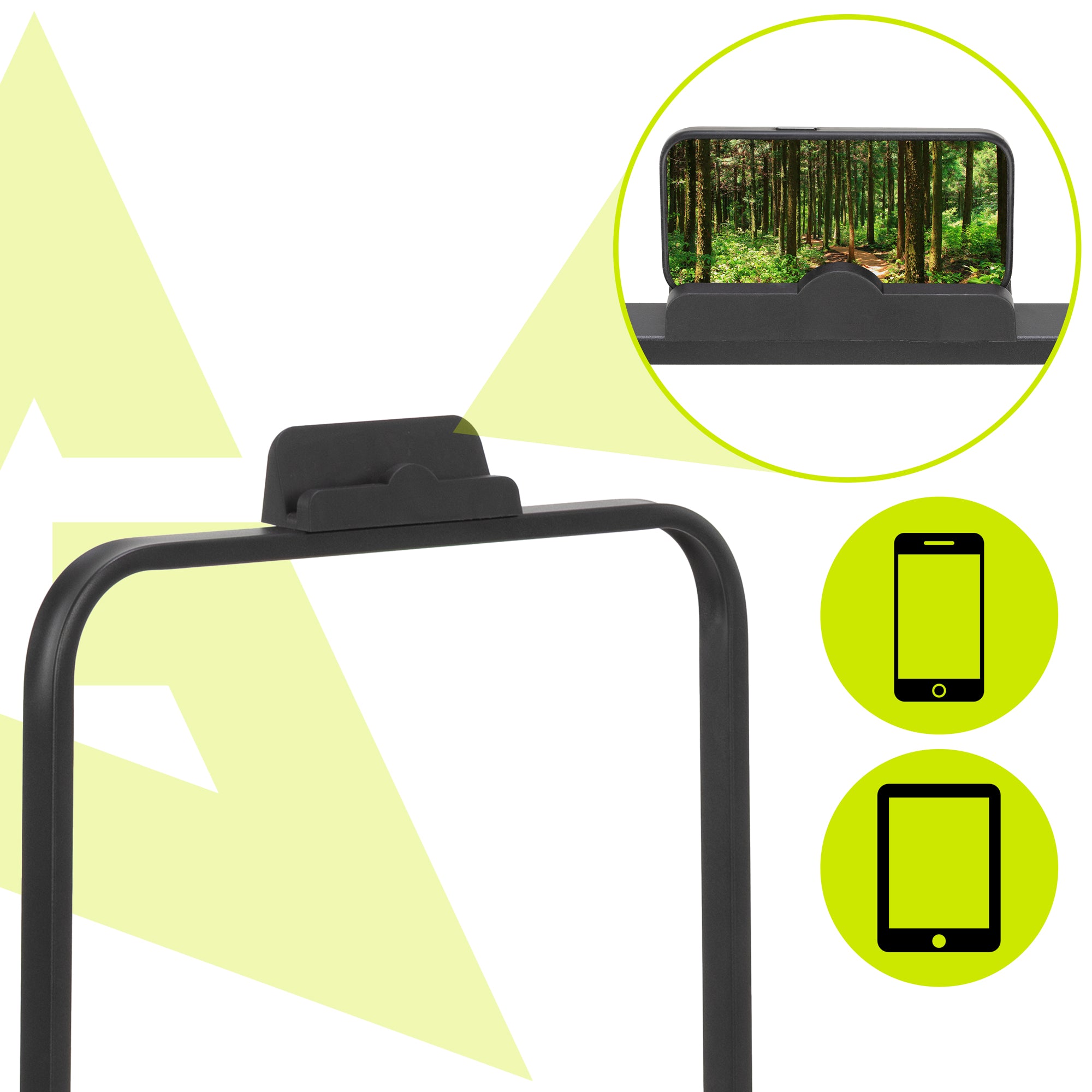 Boven het loopvlak bevindt zich een montageframe met telefoonhouder, zodat je tijdens het trainen je telefoon binnen handbereik hebt voor muziek, video’s of trainingsapps. De stevige constructie van staal en kunststof garandeert stabiliteit en duurzaamheid, met een maximale belasting tot 110 kg.