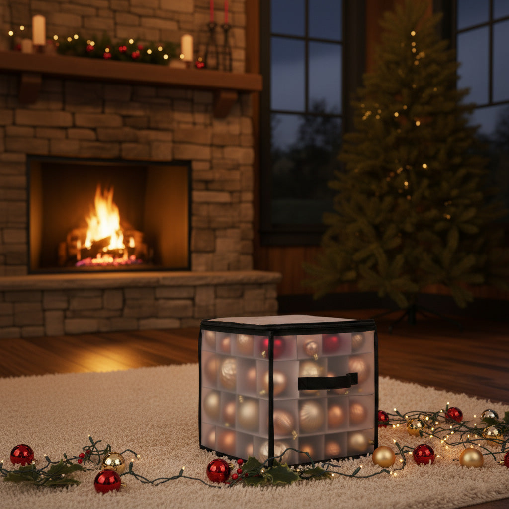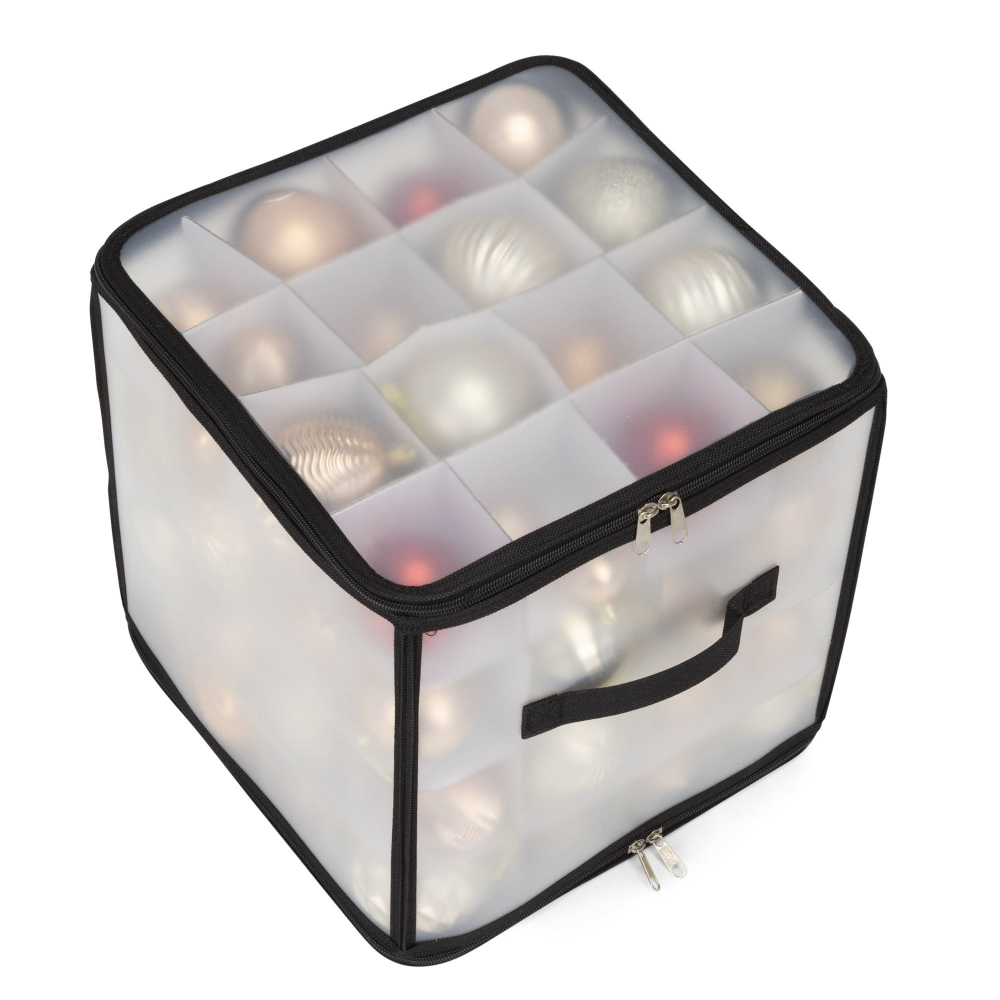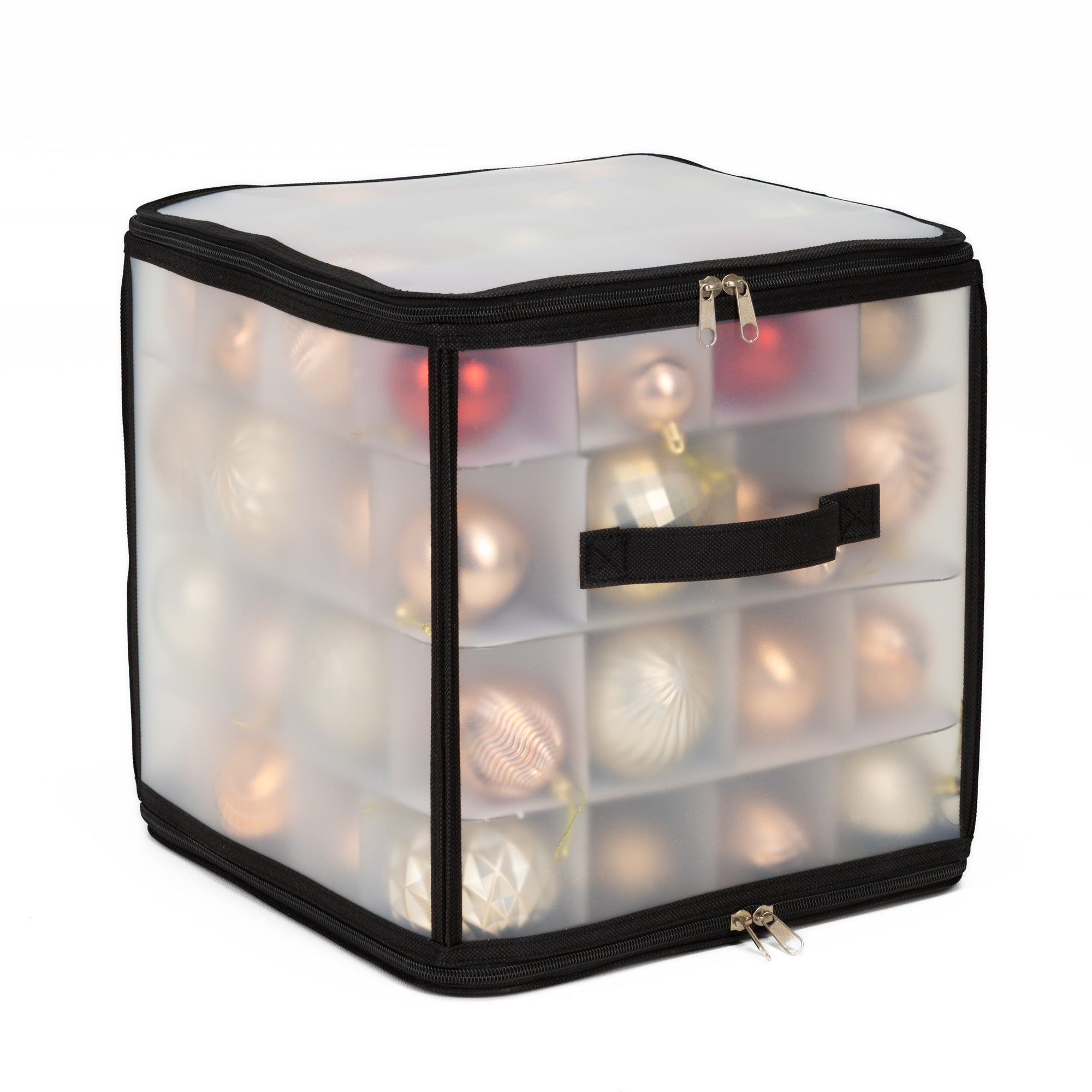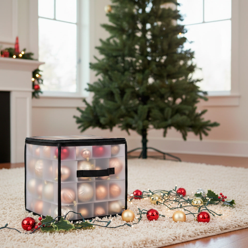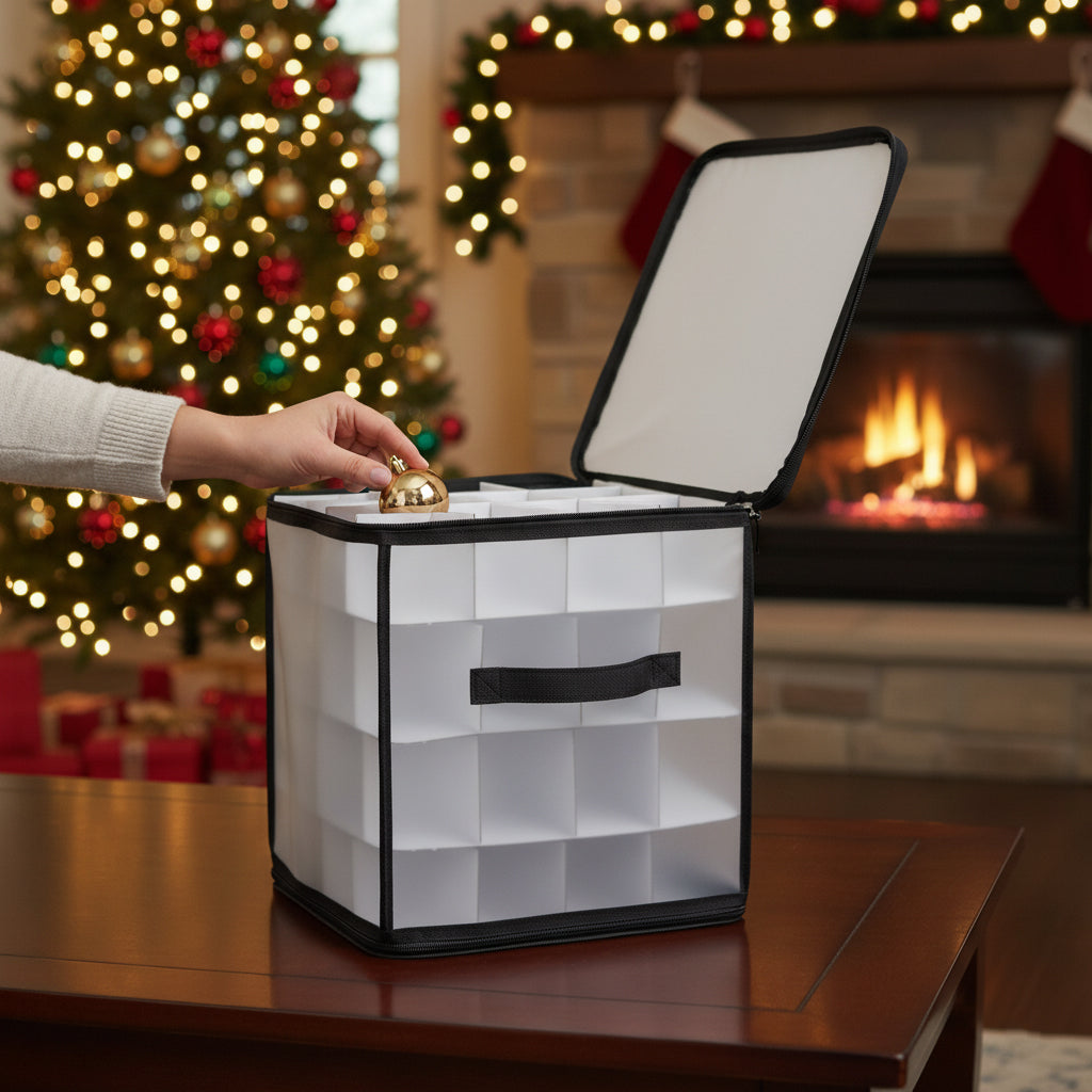 De organizer is voorzien van 64 aparte vakken die elk ornament afzonderlijk beschermen tegen krassen, stoten en breuken. Dankzij de stevige constructie blijven uw kerstdecoraties veilig, zelfs tijdens het verplaatsen of stapelen. Het transparante ontwerp zorgt ervoor dat u snel kunt zien wat erin zit zonder de doos te openen, terwijl de zwarte accenten zorgen voor een stijlvolle uitstraling.