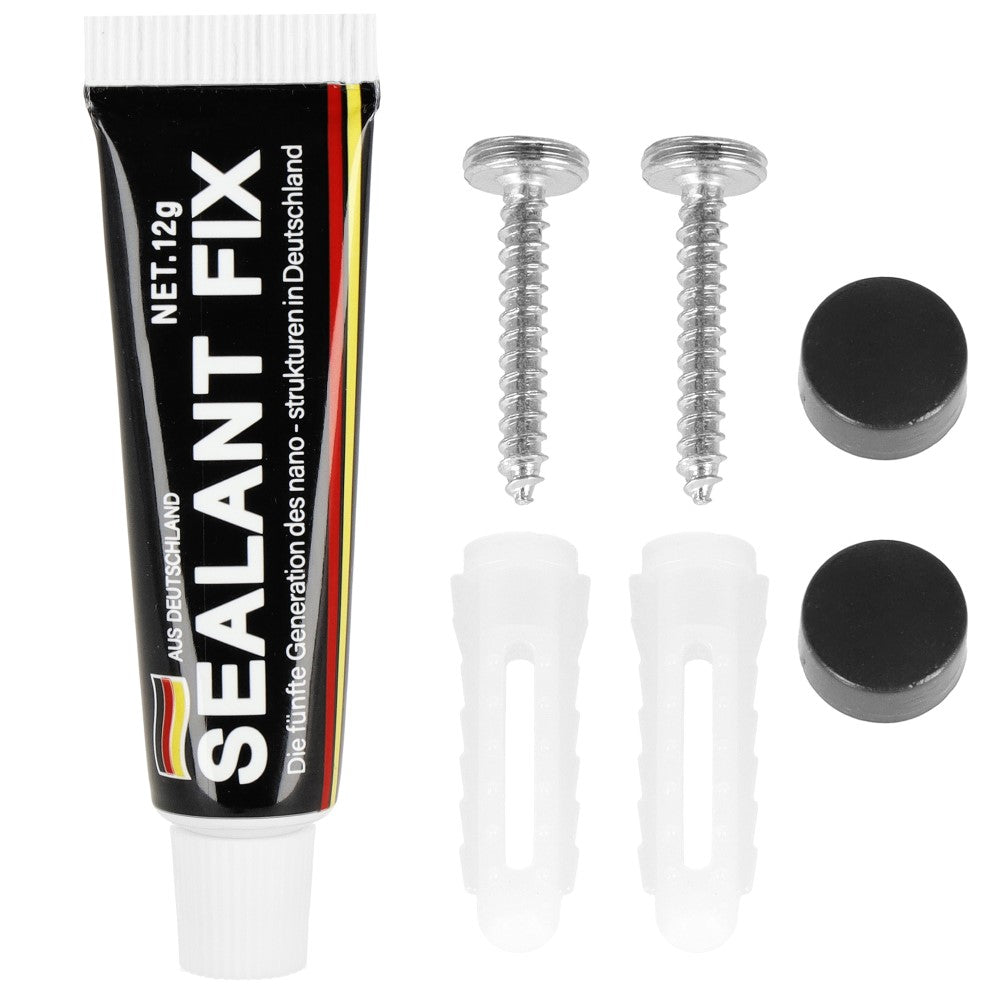 - De set bevat: Hanger, lijm, 2 schroeven (28 mm), 2 zwarte pluggen, stickers om te helpen bij het monteren van lijm