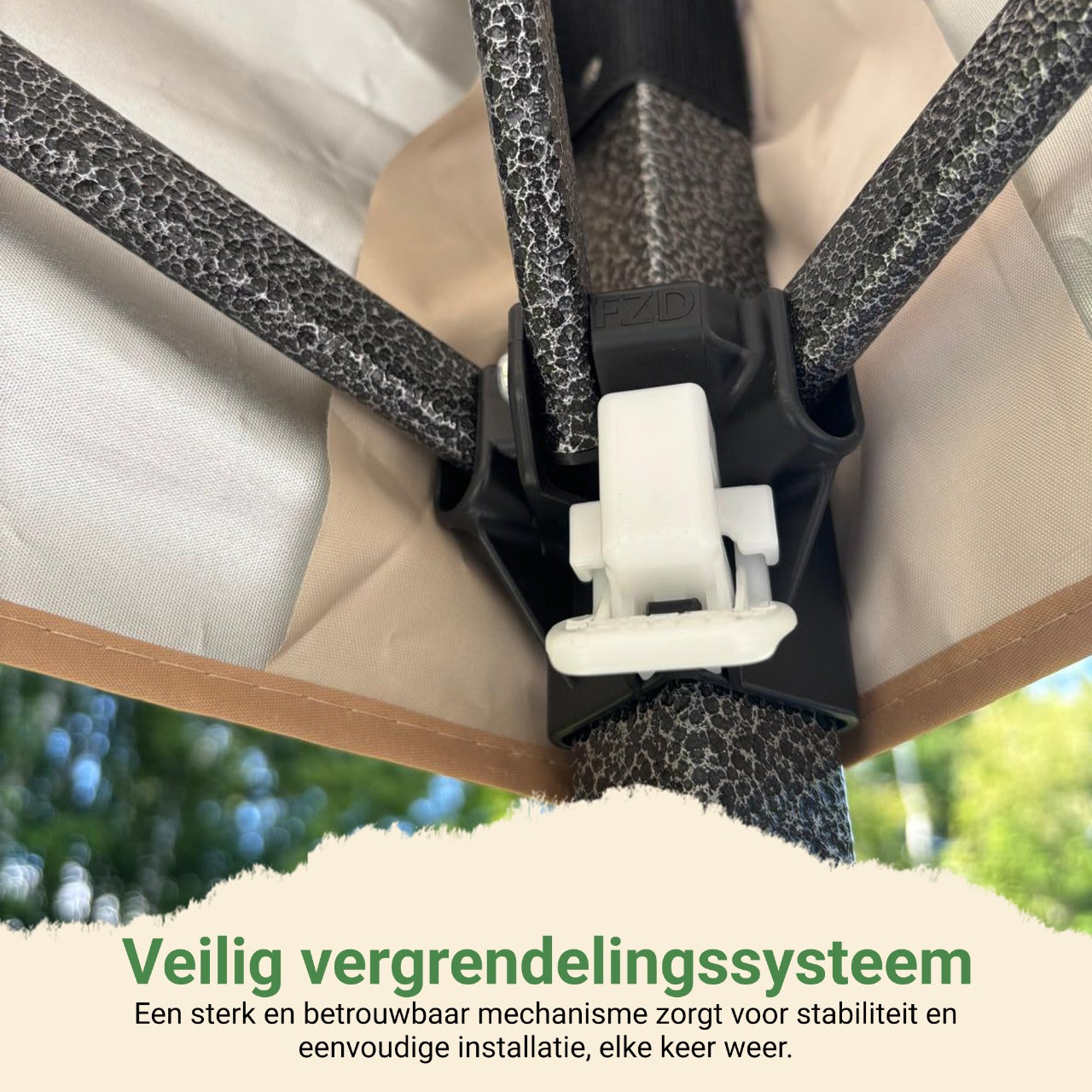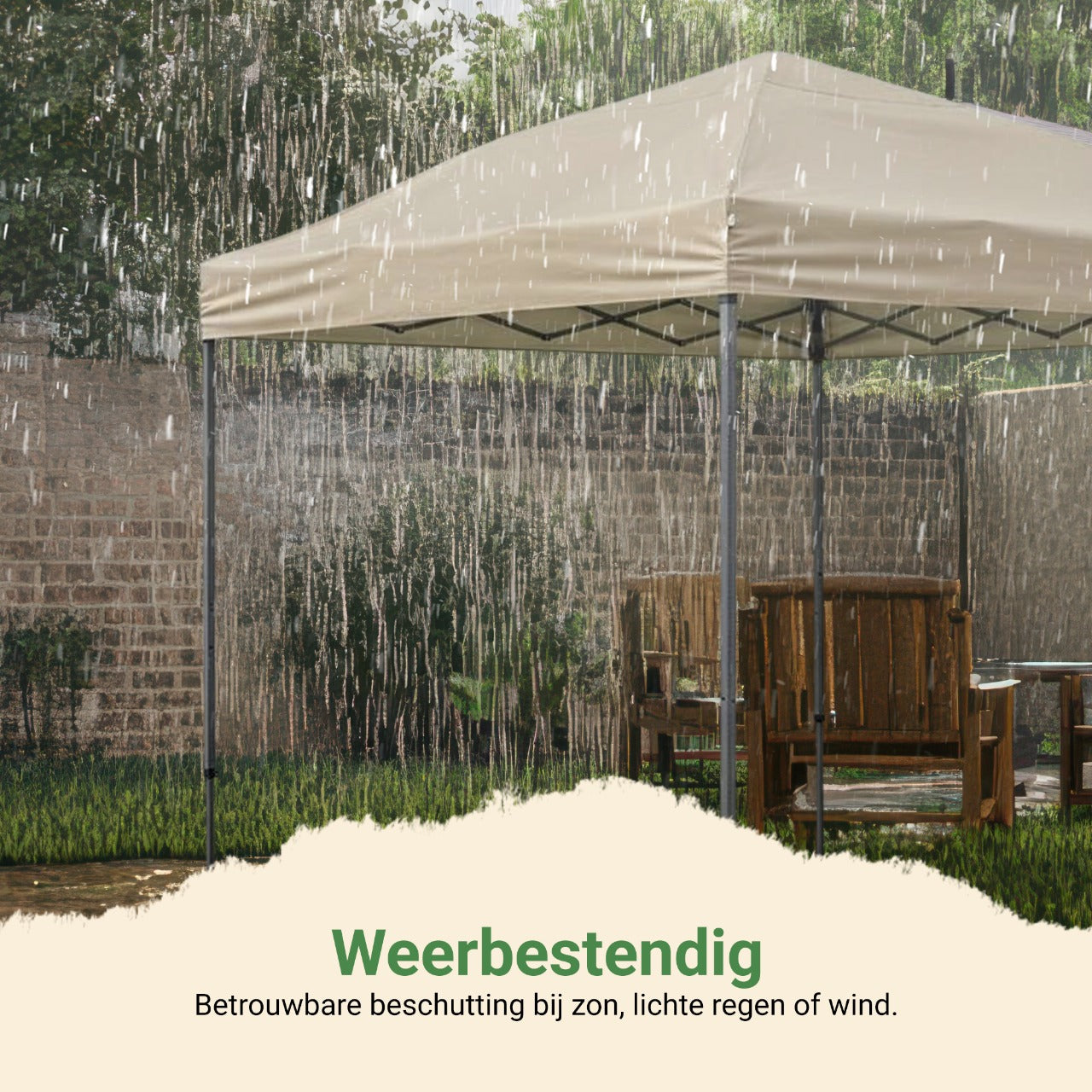 De partytent is gemaakt van hoogwaardig 150D Oxford polyester en voorzien van een zilverkleurige binnencoating. Deze coating biedt bescherming tegen uv-straling en zorgt ervoor dat het doek waterafstotend is. Hierdoor biedt de tent schaduw en beschutting tijdens zonnige én licht regenachtige dagen. Ideaal voor elk moment waarop je buiten wilt genieten met extra comfort.