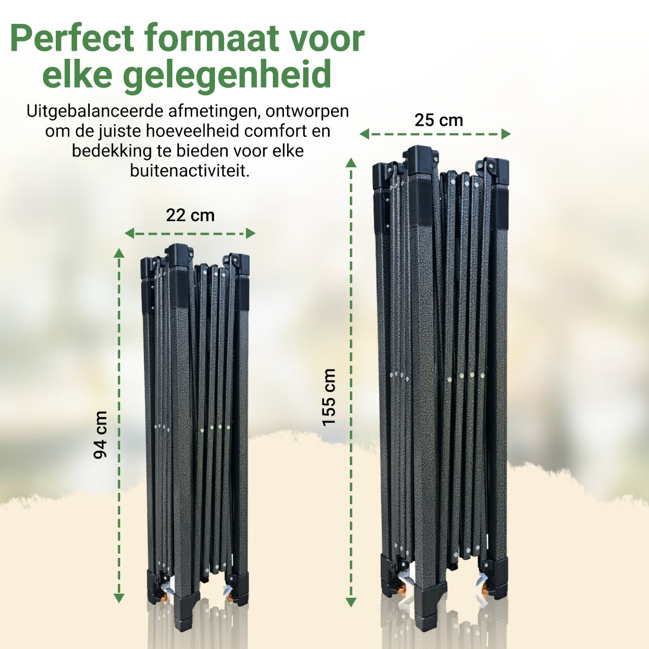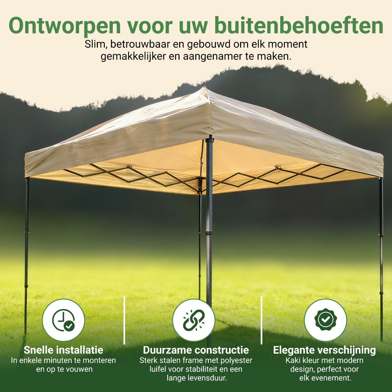 Ben je op zoek naar een praktische, stijlvolle en snel op te zetten partytent voor een tuinfeest, barbecue, markt, camping of evenement? Dan is deze compacte carfit partytent van 3x3 meter in de kleur khaki een uitstekende keuze. Dankzij het handige harmonica-opvouwbare frame zet je de tent binnen enkele minuten op, zonder gereedschap of ingewikkelde stappen. Door het slimme ontwerp is hij bovendien eenvoudig mee te nemen in de auto – hij past in de meeste kofferbakken.