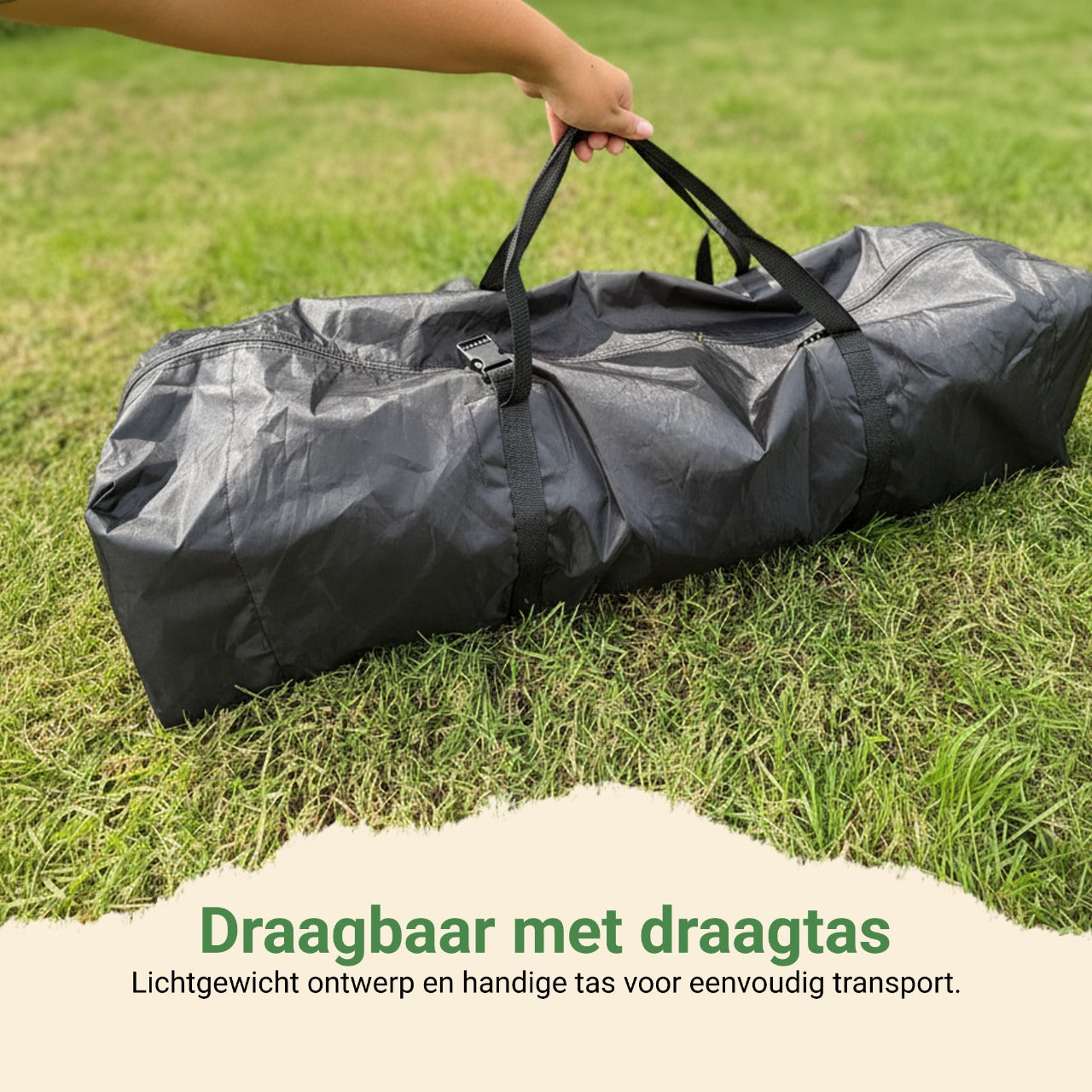 De tent wordt compleet geleverd met een stevig stalen frame, een afdekdoek en een handige draagtas. Zo neem je hem eenvoudig mee en berg je hem snel weer op na gebruik. De opbouw is intuïtief en kost nauwelijks tijd, waardoor je meer kunt genieten van het moment.
