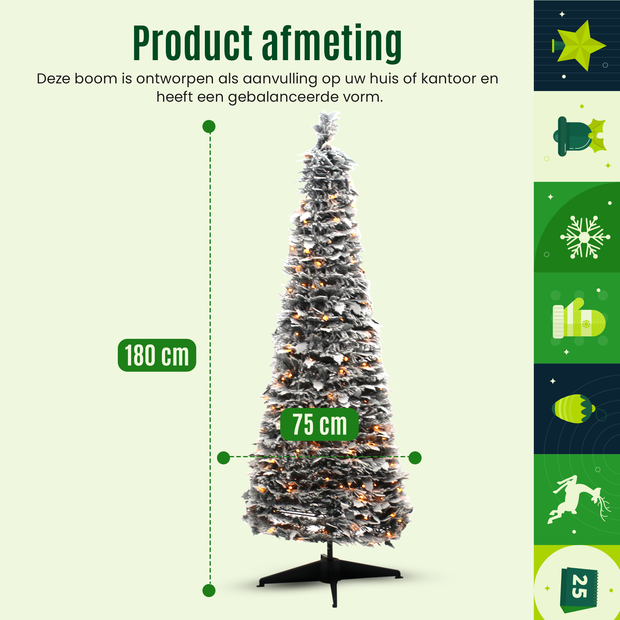 Met een hoogte van 180 cm en een diameter van 75 cm is deze kunstkerstboom een volwaardige blikvanger in de woonkamer, hal of zelfs op kantoor. Het royale formaat geeft de boom een indrukwekkende uitstraling, terwijl de sneeuwafwerking zorgt voor een charmant wintergevoel dat perfect bij de feestdagen past.