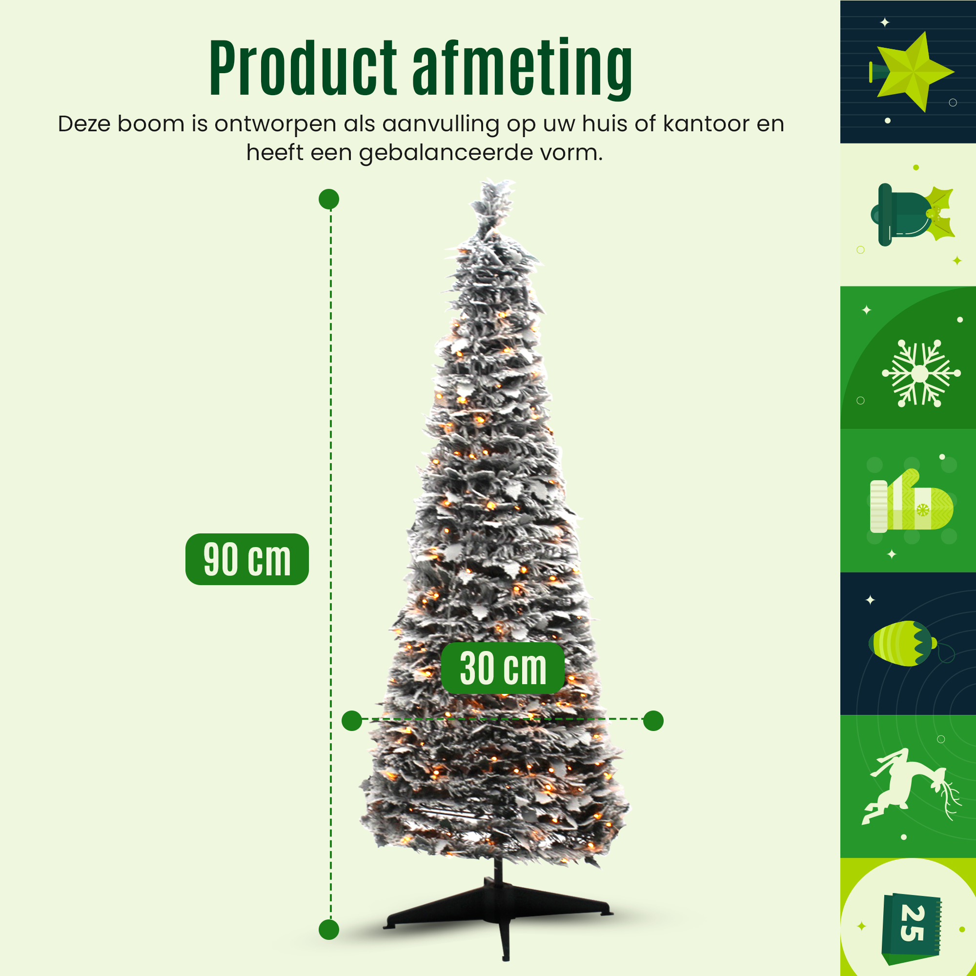 Met een hoogte van 90 cm en een diameter van 30 cm is deze compacte kerstboom ideaal voor kleinere ruimtes, zoals appartementen, studentenkamers of kantoren. Ondanks het compacte formaat oogt de boom stijlvol en feestelijk. De sneeuwafwerking op de takken geeft een winterse uitstraling die perfect past bij de kerstperiode.