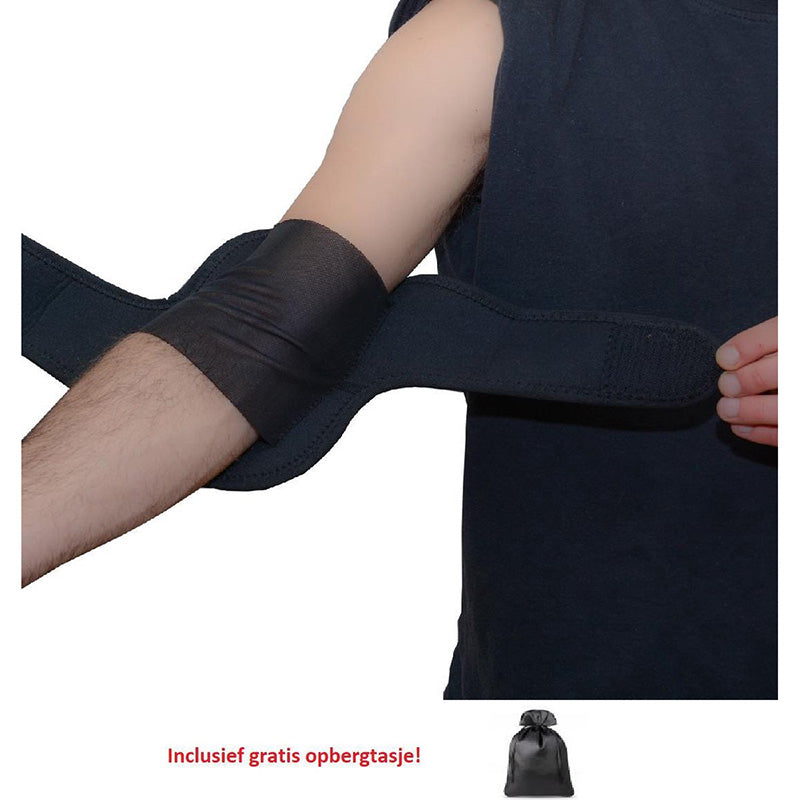 Hoe te gebruiken? - Wanneer je de elleboogbrace uit de verpakking haalt kan deze een ietwat vervelende geur afgeven. Deze verdwijnt snel, zeker wanneer je de elleboogbrace even buiten neerlegt. Steek je arm door de hiervoor bestemde opening en trek de brace omhoog tot iets over de ellenboog, totdat deze prettig zit. Trek de elastische banden voldoende strak aan en bevestig deze met de klittebandsluitingen.