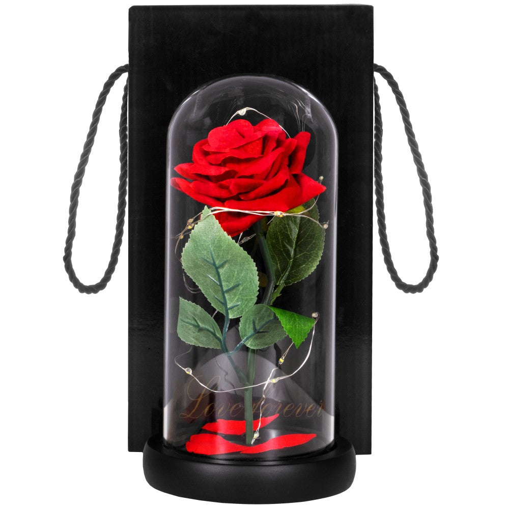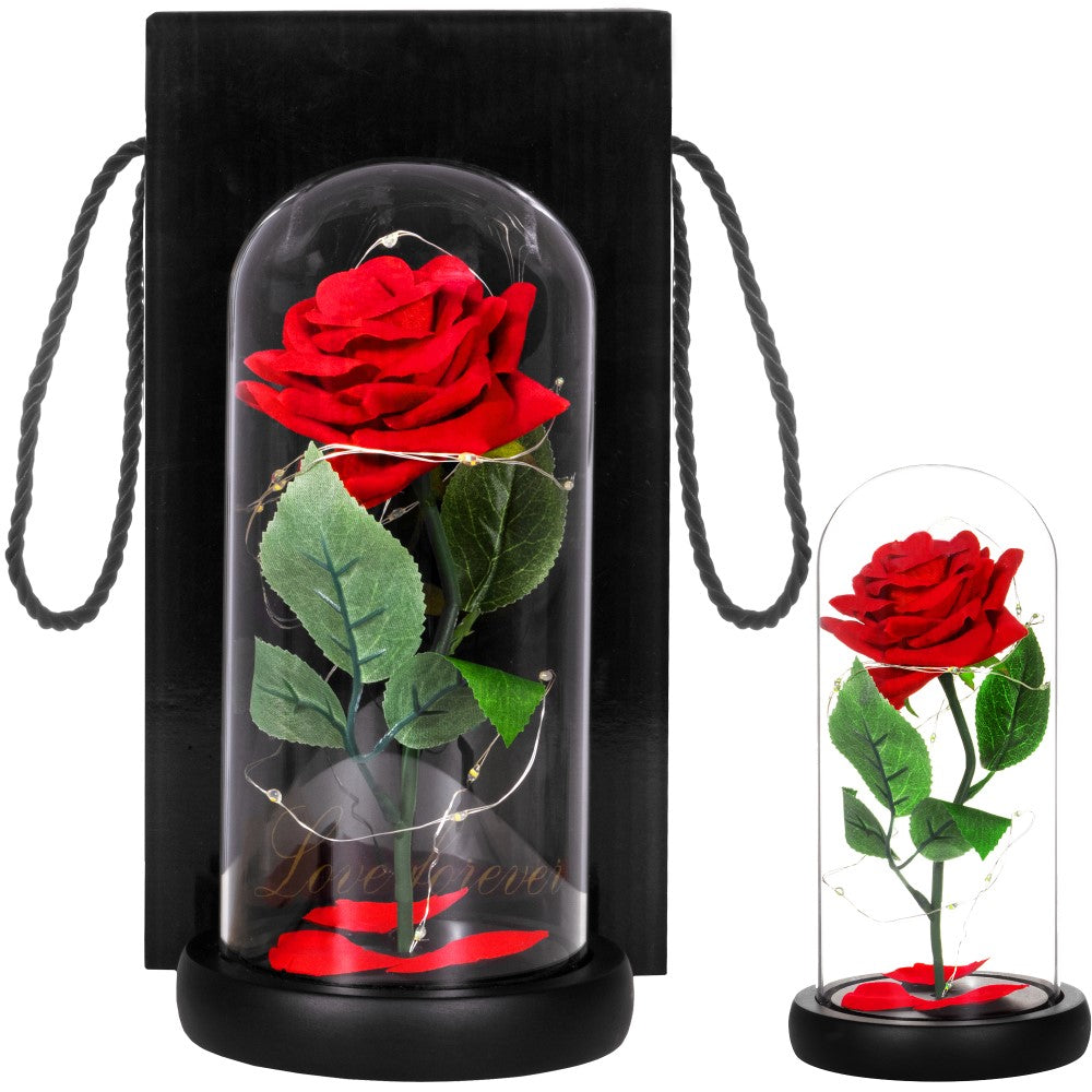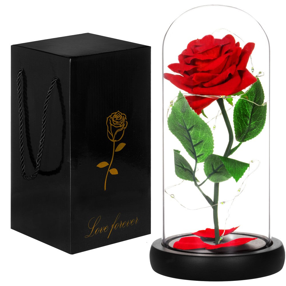 Met ingebouwde LED-verlichting en een elegante glazen stolp is de eeuwige roos niet alleen een cadeau, maar ook een stijlvol decoratief item. De warme gloed van het licht voegt een romantische sfeer toe aan elke ruimte en maakt de roos een opvallend element in huis.