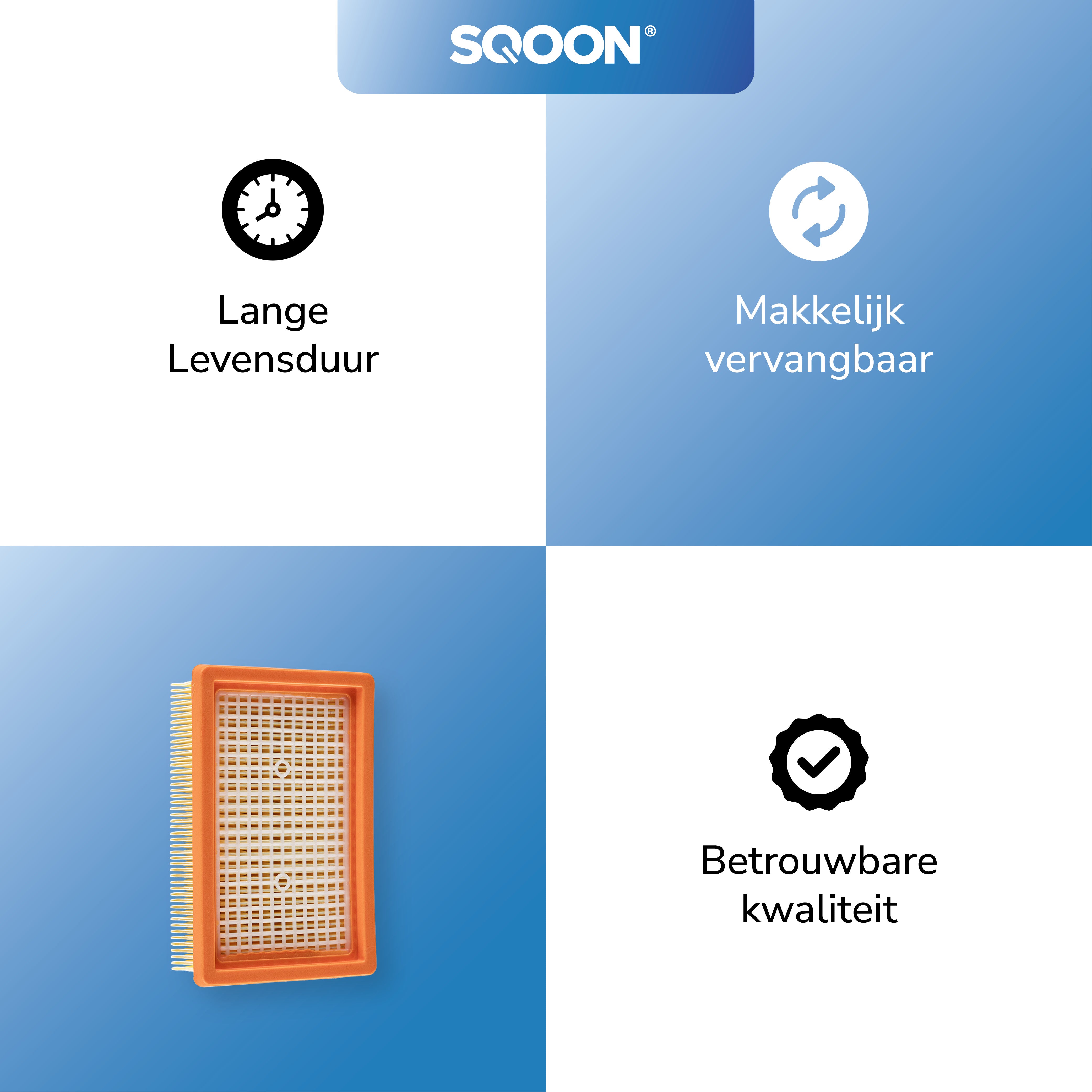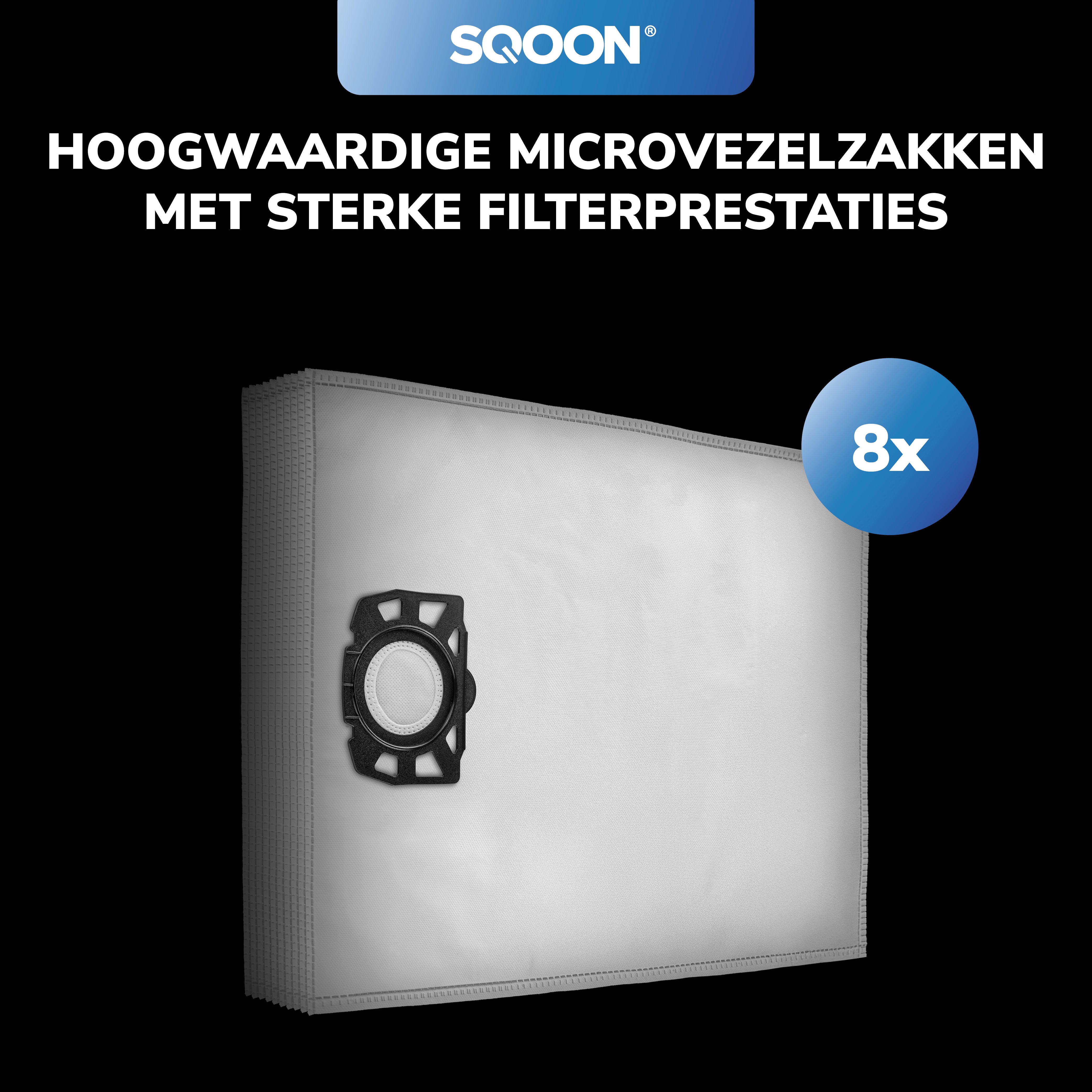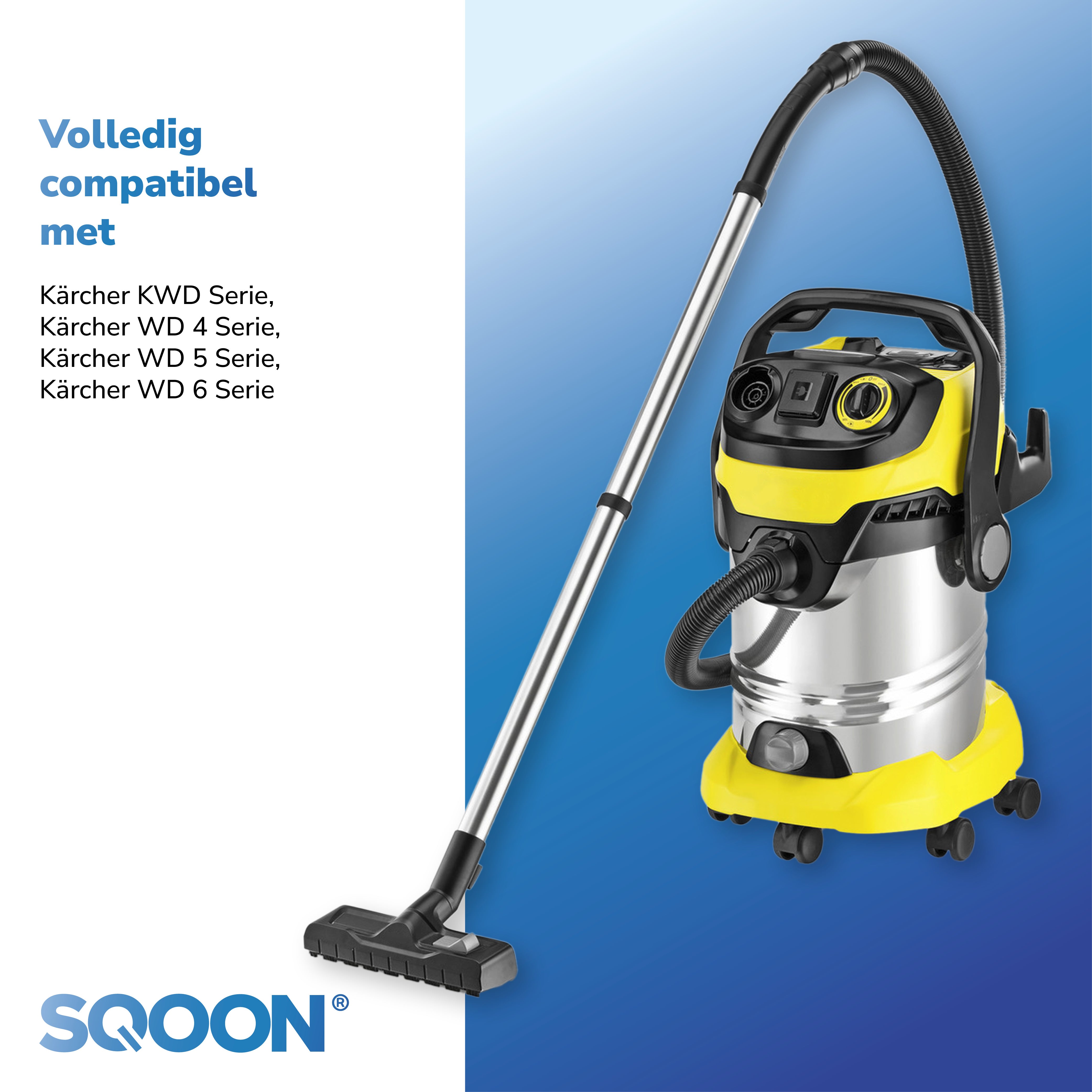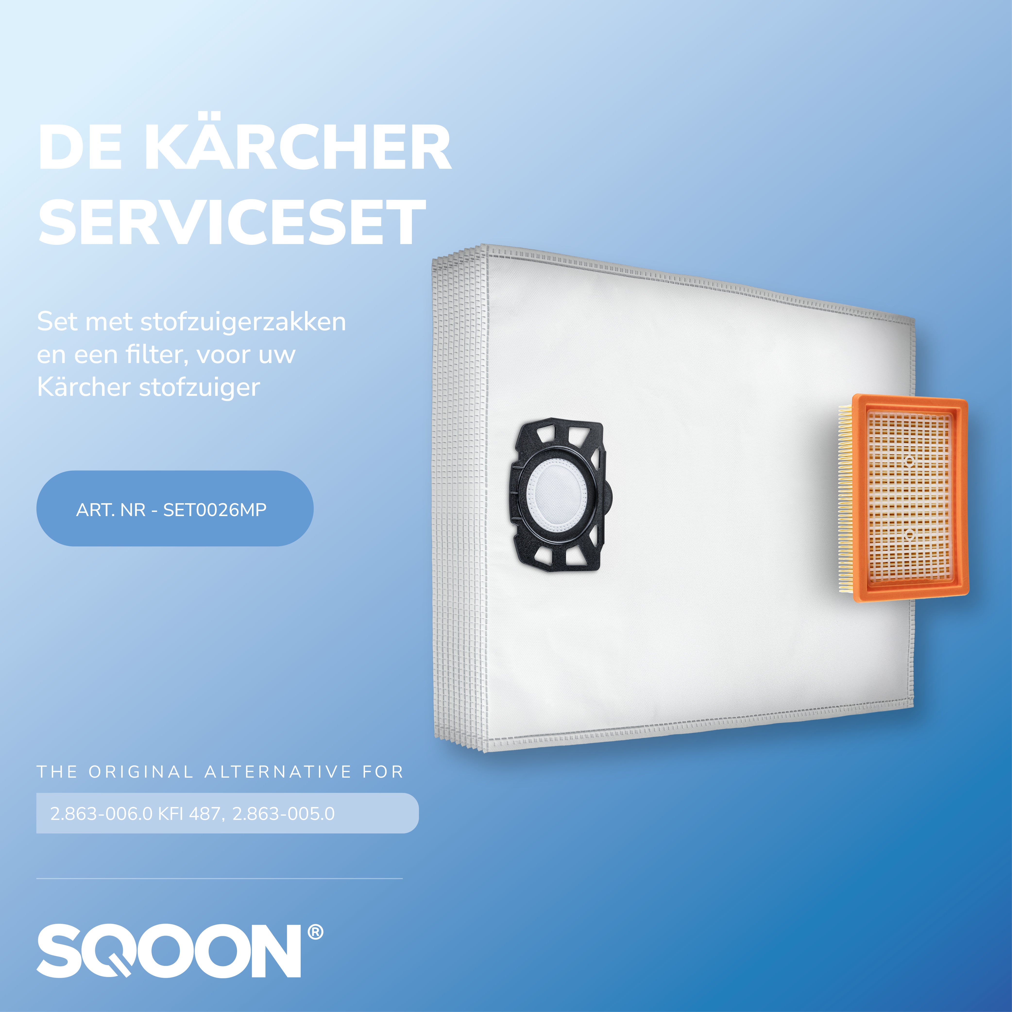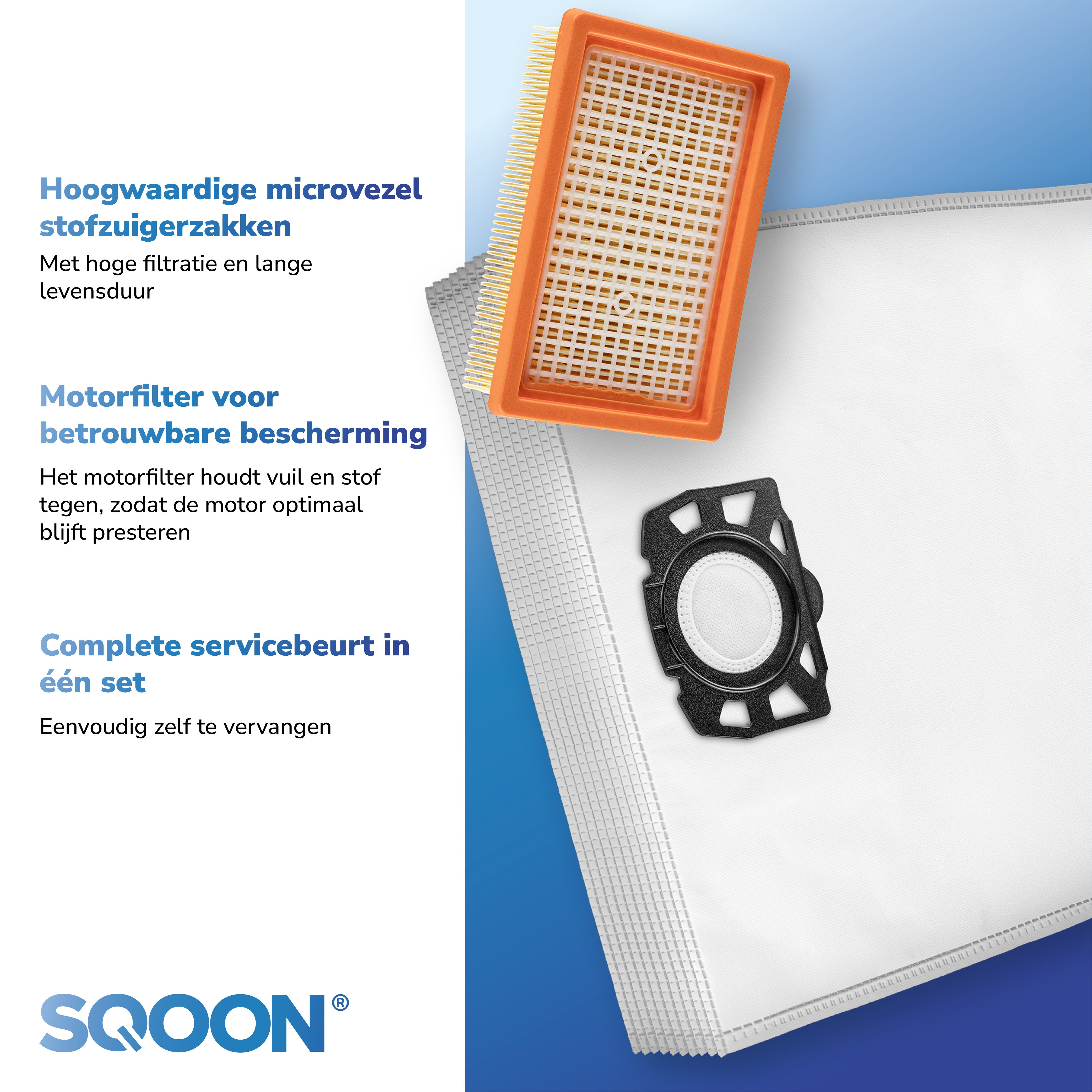 Deze complete vervangingsset van SQOON is speciaal ontwikkeld voor gebruikers van Kärcher WD 4/5/6 nat- en droogzuigers. De set bevat 10 hoogwaardige stofzuigerzakken en een efficiënt filter, beide ontworpen als alternatief voor de originele Kärcher modellen 2.863-006.0 en 2.863-005.0.