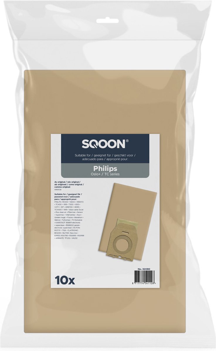 Houd je stofzuiger in topconditie met deze hoogwaardige papieren stofzuigerzakken van SQOON. Deze set van 10 zakken is speciaal ontworpen als vervanging voor het originele model HR6938 en is compatibel met een groot aantal stofzuigers van onder andere Philips, Clatronic, Nilfisk, Friac, Lloyds en Blokker.