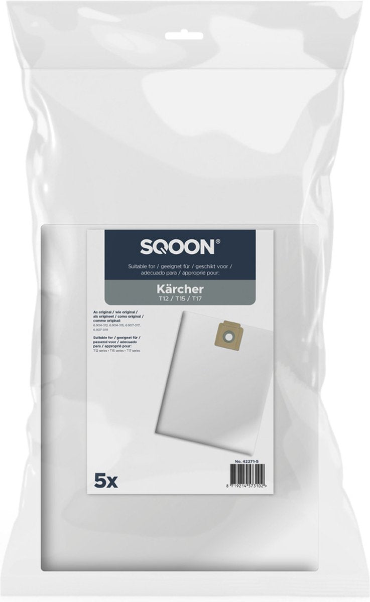 De verpakking bevat 5 stofzuigerzakken die compatibel zijn met diverse Kärcher modellen, waaronder de T12, T15 en T17. Ze zijn gelijkwaardig aan de originele modellen 6.904-312, 6.904-315, 6.907-017 en 6.907-019, waardoor ze een betrouwbaar en voordelig alternatief vormen.