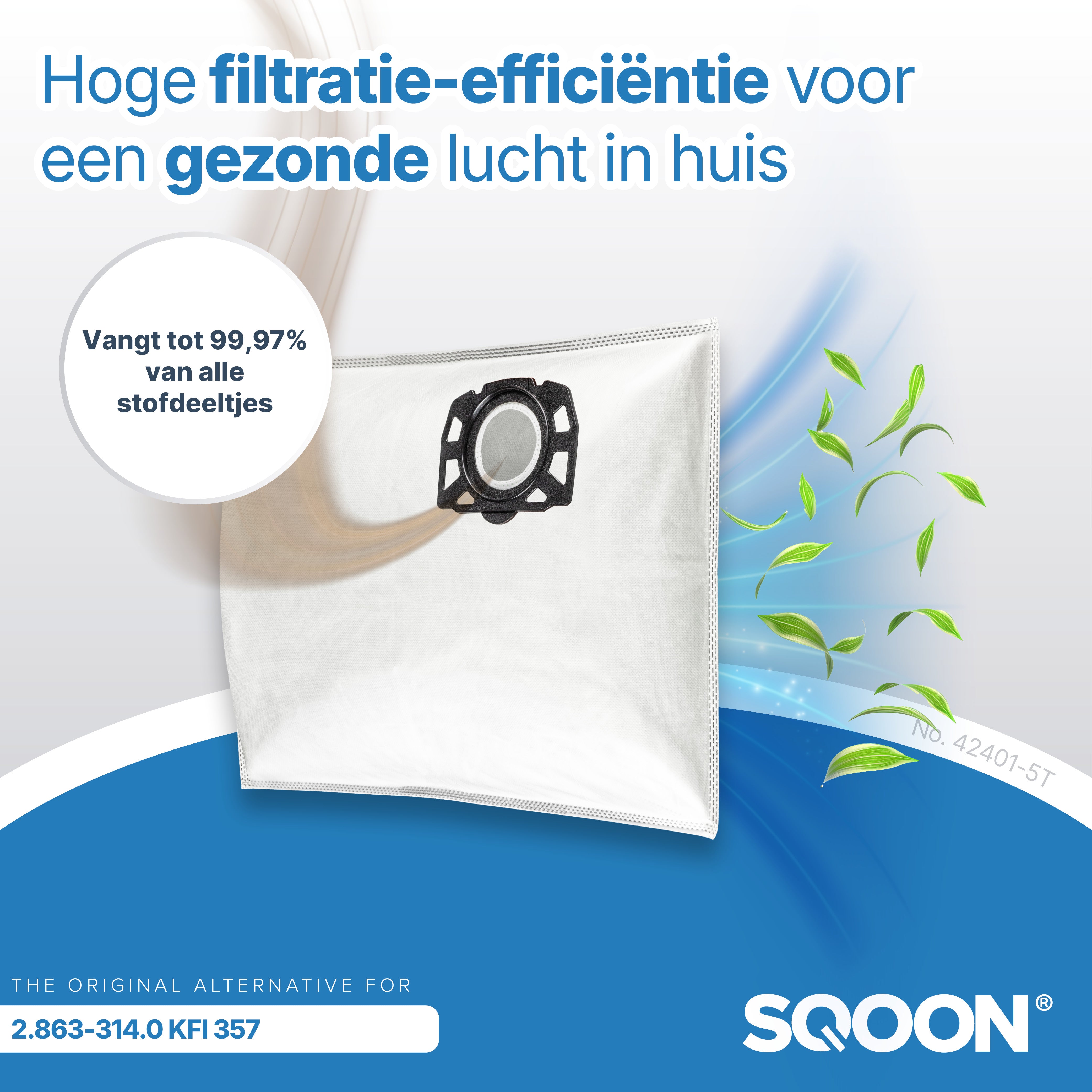 Kies voor de superieure kwaliteit van SQOON® stofzuigerzakken met een meerdere lagen opbouw en ervaar de voordelen van een hoogwaardige stofopvang tijdens het stofzuigen.