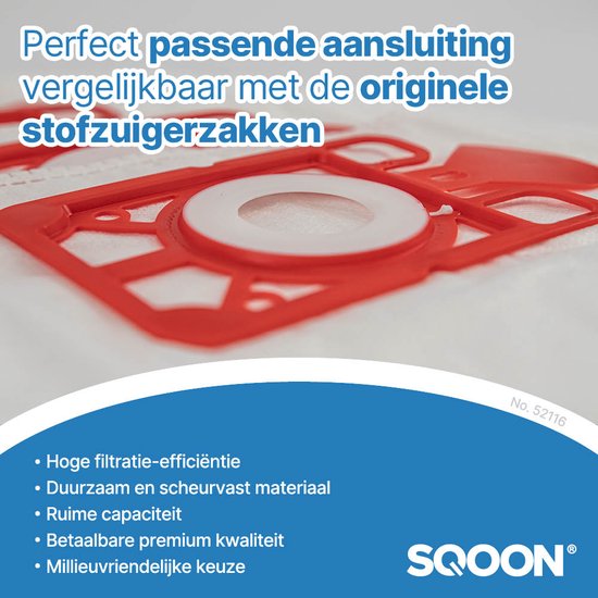 SQOON® stofzuigerzakken worden met precisie vervaardigd, zodat ze perfect passen bij uw stofzuiger. Dit zorgt ervoor dat de zak stevig op zijn plaats blijft en voorkomt luchtlekken, wat essentieel is voor een constante luchtstroom en optimale zuigkracht.