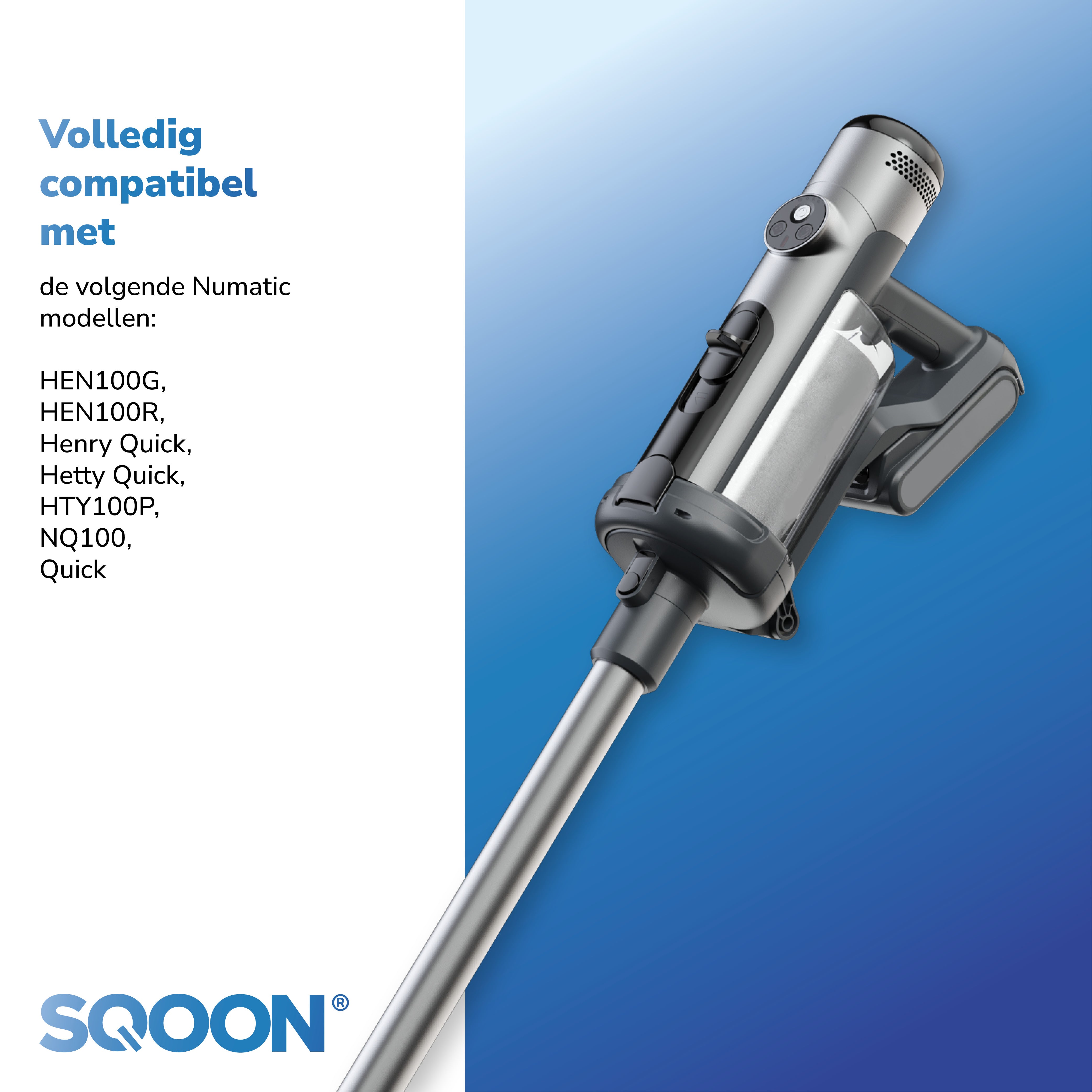 De SQOON® serviceset is volledig compatibel met diverse Numatic modellen, waaronder de populaire Henry en Hetty Quick. Daarnaast vervangt deze set probleemloos de originele onderdelen met nummers 915744 en 915269. Hierdoor ben je verzekerd van optimale veelzijdigheid en gebruiksgemak, zonder dat je je zorgen hoeft te maken over de pasvorm of kwaliteit.
