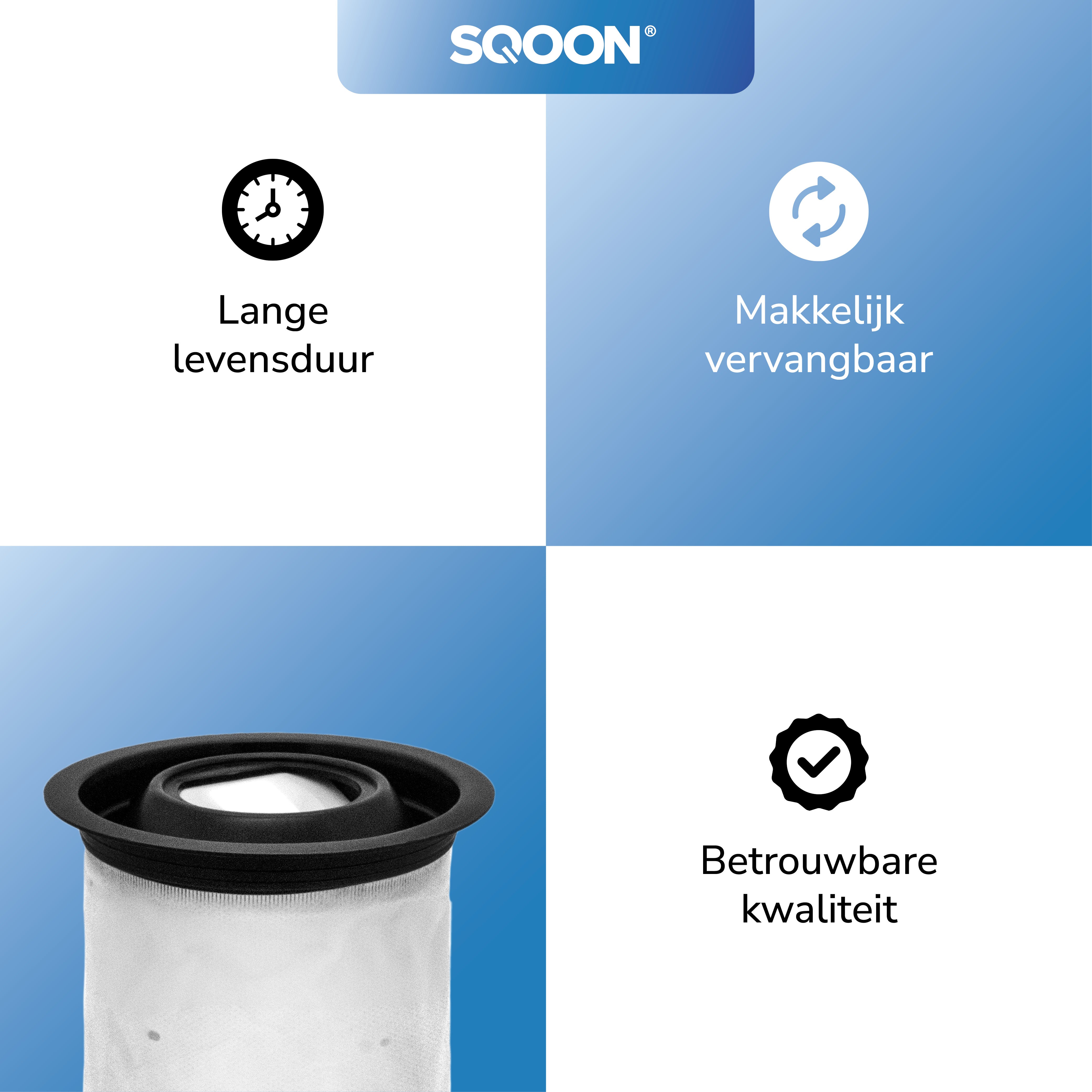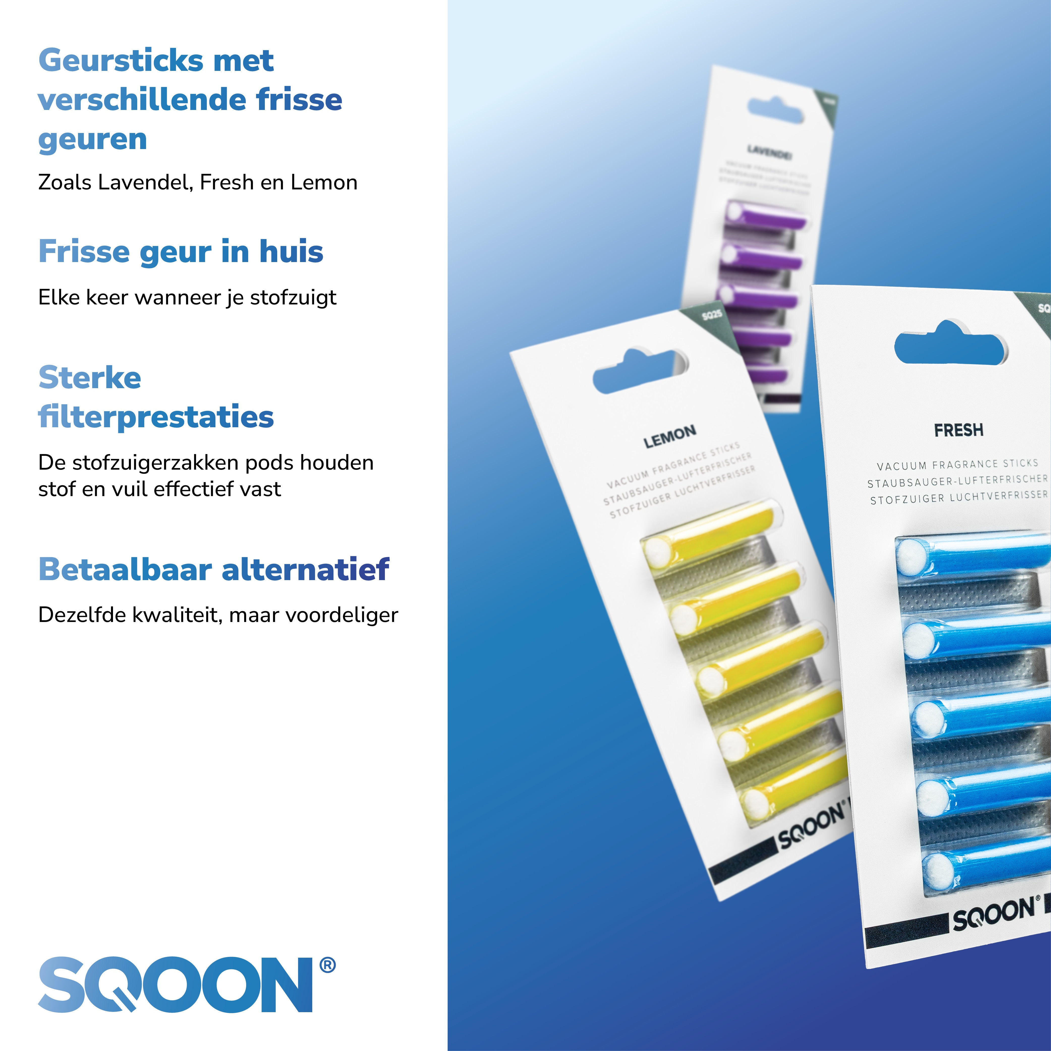 Met SQOON® geef je je Numatic stofzuiger een echte opfrisbeurt. De combinatie van duurzame zakken en verfrissende geurstaafjes zorgt niet alleen voor betere prestaties, maar ook voor een aangenamere schoonmaakervaring. Zo haal je het maximale uit je stofzuiger en geniet je langer van een fris en schoon huis.