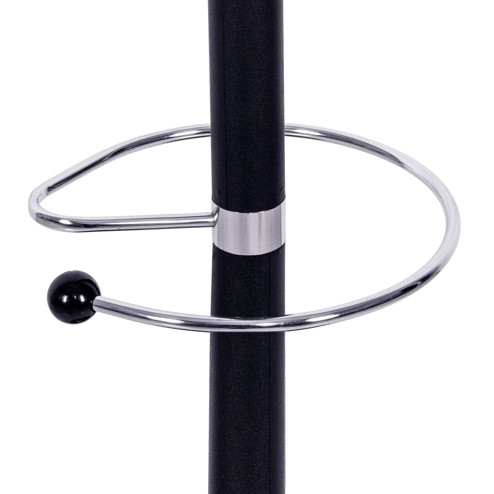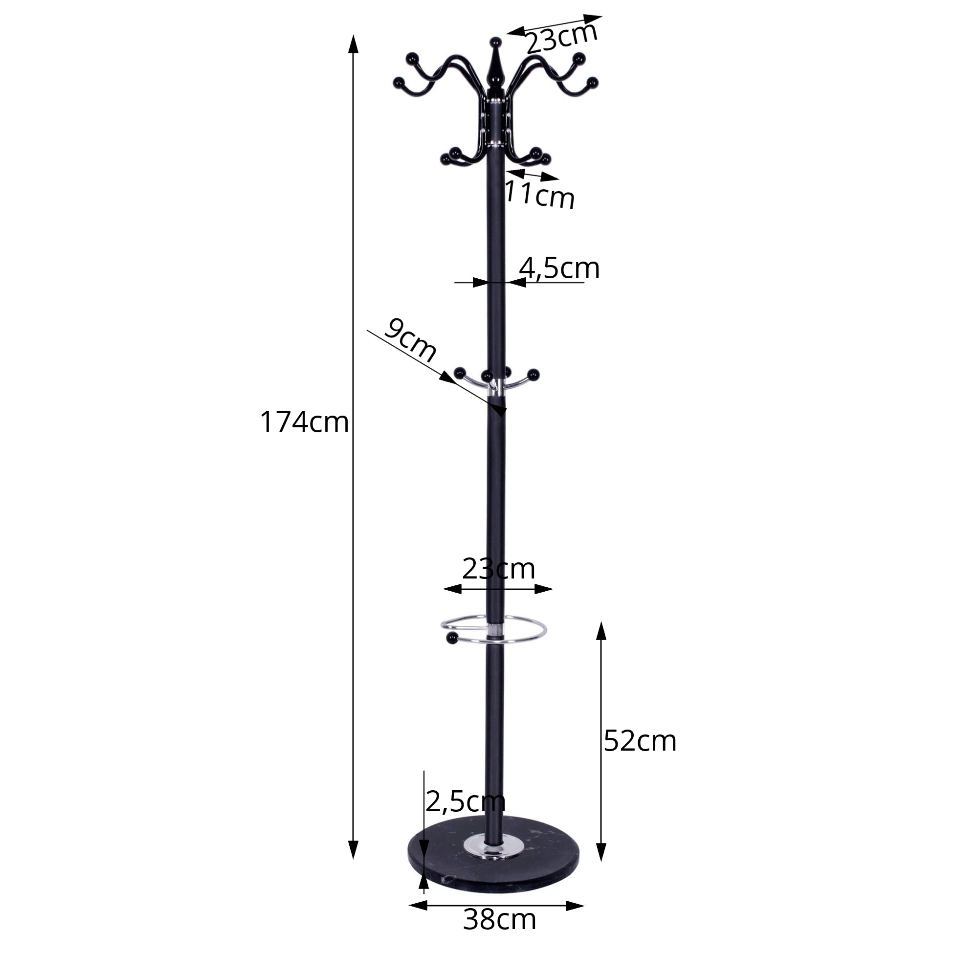 Kleur en materiaal: Een stevig metalen frame in matzwart met glanzend zwarte haken, aangevuld met een duurzame voet van natuurlijk zwart marmer.