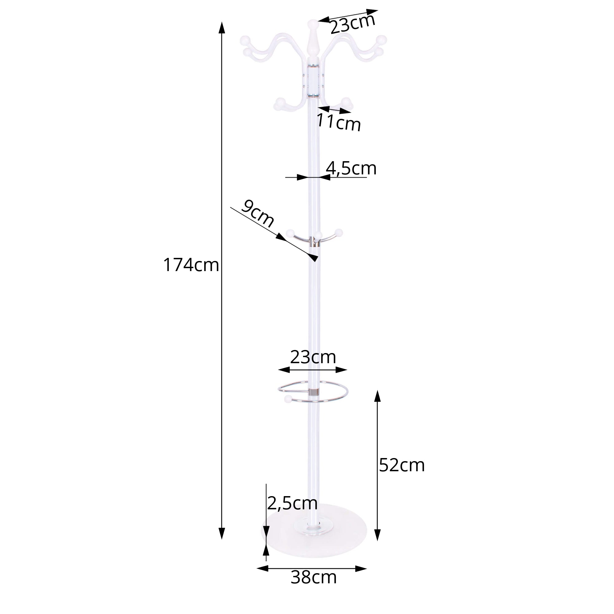 Het statief, met een hoogte van 2,5 cm, biedt een stevige ondersteuning, terwijl de hoogte tot de paraplusteun van 52 cm extra gemak biedt voor het opbergen van je paraplu's. De armen van de kapstok, met een lengte van respectievelijk 23 cm en 11 cm, bieden voldoende ruimte voor het ophangen van jassen, tassen en accessoires.