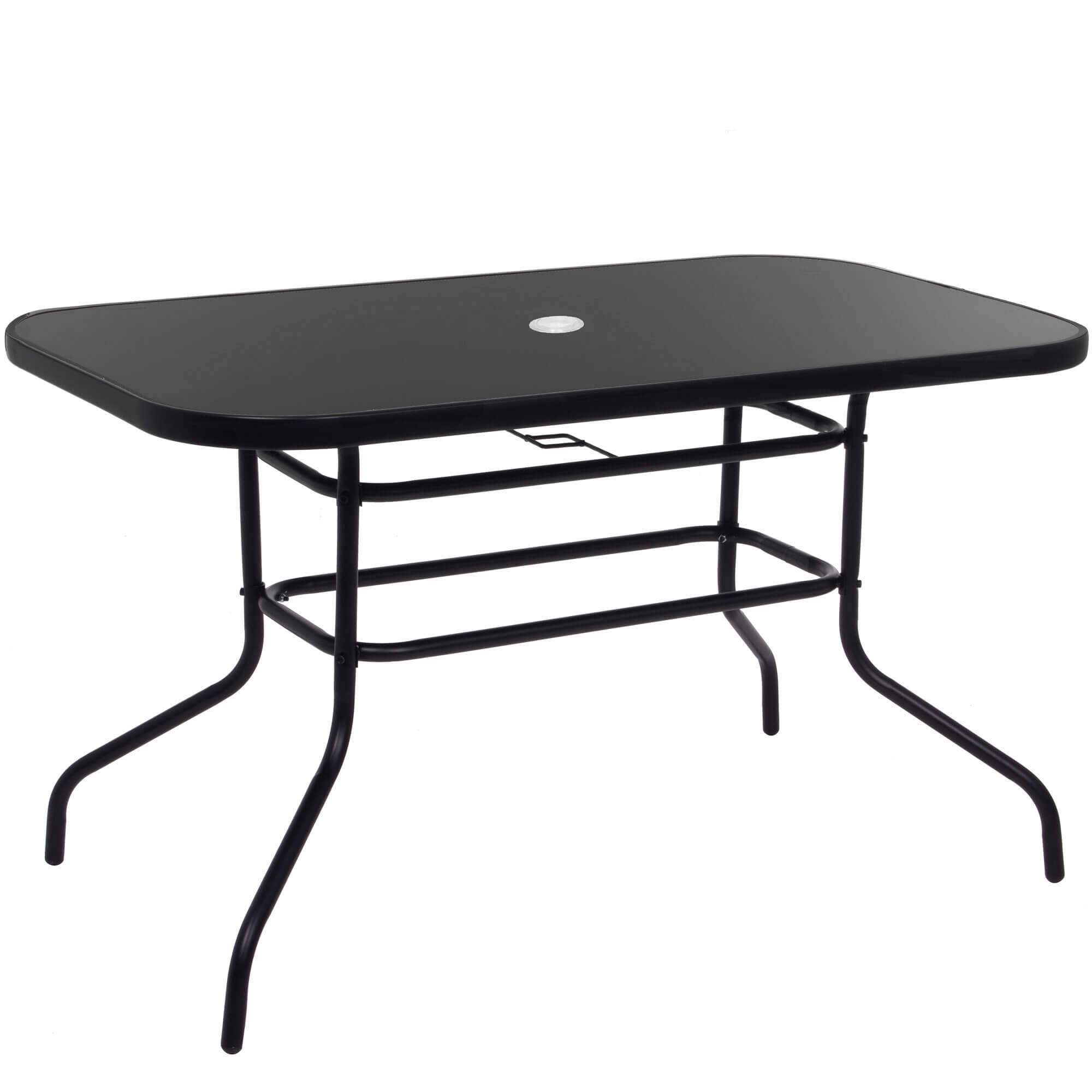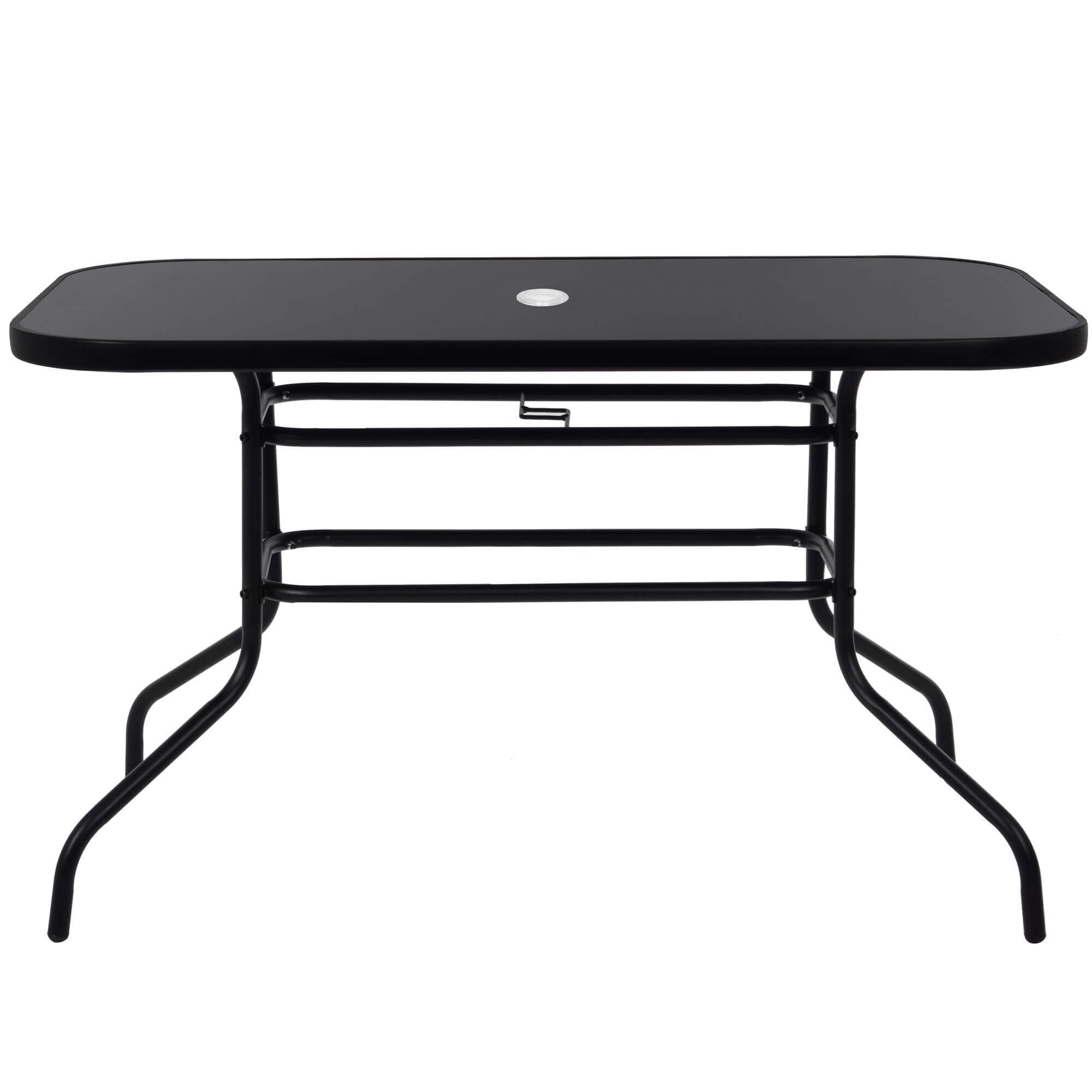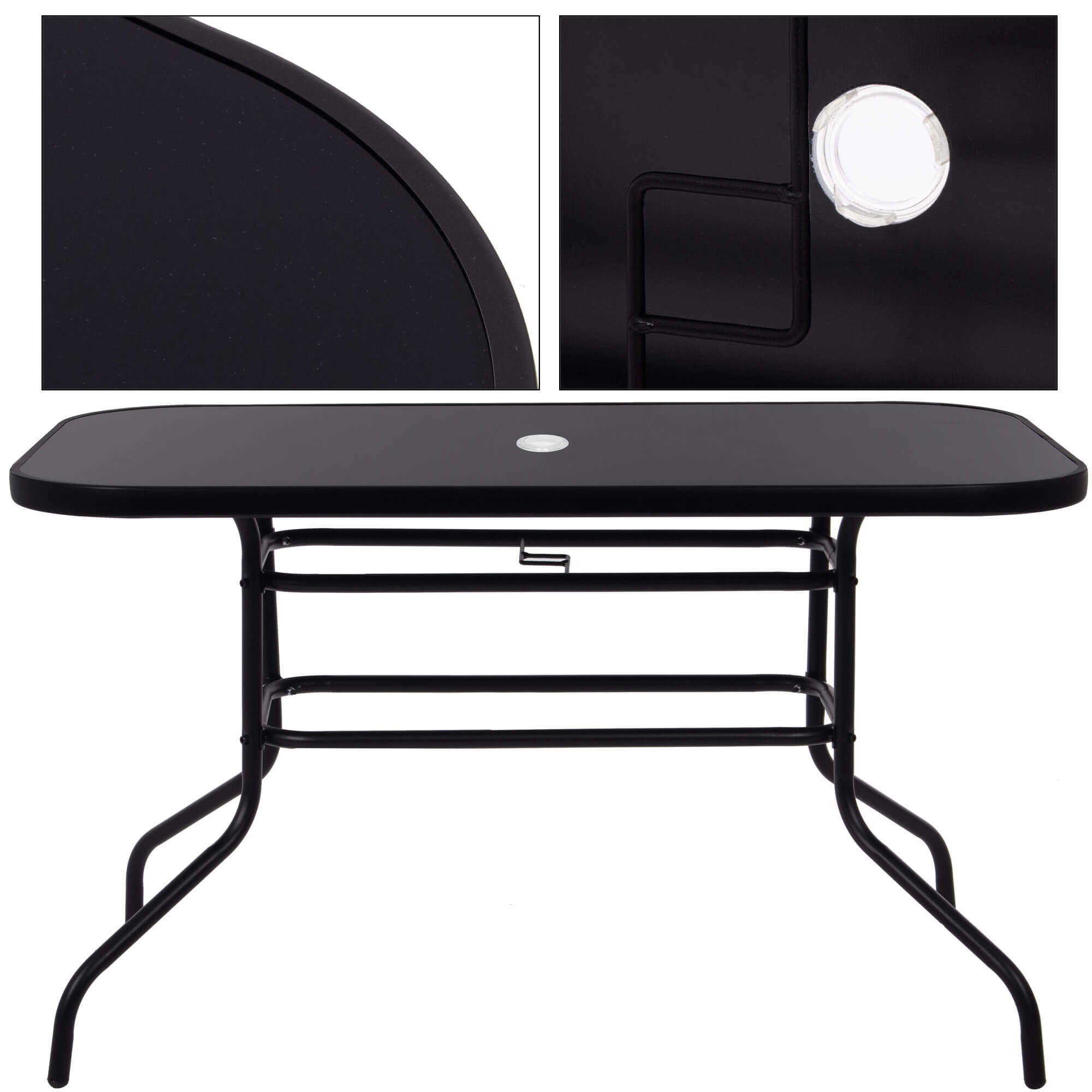 Het tafelblad bestaat uit donker gehard glas, wat niet alleen elegantie toevoegt maar ook de veiligheid verhoogt. Gehard glas is aanzienlijk sterker dan traditioneel glas en eventuele scherven zijn minder scherp, waardoor het risico op letsel minimaal is. De afgeronde randen en het dikke frame van het blad dragen bij aan de veiligheid, vooral in huishoudens met kinderen. Een belangrijk voordeel van deze tafel is het gemak van schoonmaken. Het gladde oppervlak van het geharde glas maakt een snelle en effectieve reiniging mogelijk, wat cruciaal is voor buitenmeubilair. Bovendien is er ruimte voor een parasol, waardoor de tafel nog functioneler wordt op warme, zonnige dagen, waar bescherming tegen de zon nodig is.