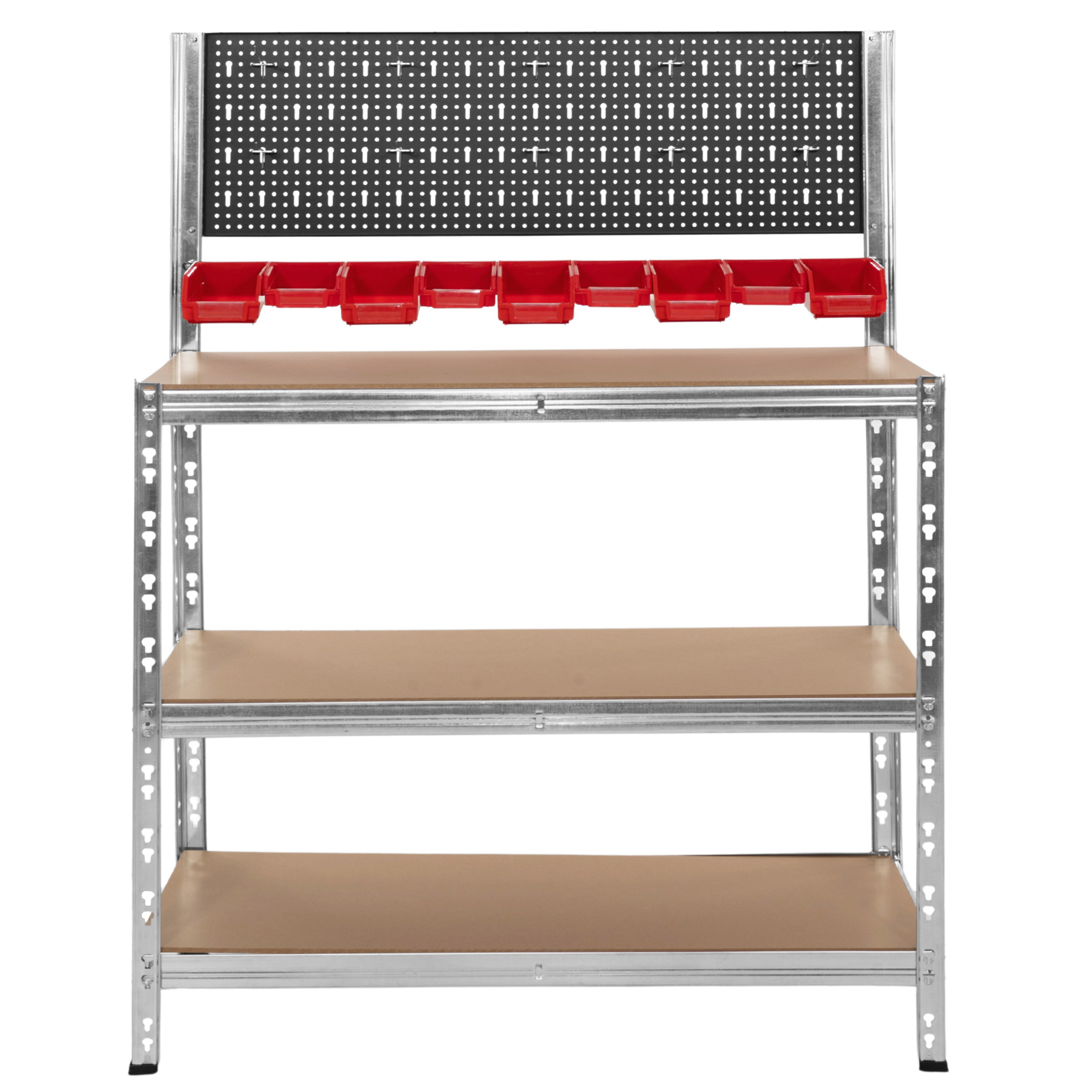 Het royale werkblad biedt voldoende ruimte om met gereedschap en materialen te werken. Of je nu aan het sleutelen, zagen of monteren bent – je beschikt altijd over een comfortabele en stabiele ondergrond.